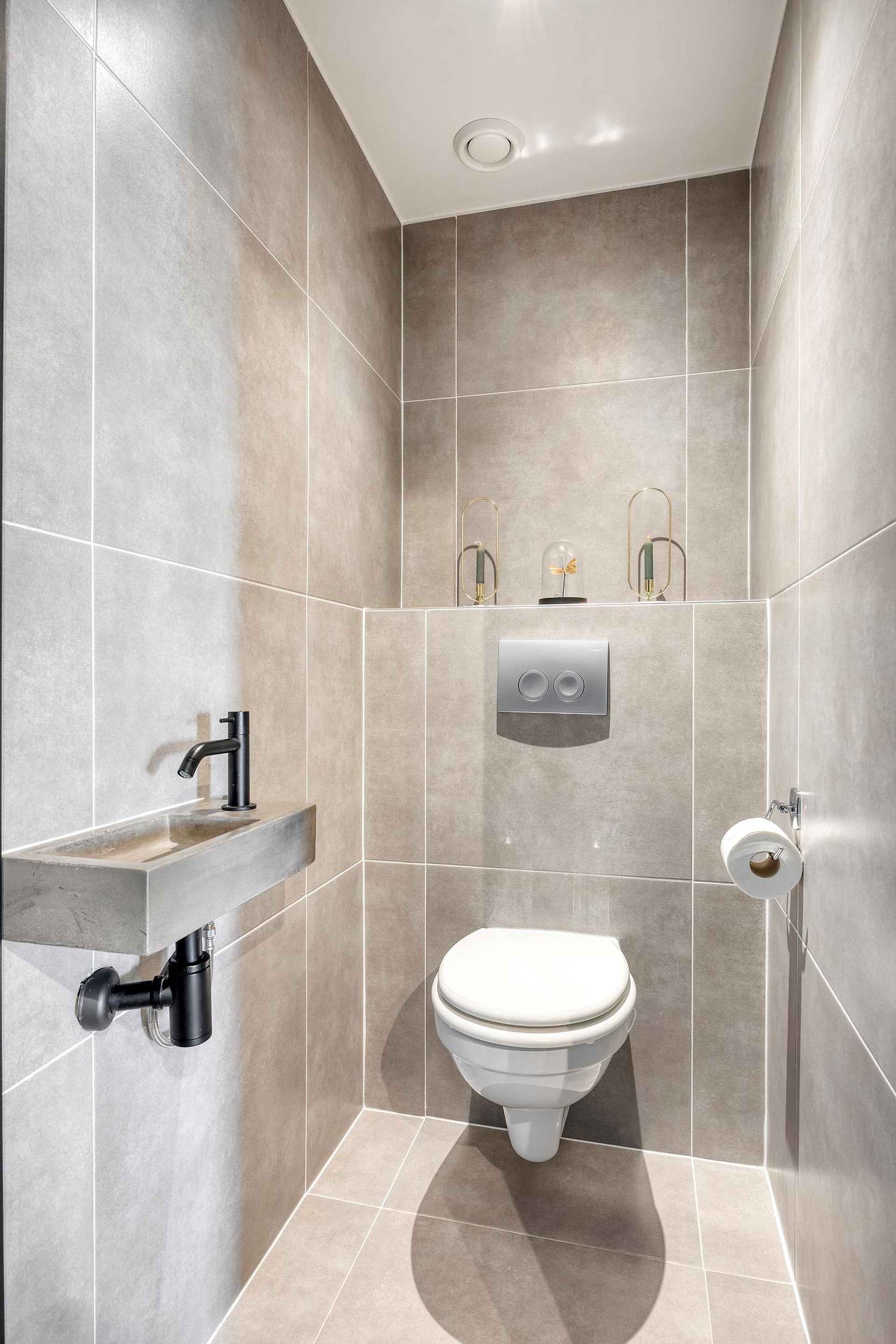 Toilet, welke geheel is betegeld, en voorzien van een hangend closet, een fonteintje en mechanische ventilatie.