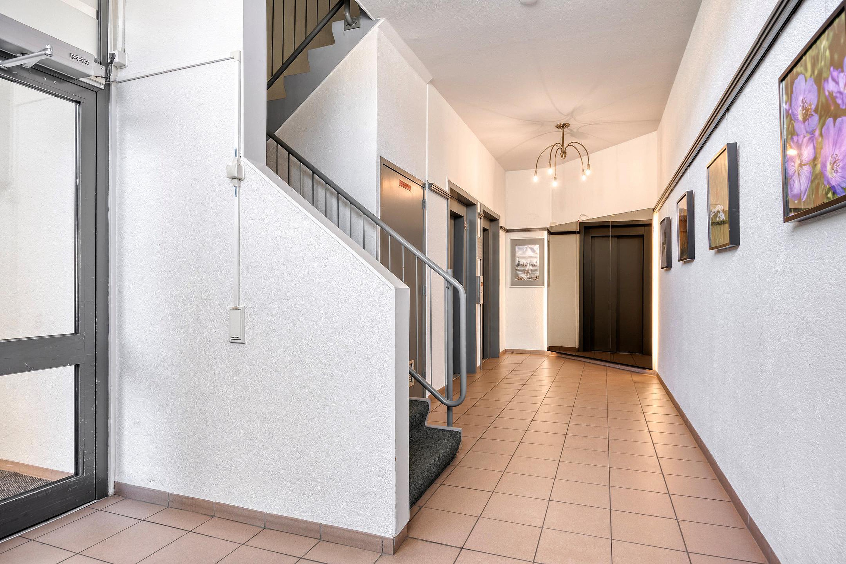 Afgesloten entree met brievenbussen, bellentableau met videofoon en toegang tot het trappenhuis en de dubbele liftinstallatie.