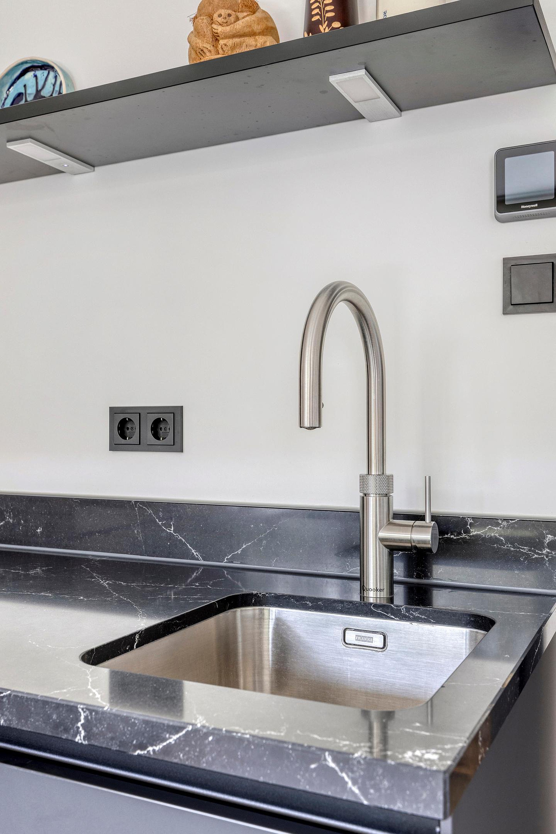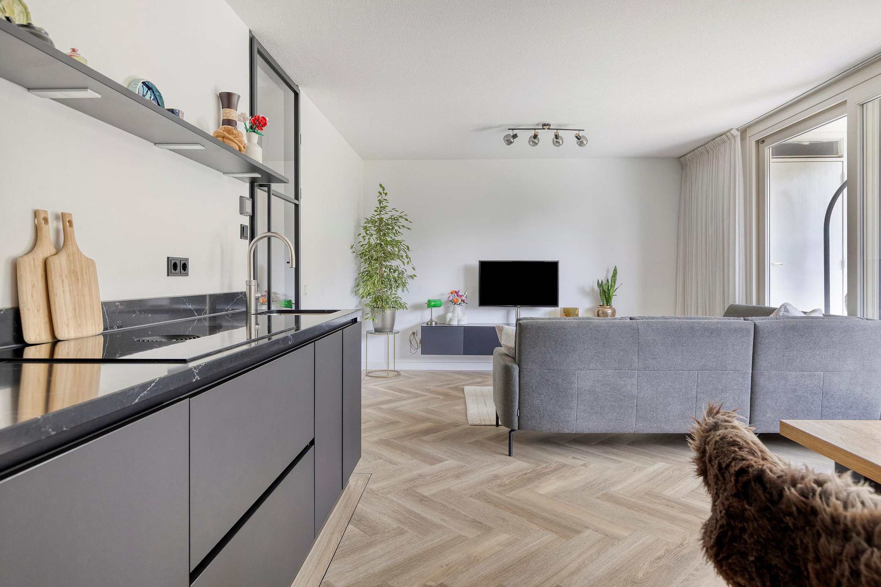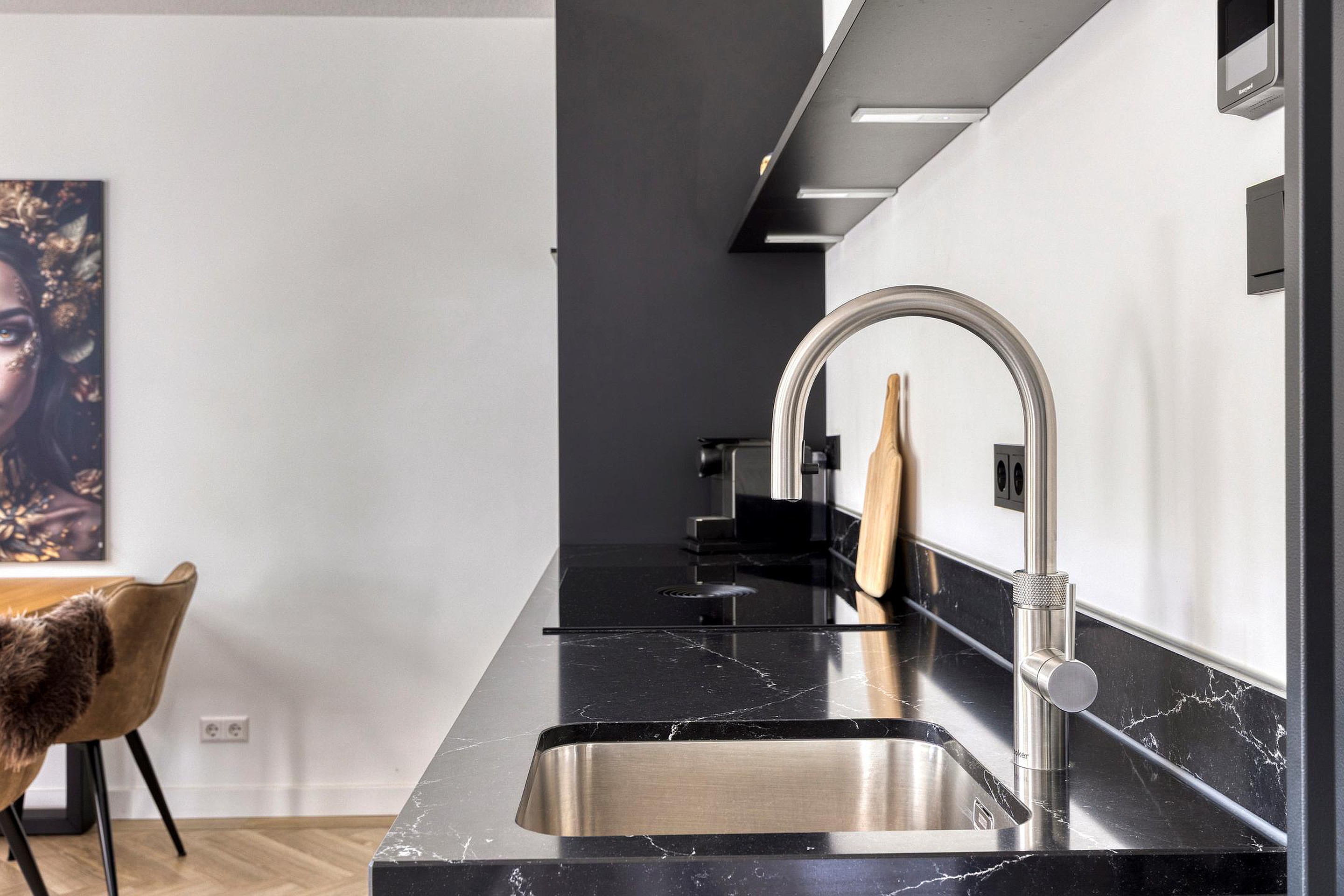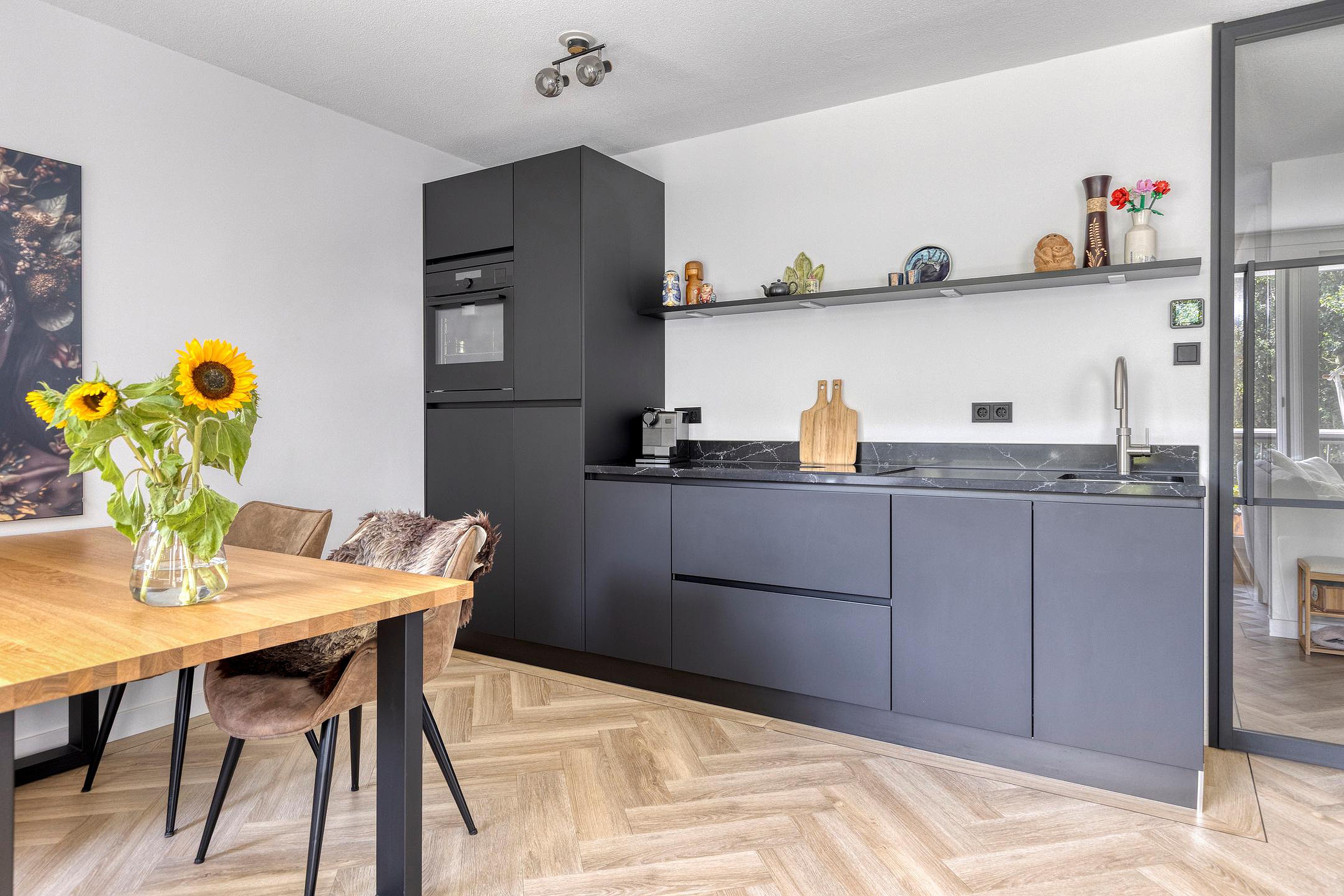 De woonkamer, met het fantastische uitzicht, alleen hier voor wil je hier al wonen. De open keuken voorzien van alle luxe ( o.a. een Quooker ) met een composiet aanrechtblad, in een strakke en moderne zwarte opstelling.