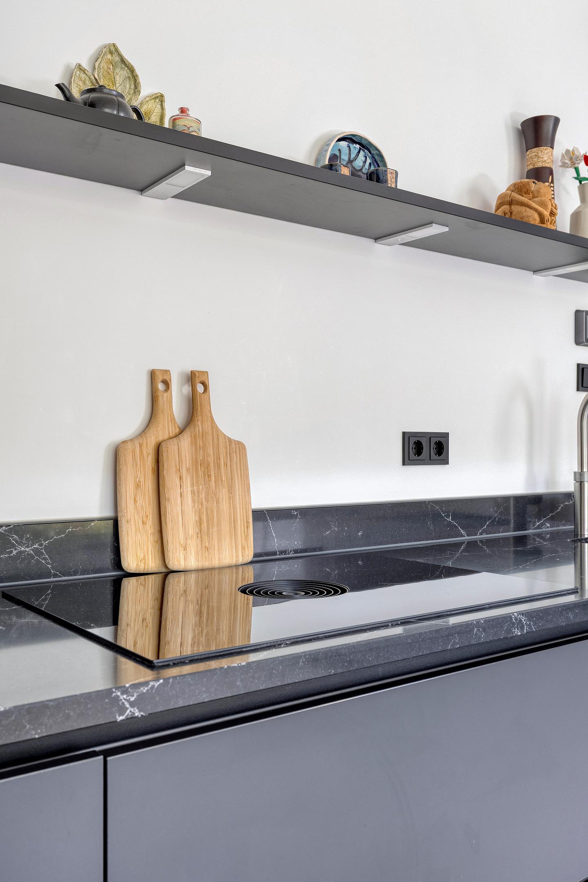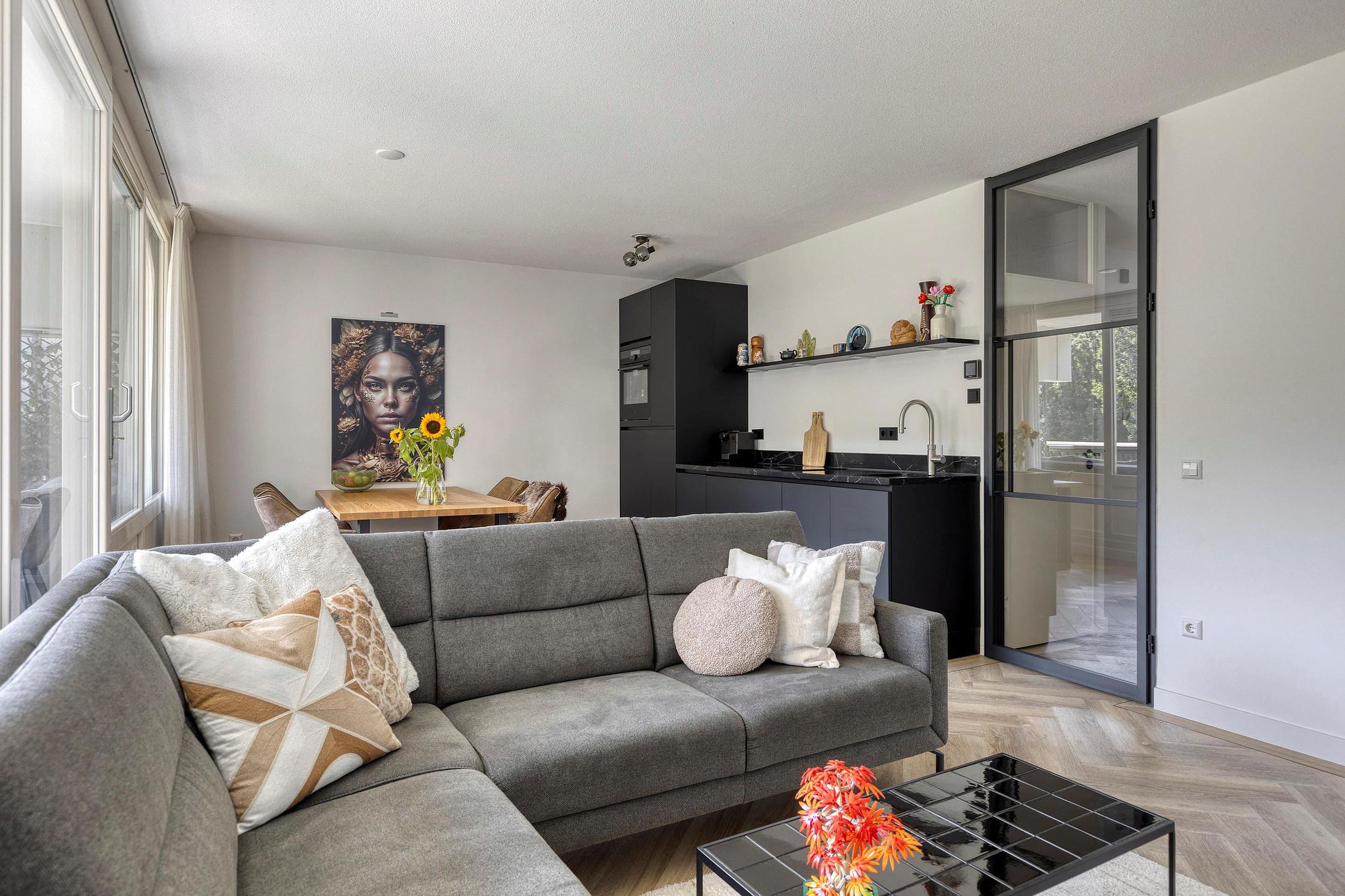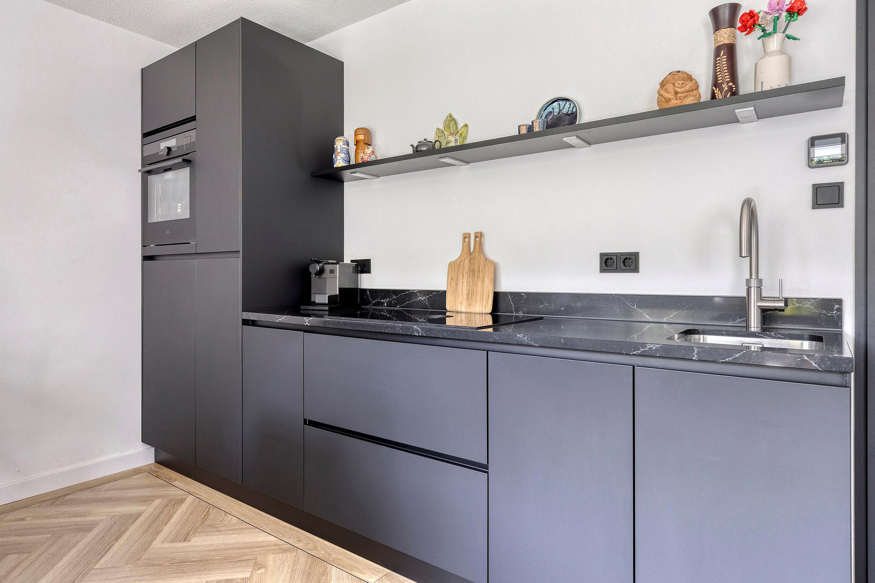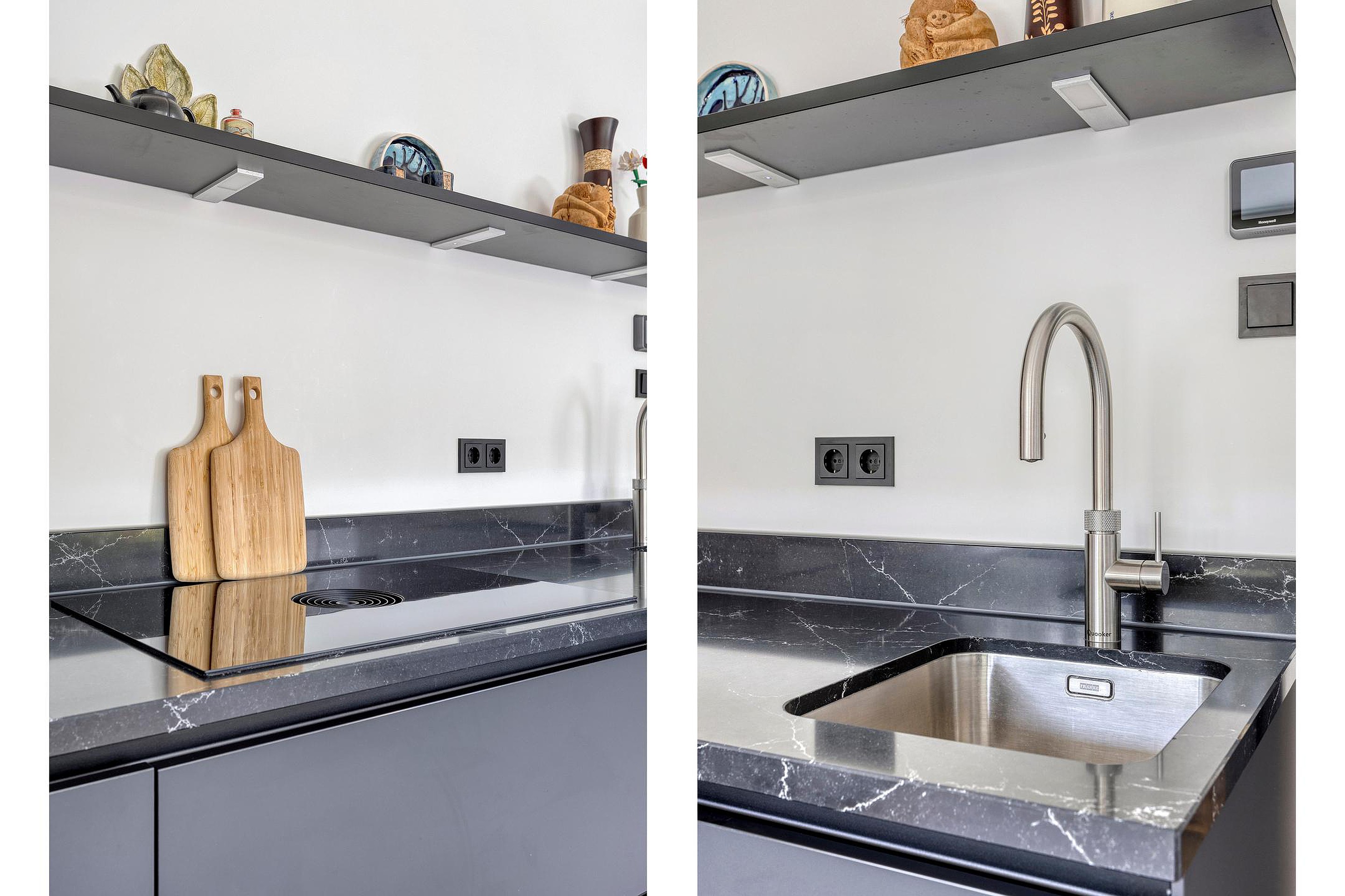 De woonkamer, met het fantastische uitzicht, alleen hier voor wil je hier al wonen. De open keuken voorzien van alle luxe ( o.a. een Quooker ) met een composiet aanrechtblad, in een strakke en moderne zwarte opstelling.