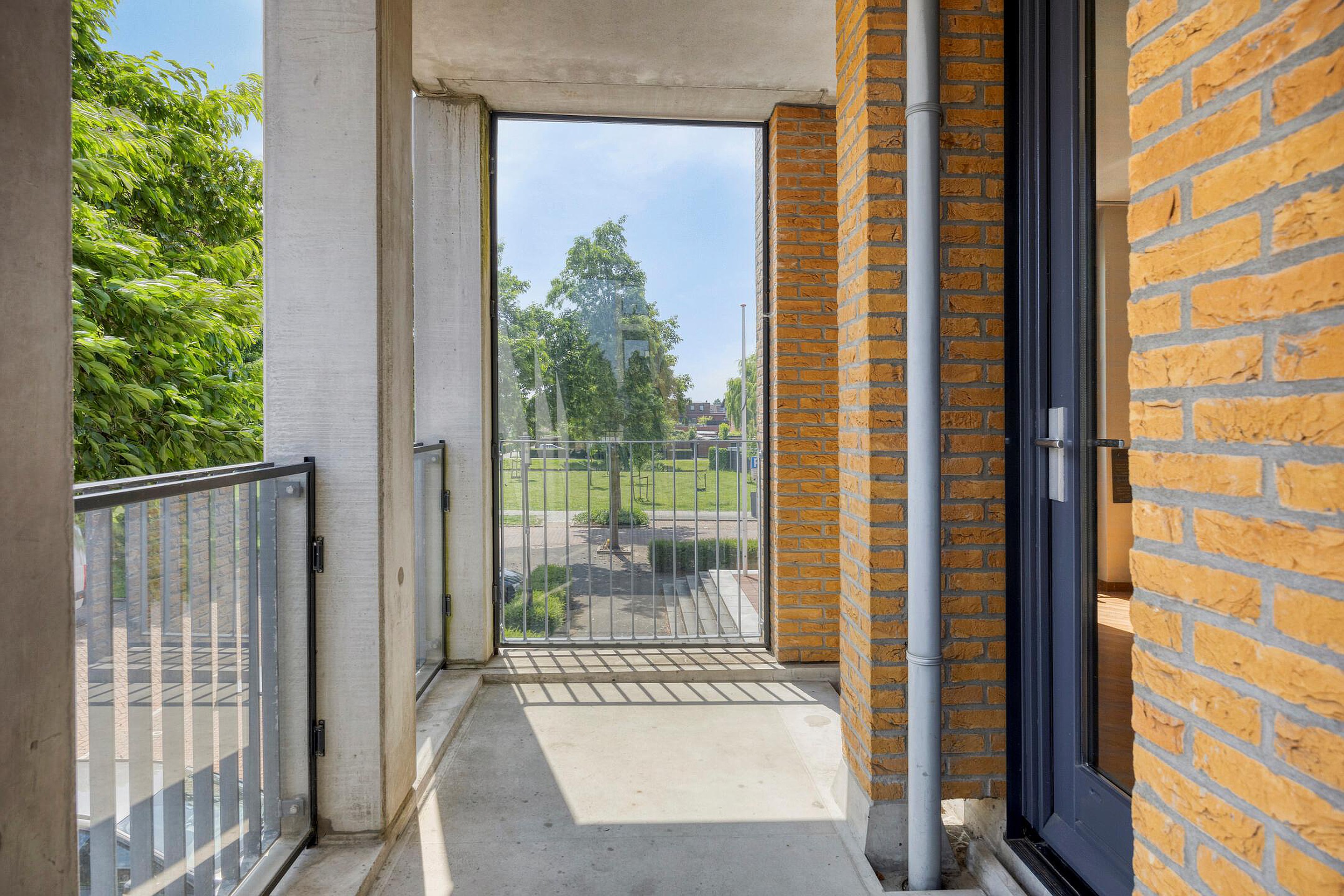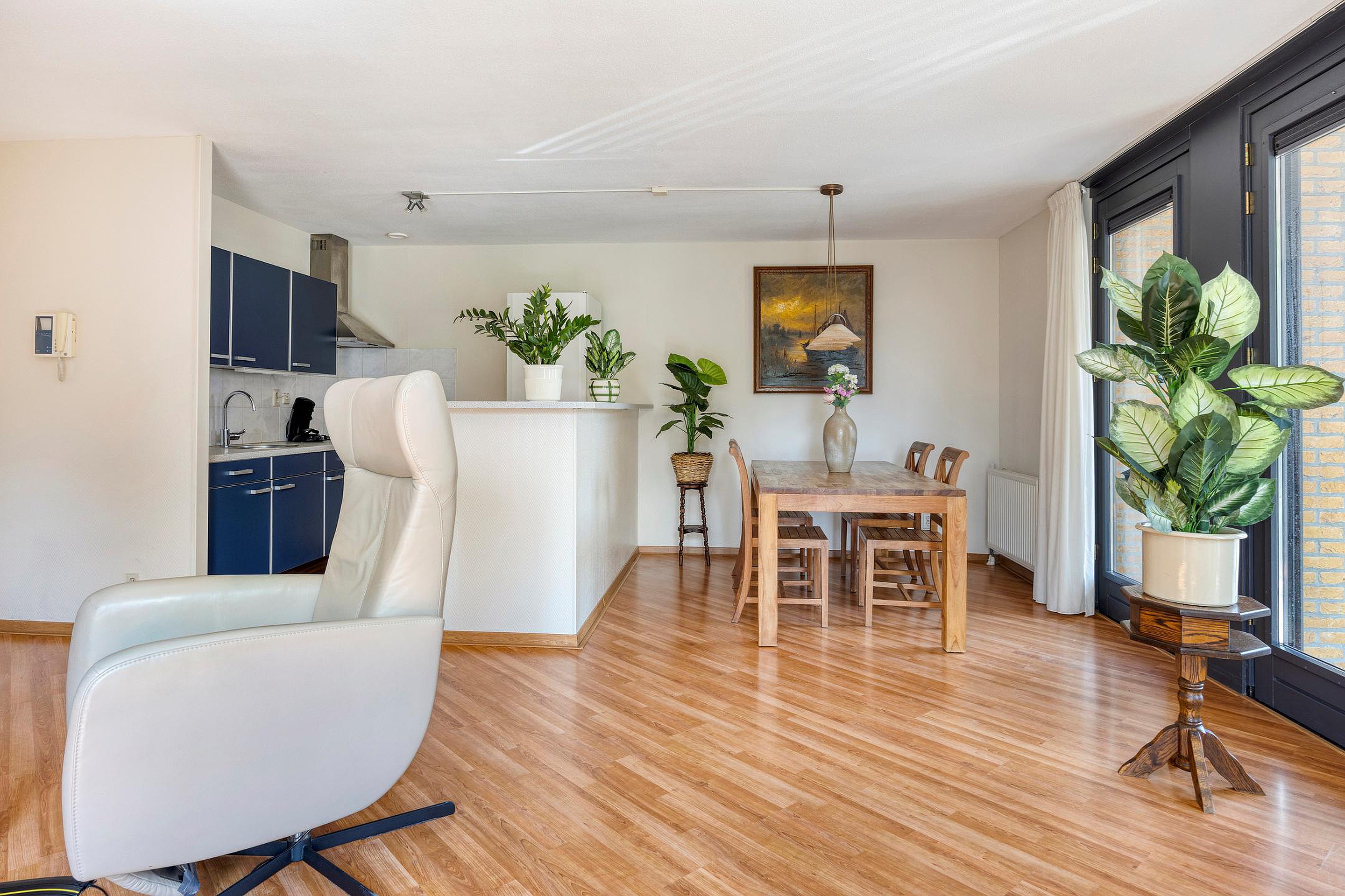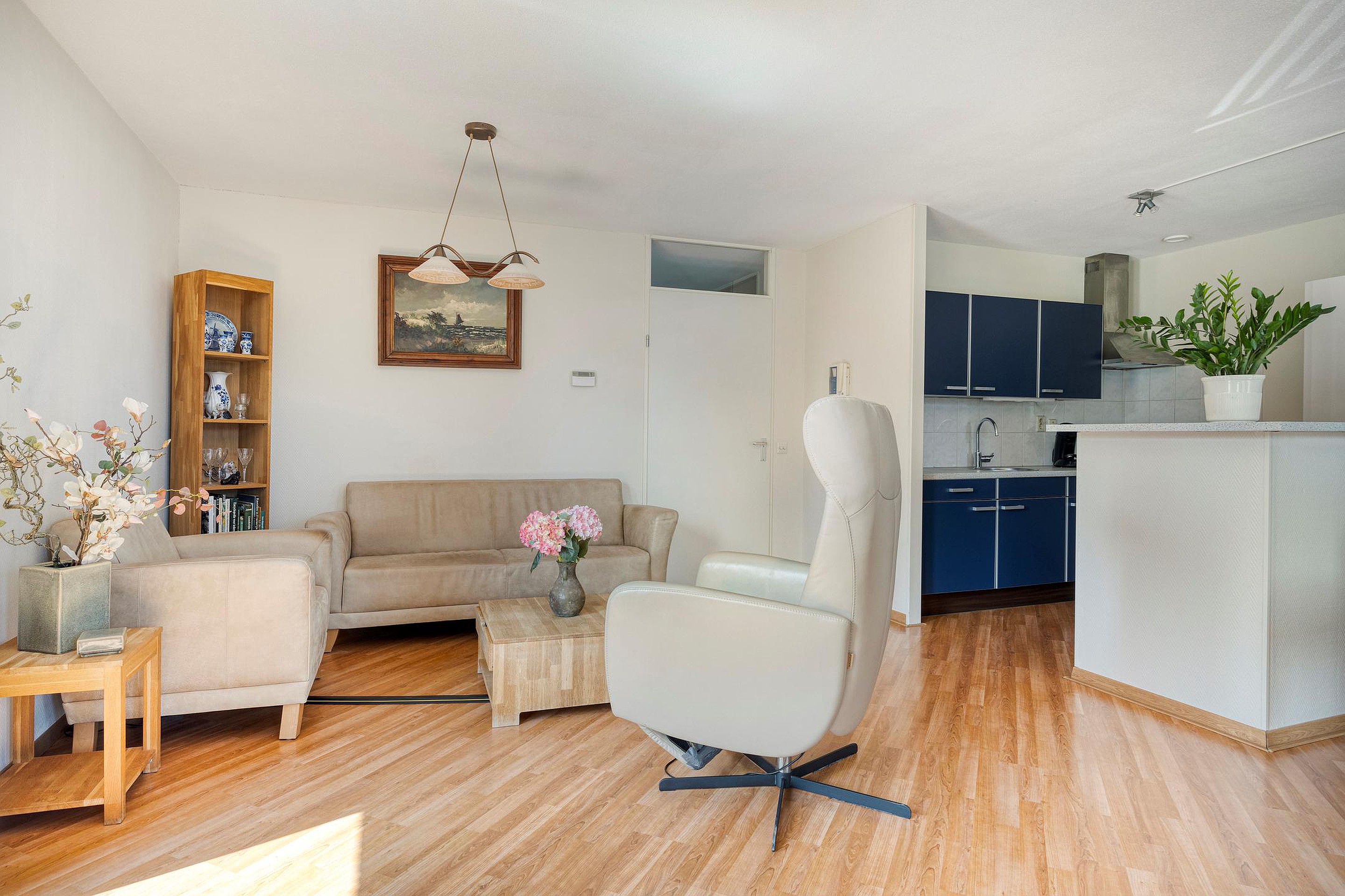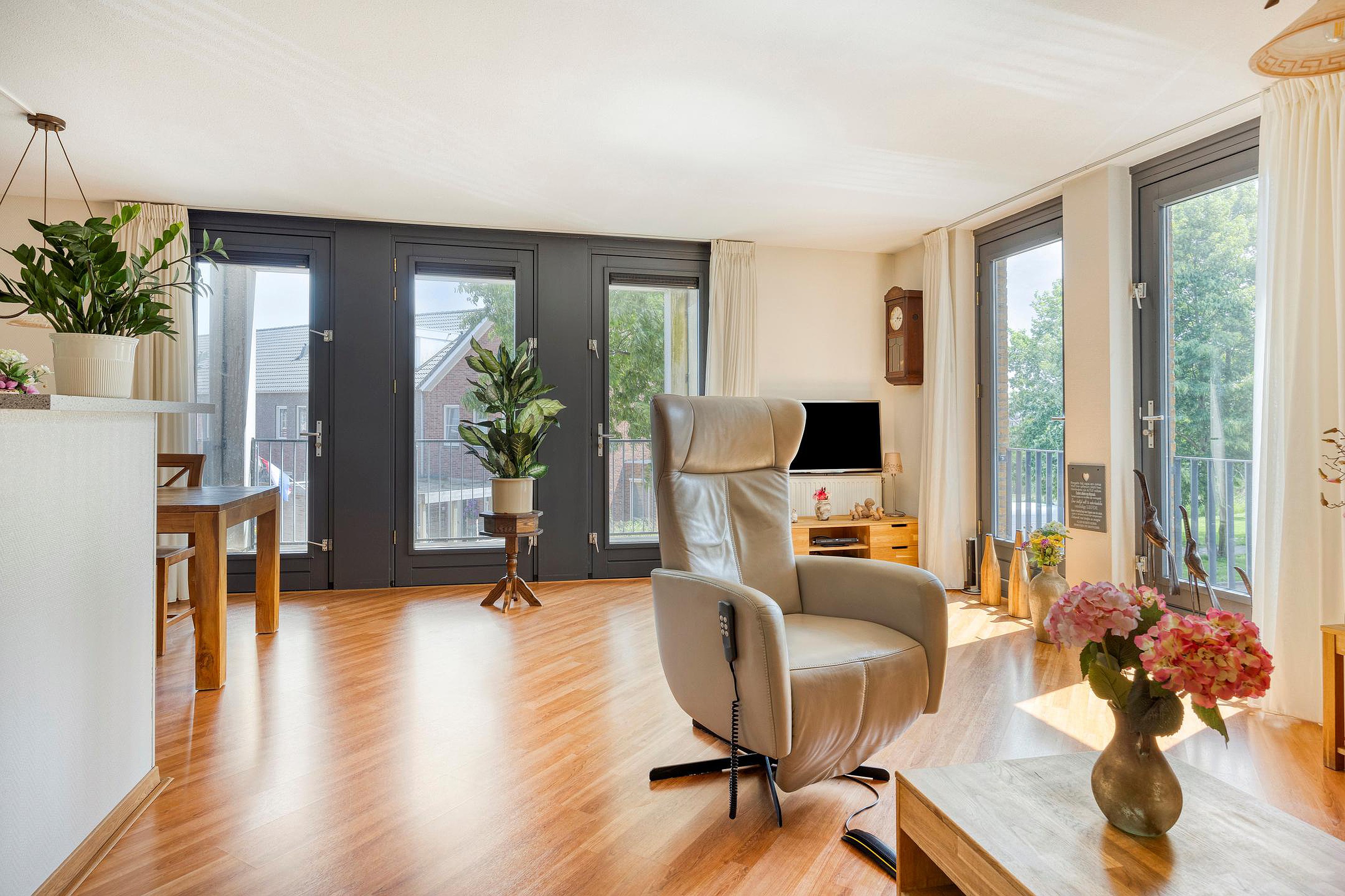 De achtergelegen woonkamer is licht door de vele raampartijen en heeft Franse balkons in de zijgevel. De woonkamer grenst aan het zonnige balkon, gelegen op het zuidoosten. Het balkon is voorzien van een aantal glaspanelen, waardoor je hier heerlijk beschut kan zitten.