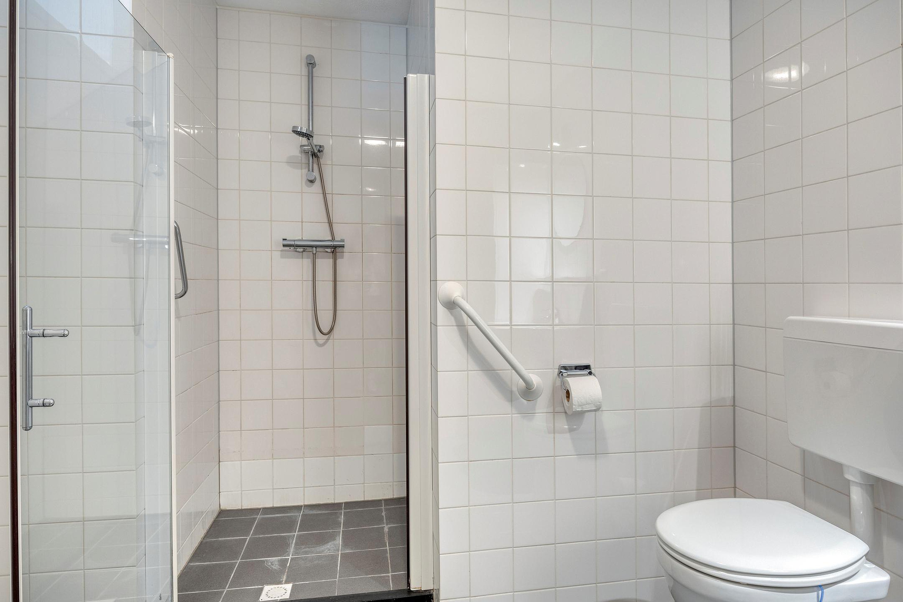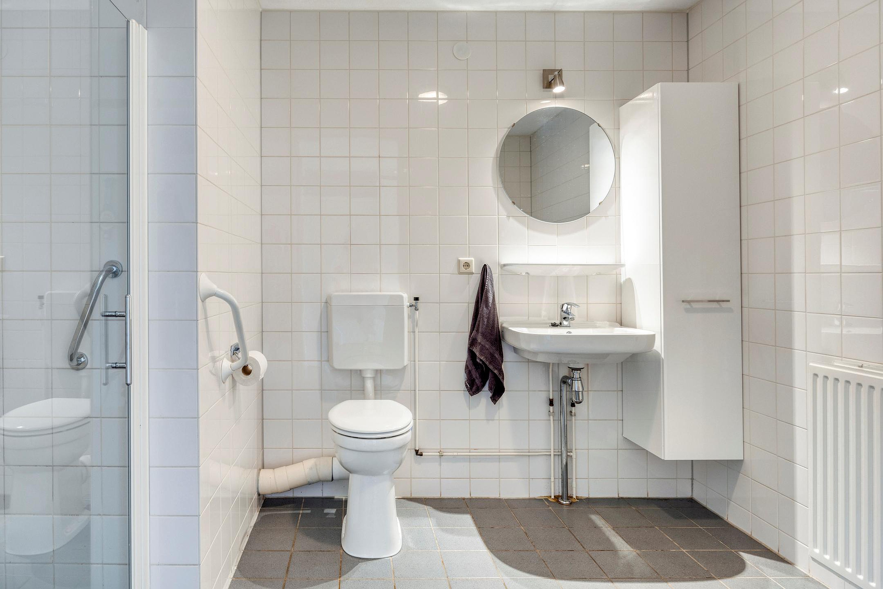 Tussengelegen is de badkamer. Deze is geheel betegeld en voorzien van een douche met glazen wand, wastafel, legkast, staand toilet, verwarming en een wasmachine-aansluiting.