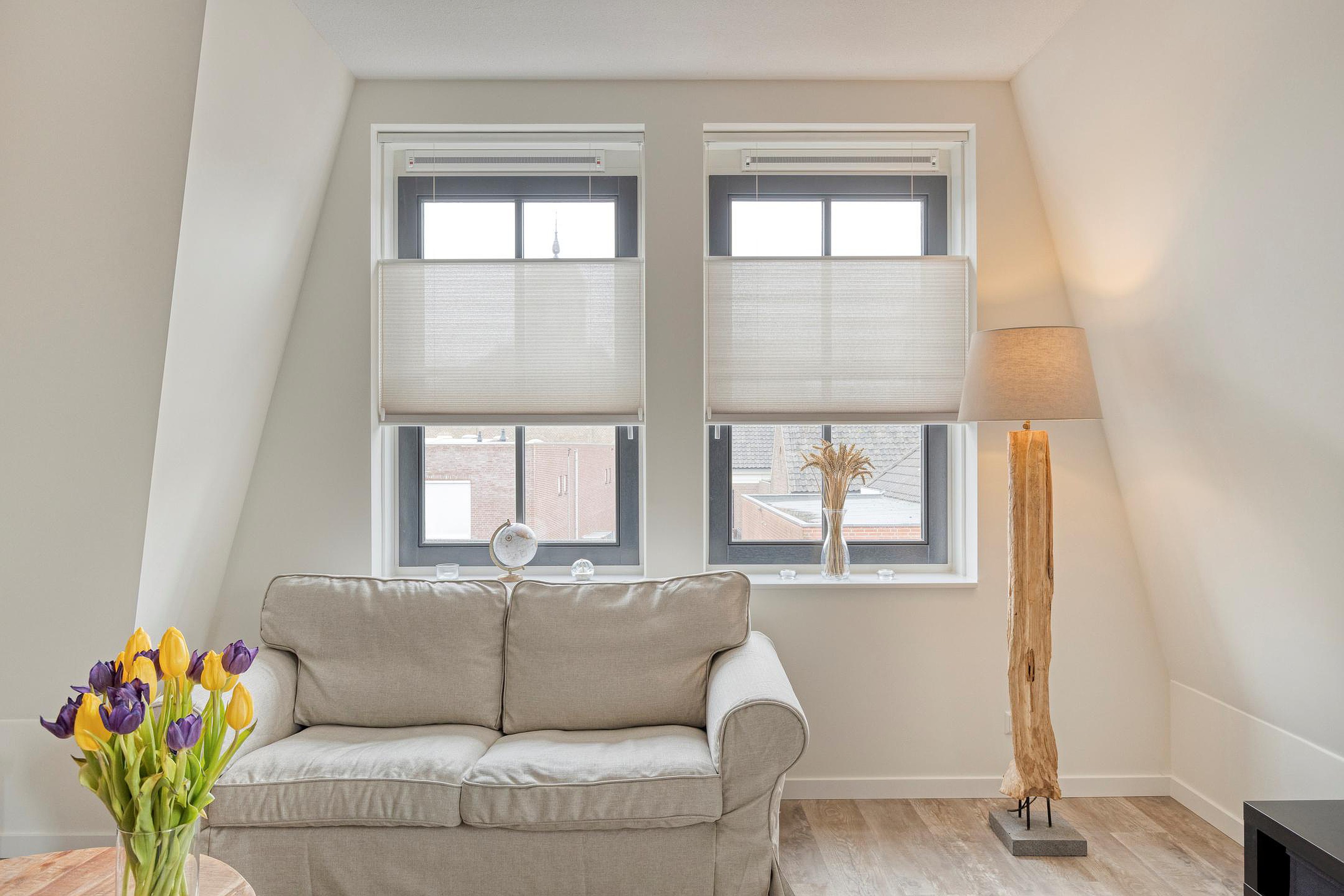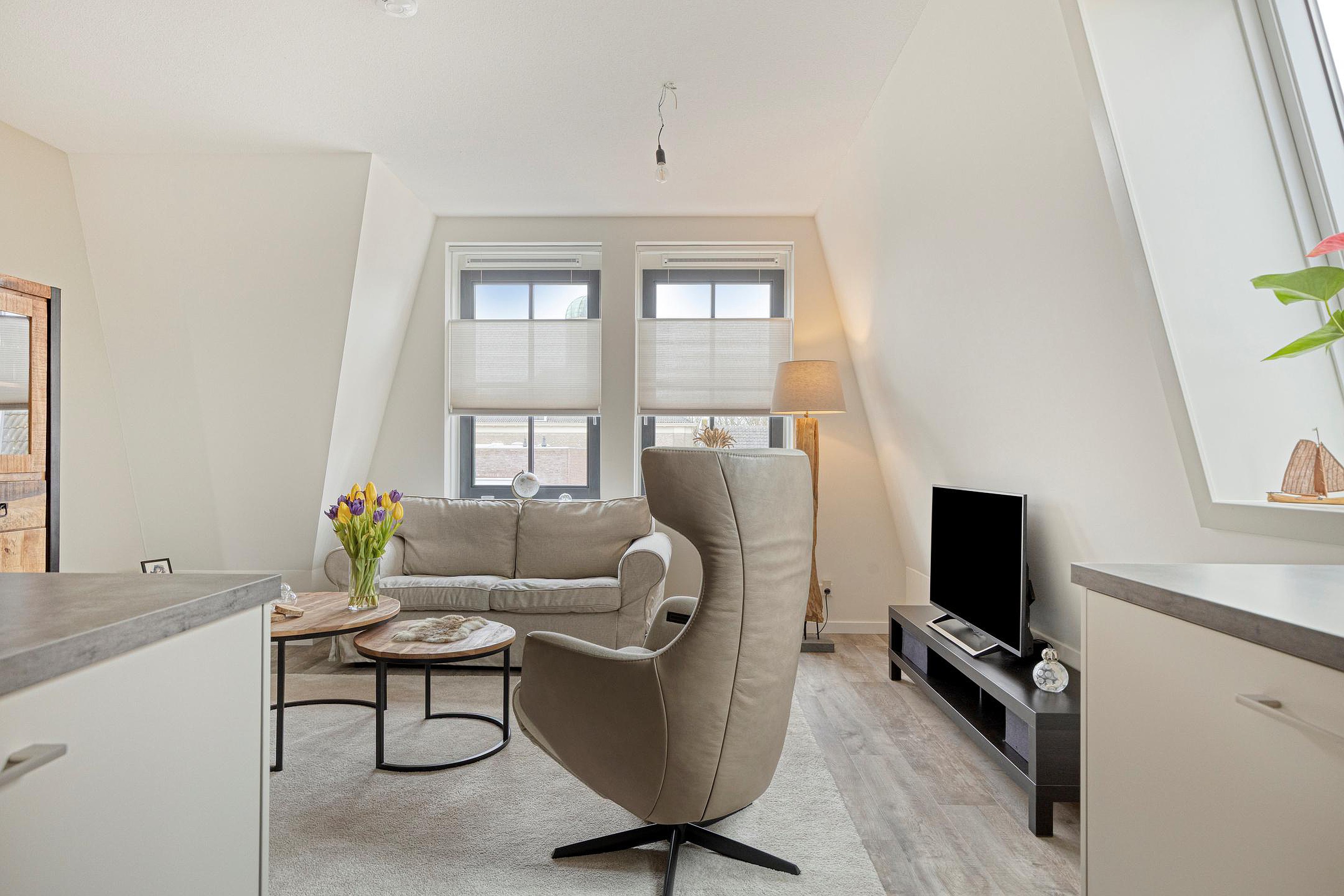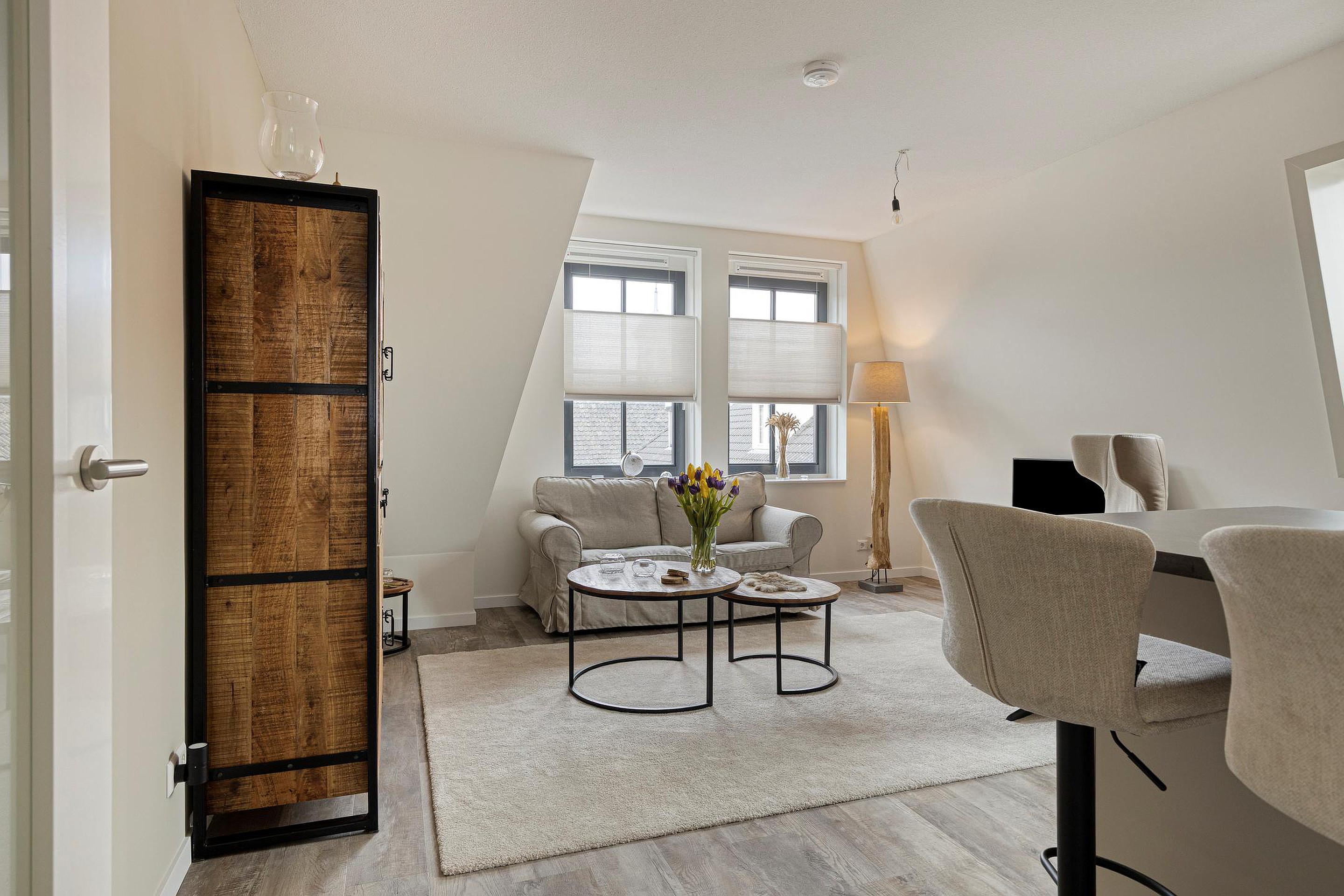 Bij binnenkomst zien we meteen de mooie pvc vloer die in het hele appartement ligt. We lopen de lange hal eerst helemaal door naar de woonkamer met open keuken. De woonkamer is een fijne ruimte met een mooie lichtinval door de ramen in de voorgevel en het dakraam. Door een slimme indeling van de keuken met barretje, blijft er genoeg plaats voor een ruime ruime zithoek over.