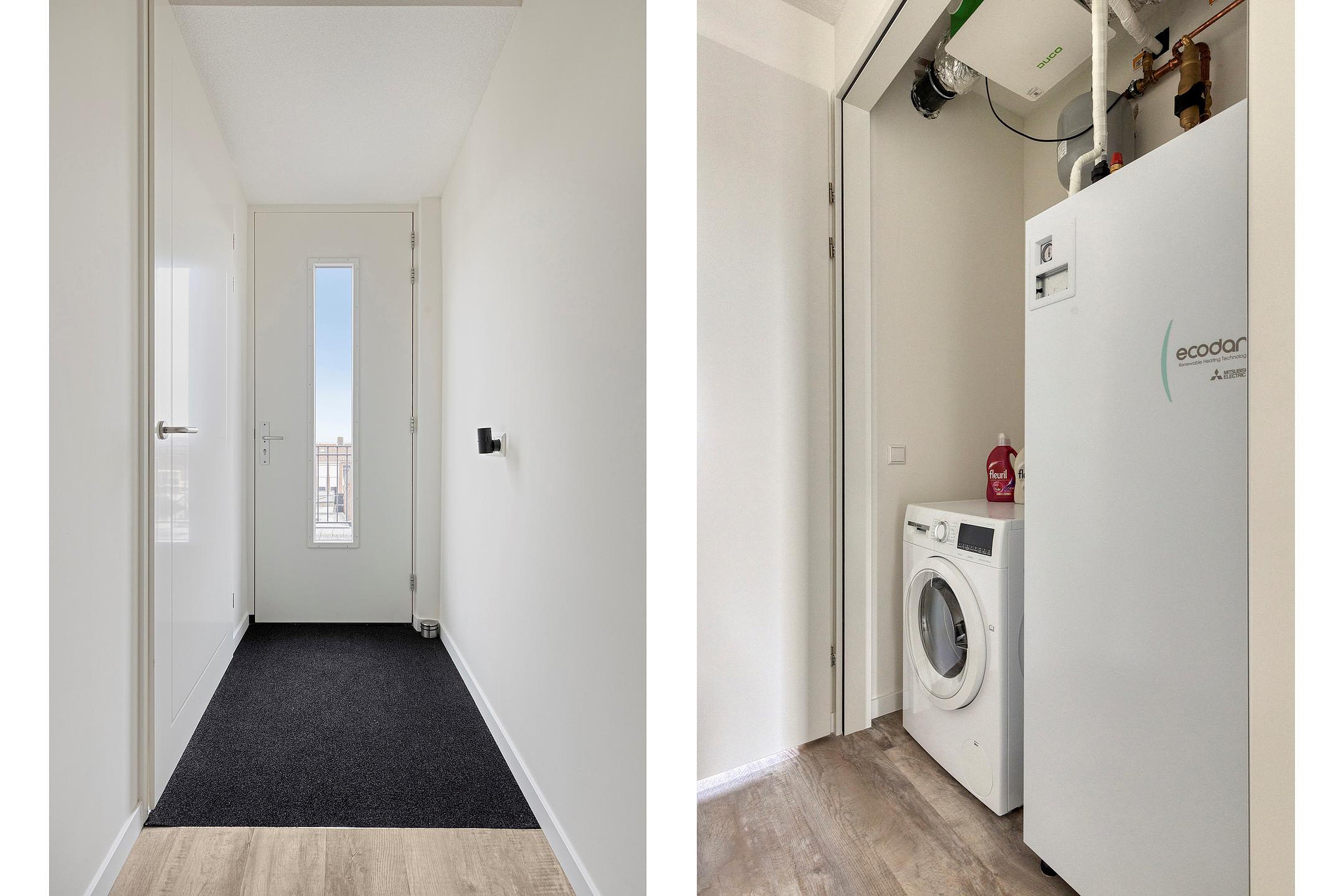Tot slot komen we bij de technische ruimte. Hier is - naast de wasmachine aansluiting - de mechanische ventilatie unit, de ventilatiewarmte pomp en een150 liter boiler. We hebben het namelijk nog niet besproken, maar het hele appartement is gasloos. Door de isolatie en de 4 zonnepanelen ben je dus verzekerd van een lage elektra rekening.