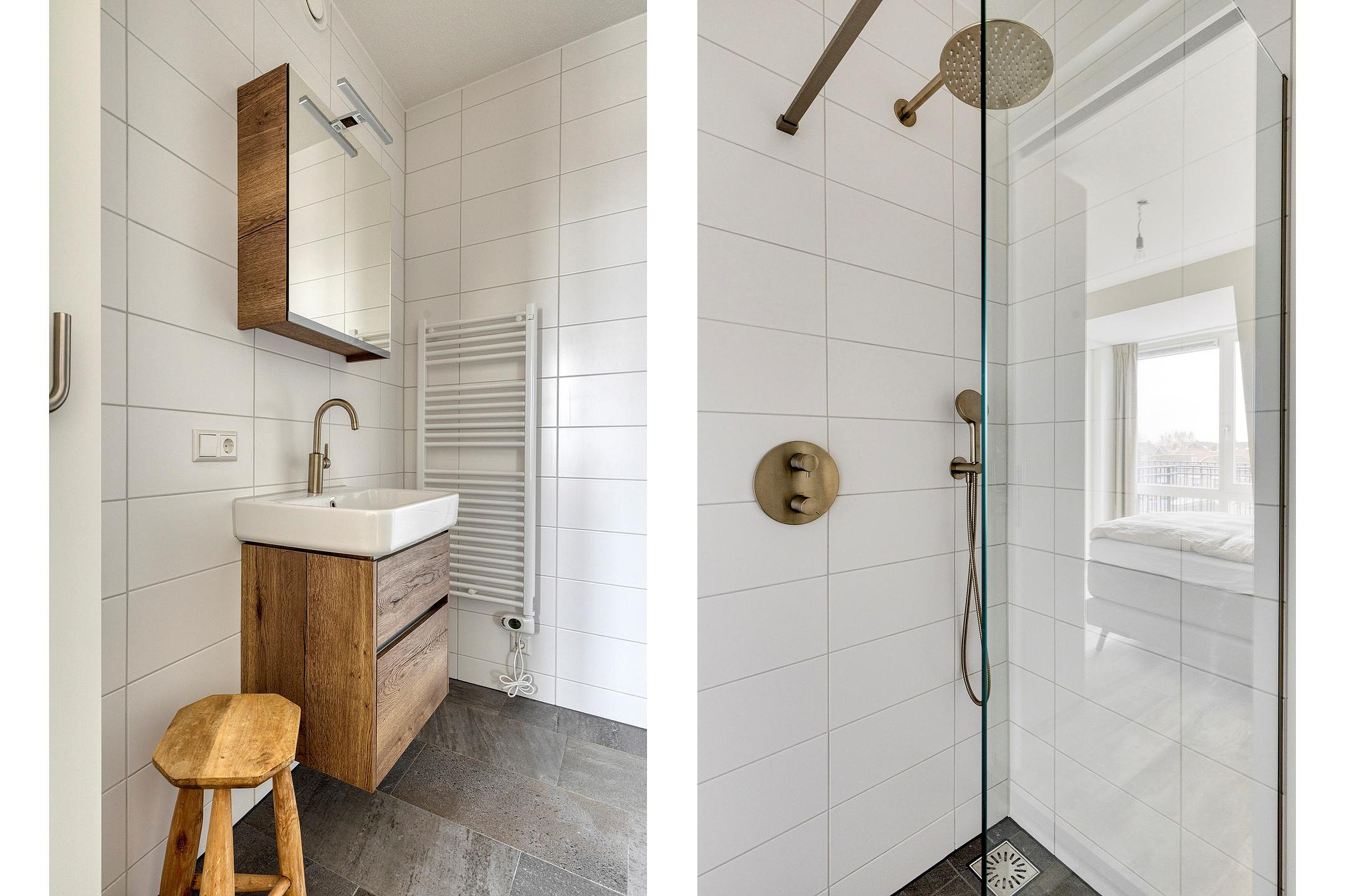 De badkamer vind je en suite en is afsluitbaar via een mooie schuifdeur. Bij het uitkiezen van deze badkamer is aan de details gedacht. Zo is er gekozen voor een inloopdouche met ingebouwde kranen van geborsteld rvs en is er een mooi nisje voor de flessen.
