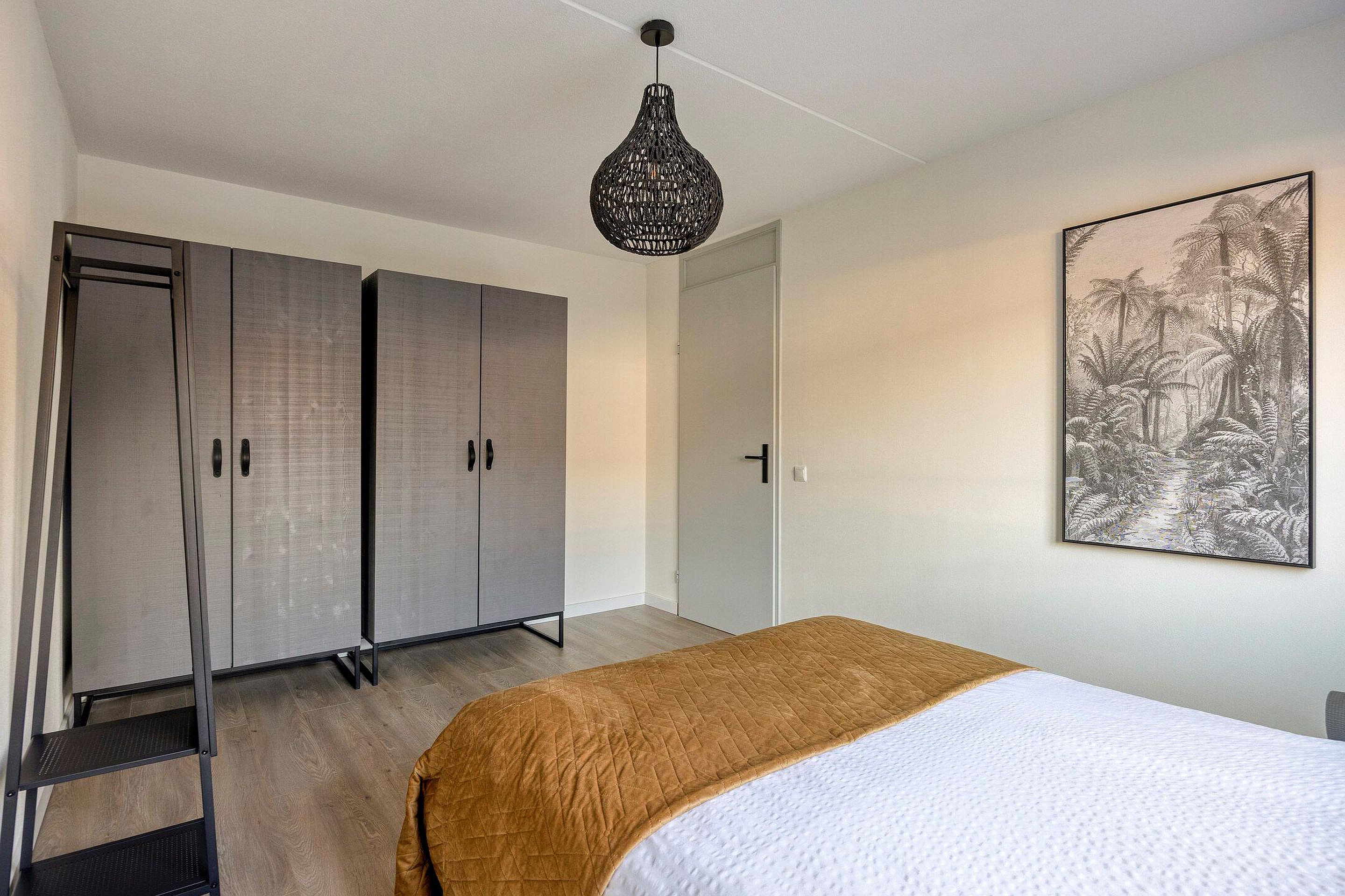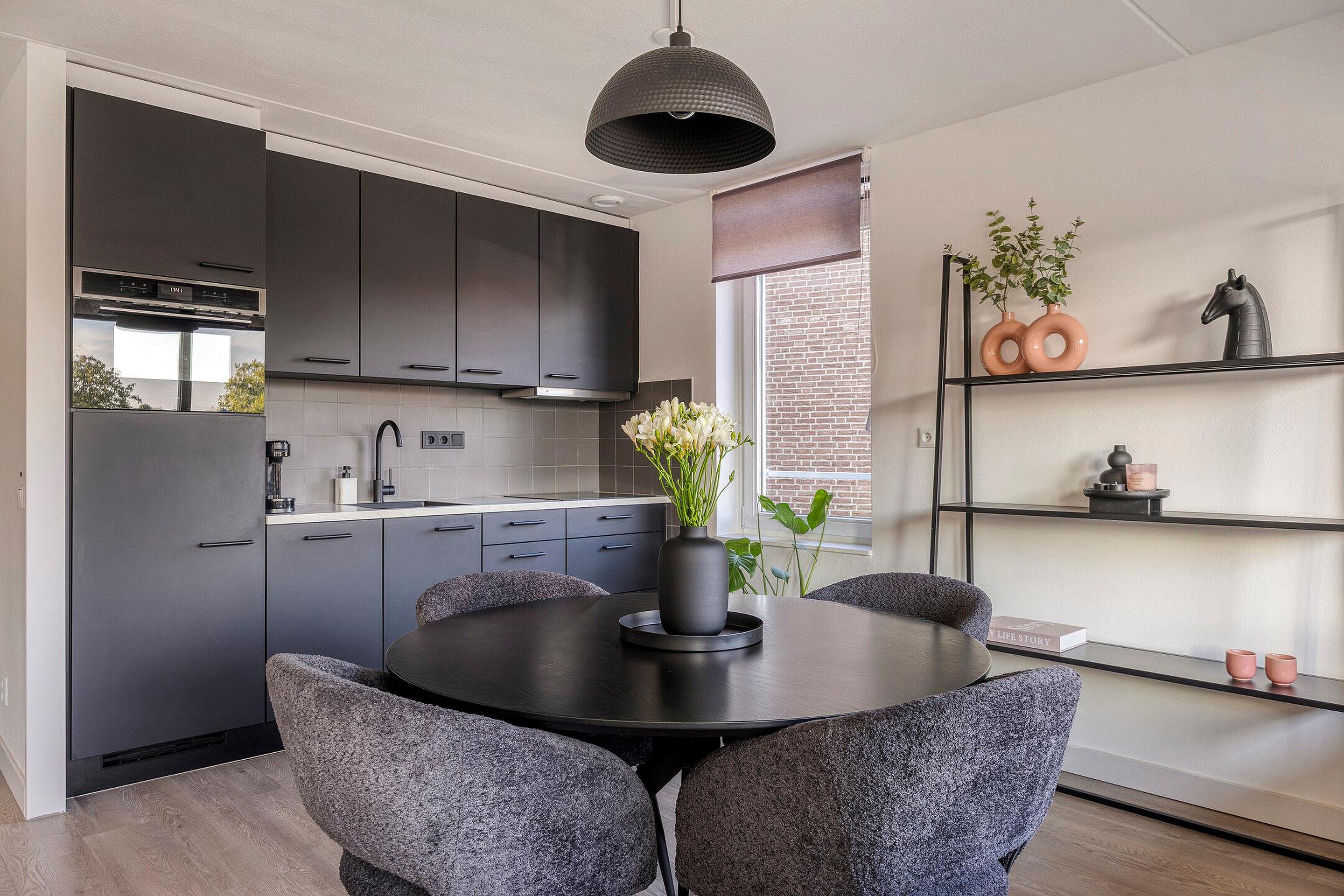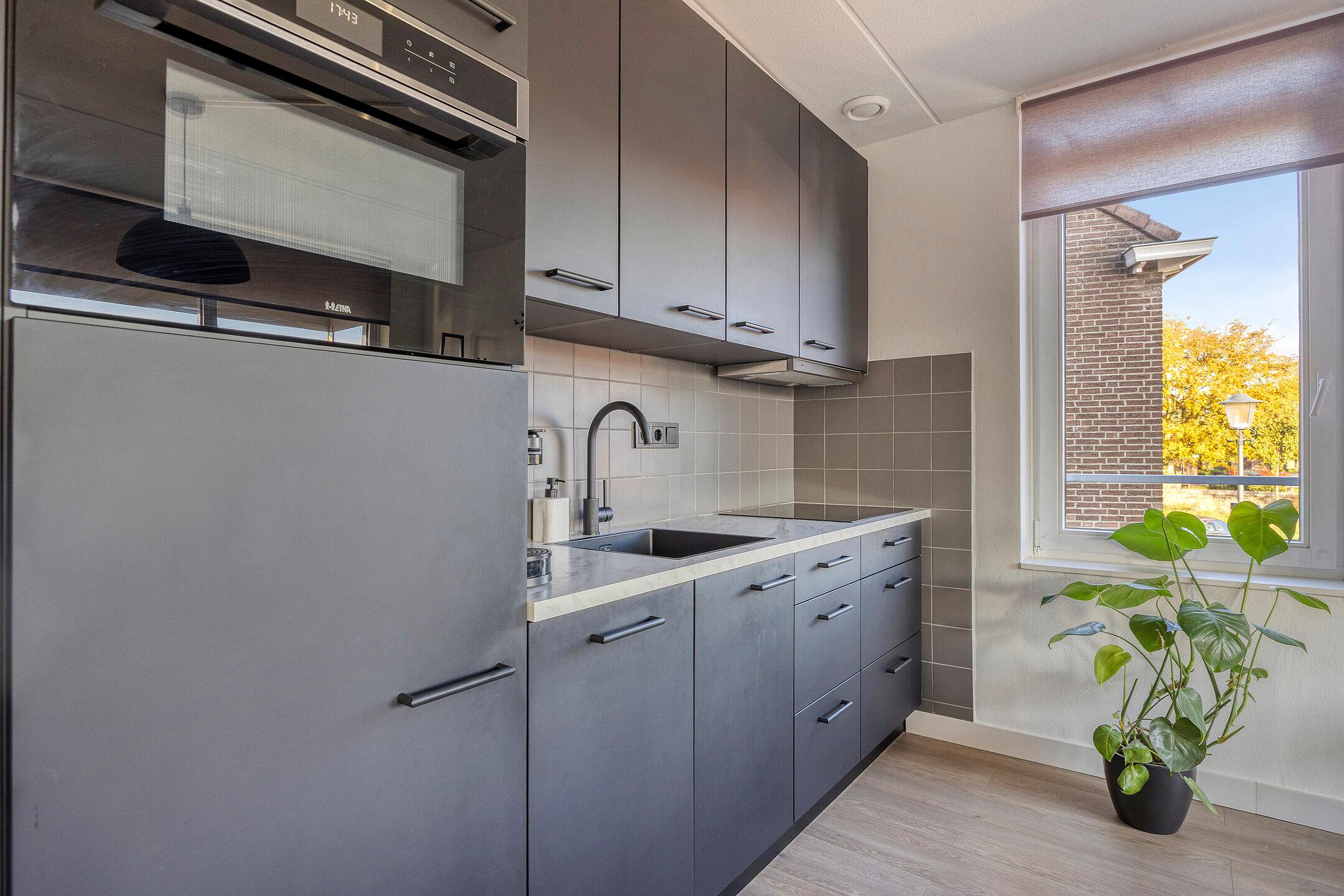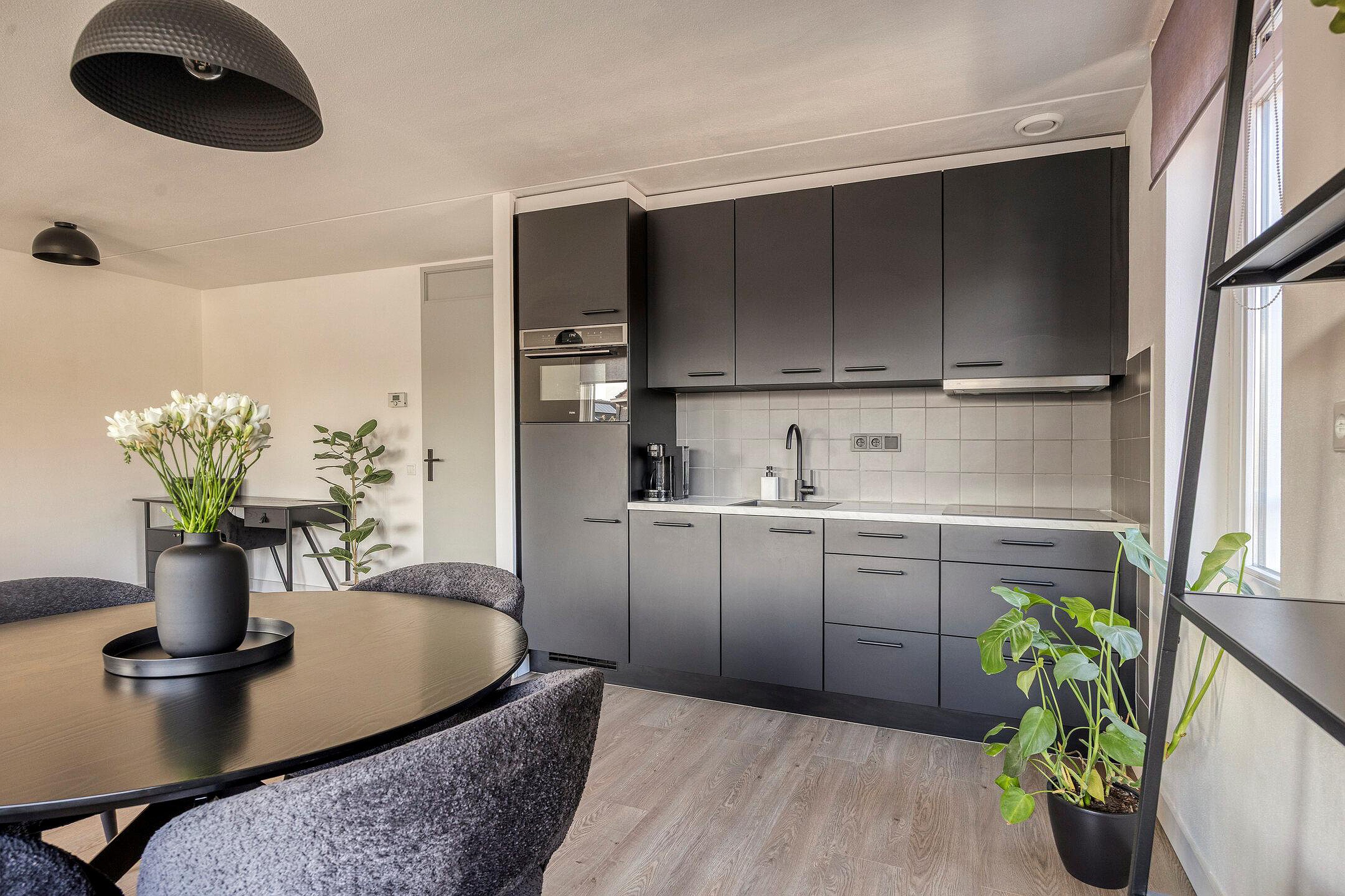 De in 2023 vernieuwde aanbouwkeuken met de volgende apparatuur: inductie kookplaat, koel/diepvriescombinatie, spoelbak met kraan, combi- magnetron en vaatwasser. Door de zwarte uitvoering van de keuken is dit een echte eye-catcher! Twee keurige slaapkamers (3.04 x 4.56 en 3.14 x 2.05) aan de achterzijde van het appartement, uitkijkend op de binnenplaats van het appartementencomplex.