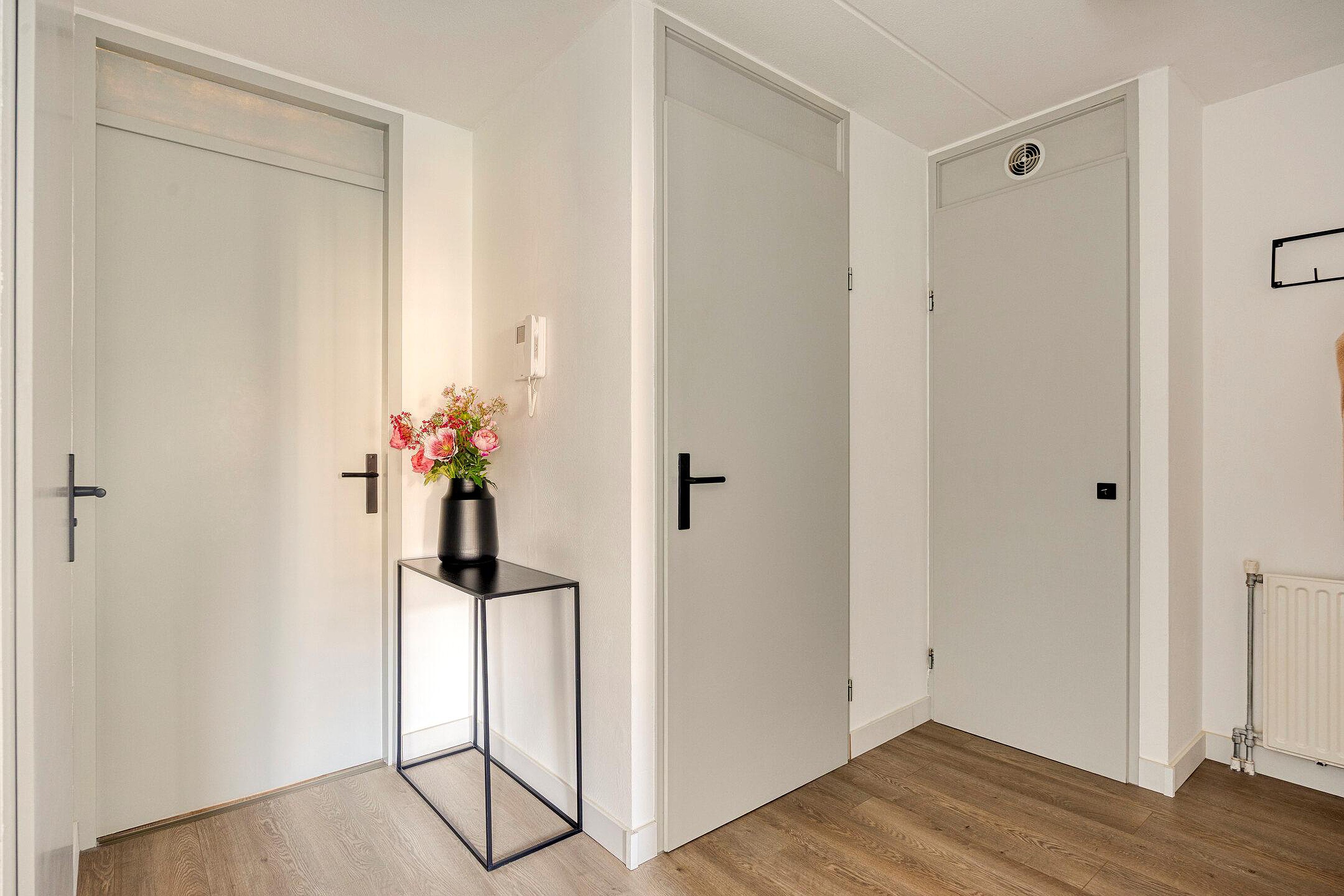 Via de voordeur bereikt u de entreehal die toegang biedt tot de verschillende ruimtes. Het gehele appartement (uitgezonderd het toilet en de badkamer) is voorzien van een mooie, strakke laminaatvloer in houtmotief.