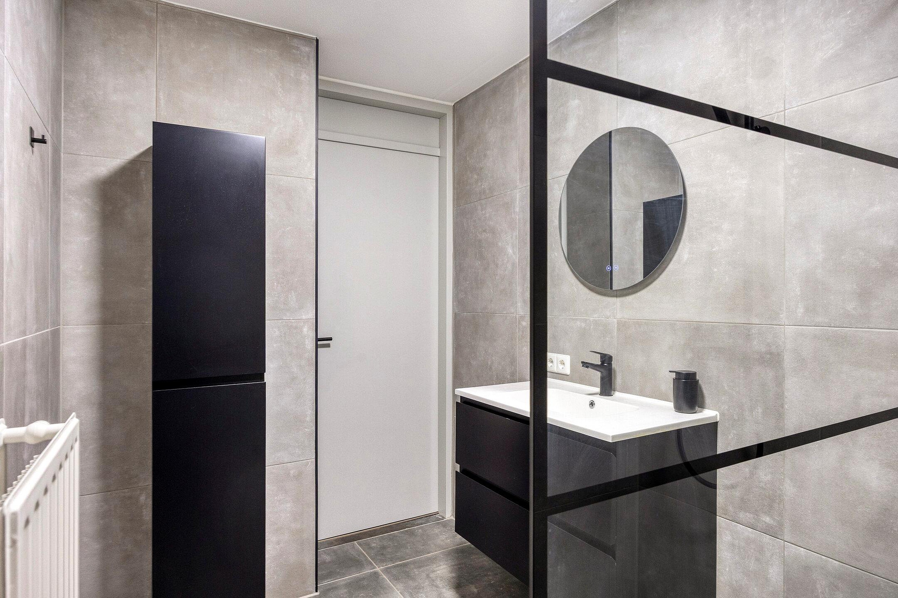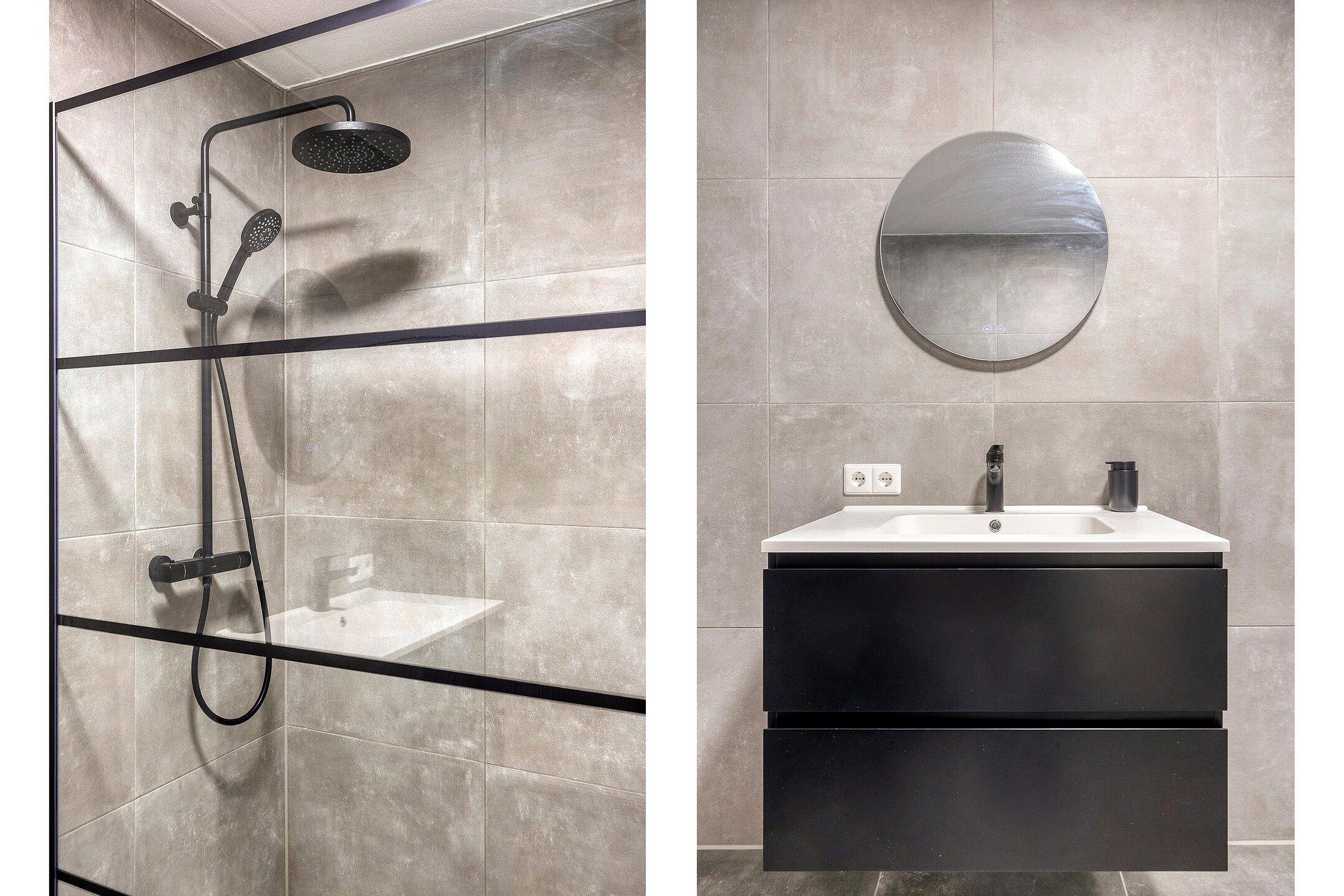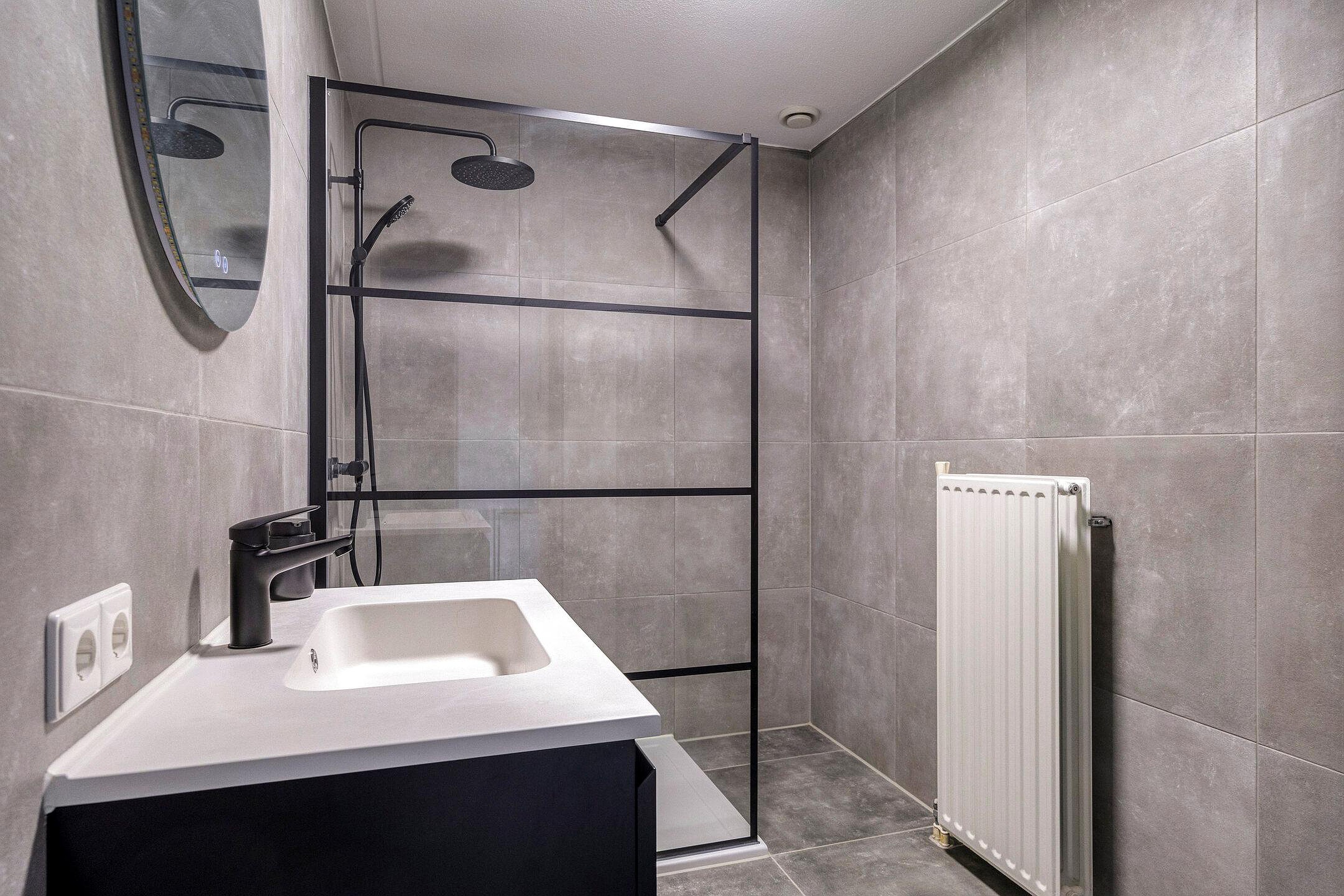 De in 2024 vernieuwde badkamer met grote inloopdouche, wastafel en badkamermeubel (ook met zwarte elementen) is voorzien van een tegelvloer.