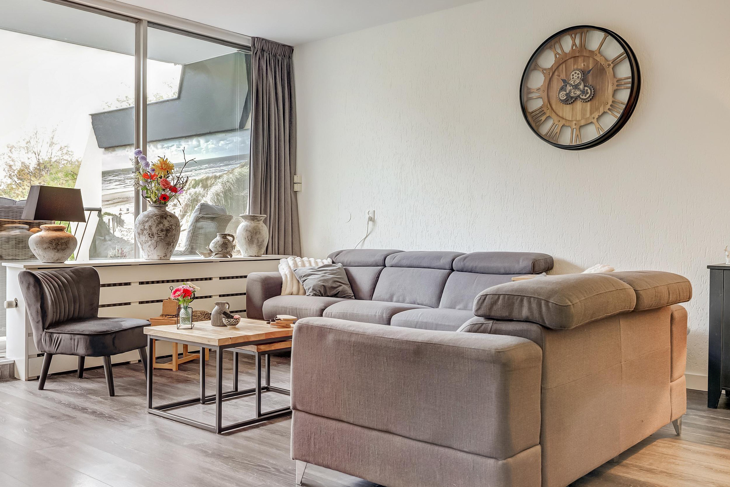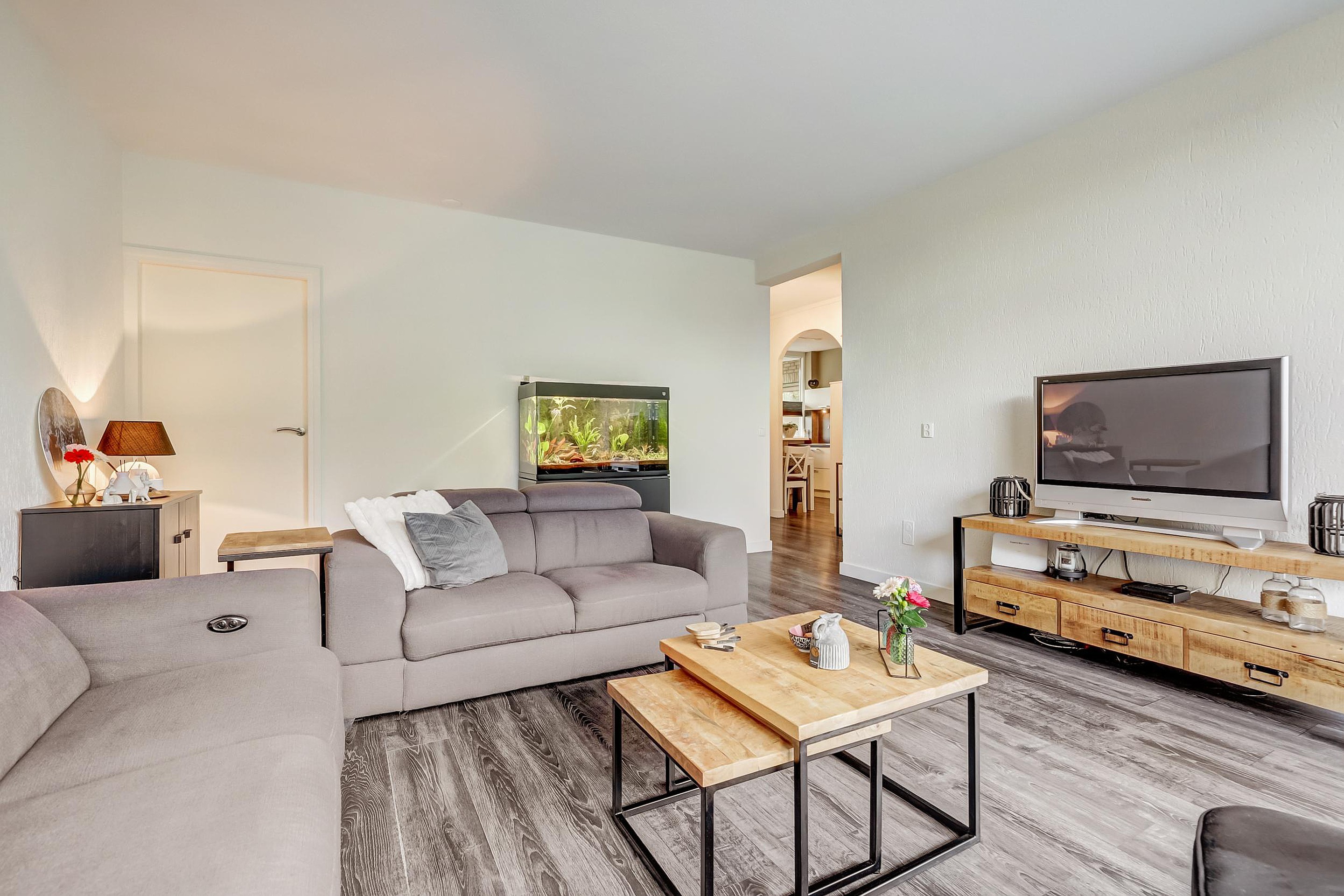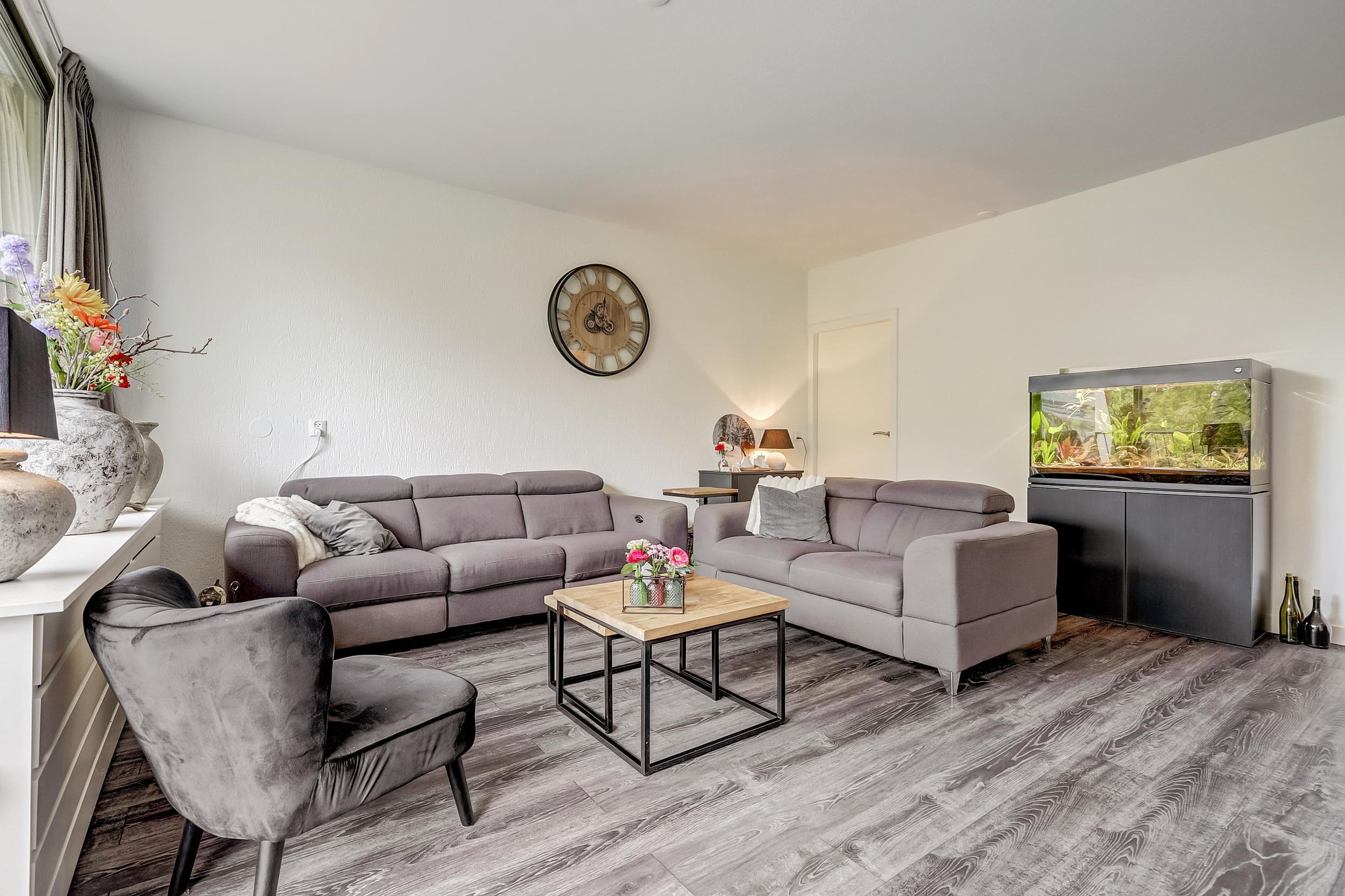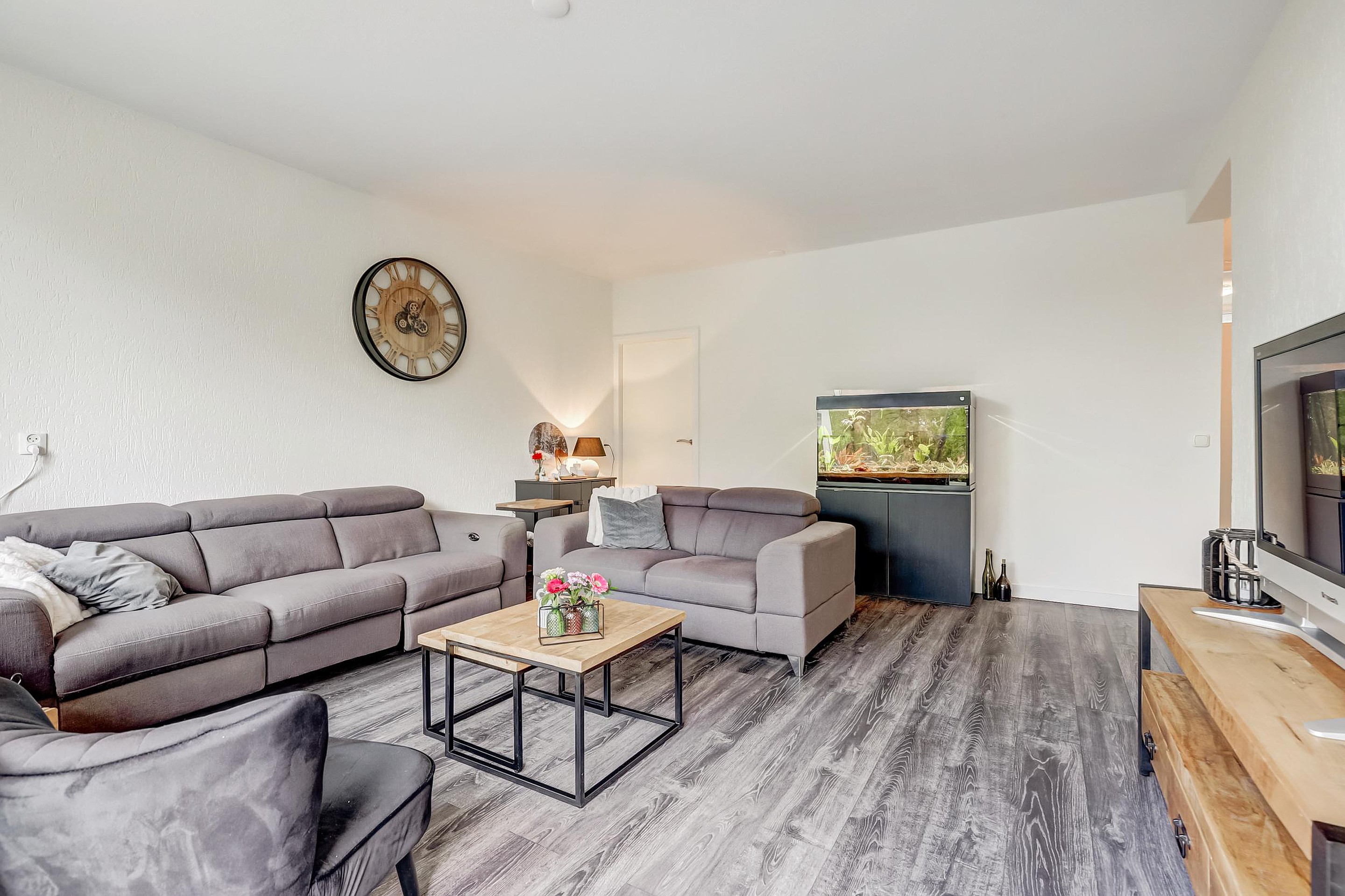 De lichte woonkamer (ca. 22 m2) is voorzien van een laminaatvloer en biedt via een grote schuifpui toegang tot het royale terras. Hier geniet u van de middag- en avondzon, en met het zonnescherm creëert u eenvoudig een fijne schaduwplek.