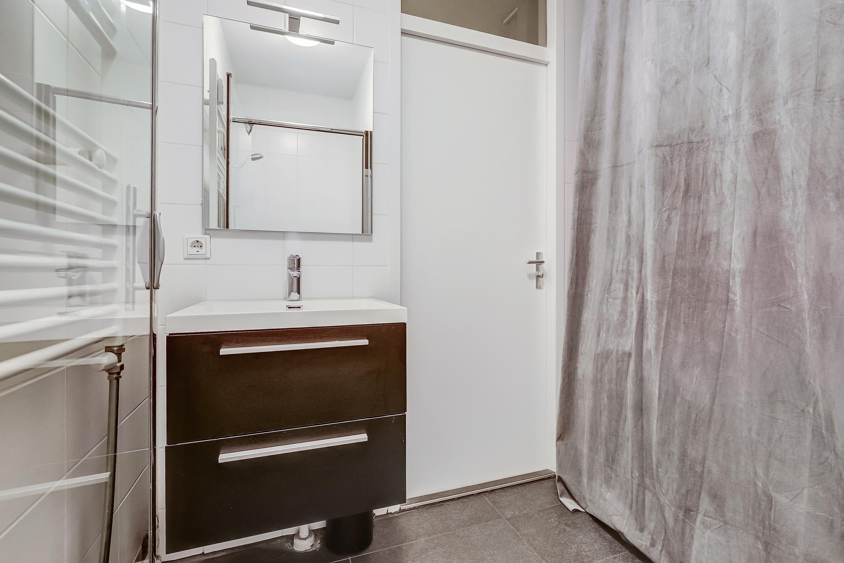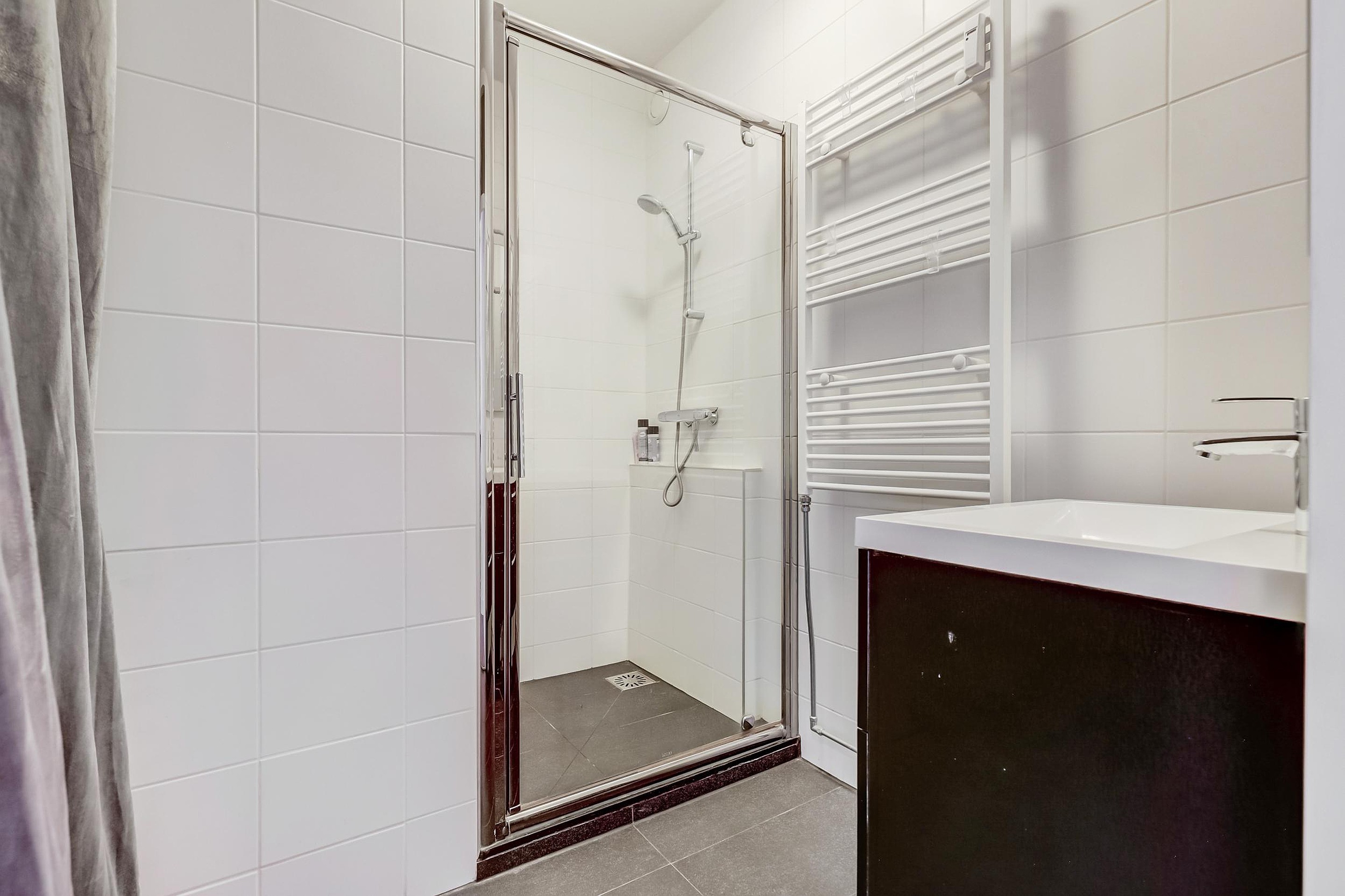 De badkamer beschikt over een wastafelmeubel, douchecabine, designradiator, wasmachineaansluiting en aansluiting boiler. Het toilet is separaat.