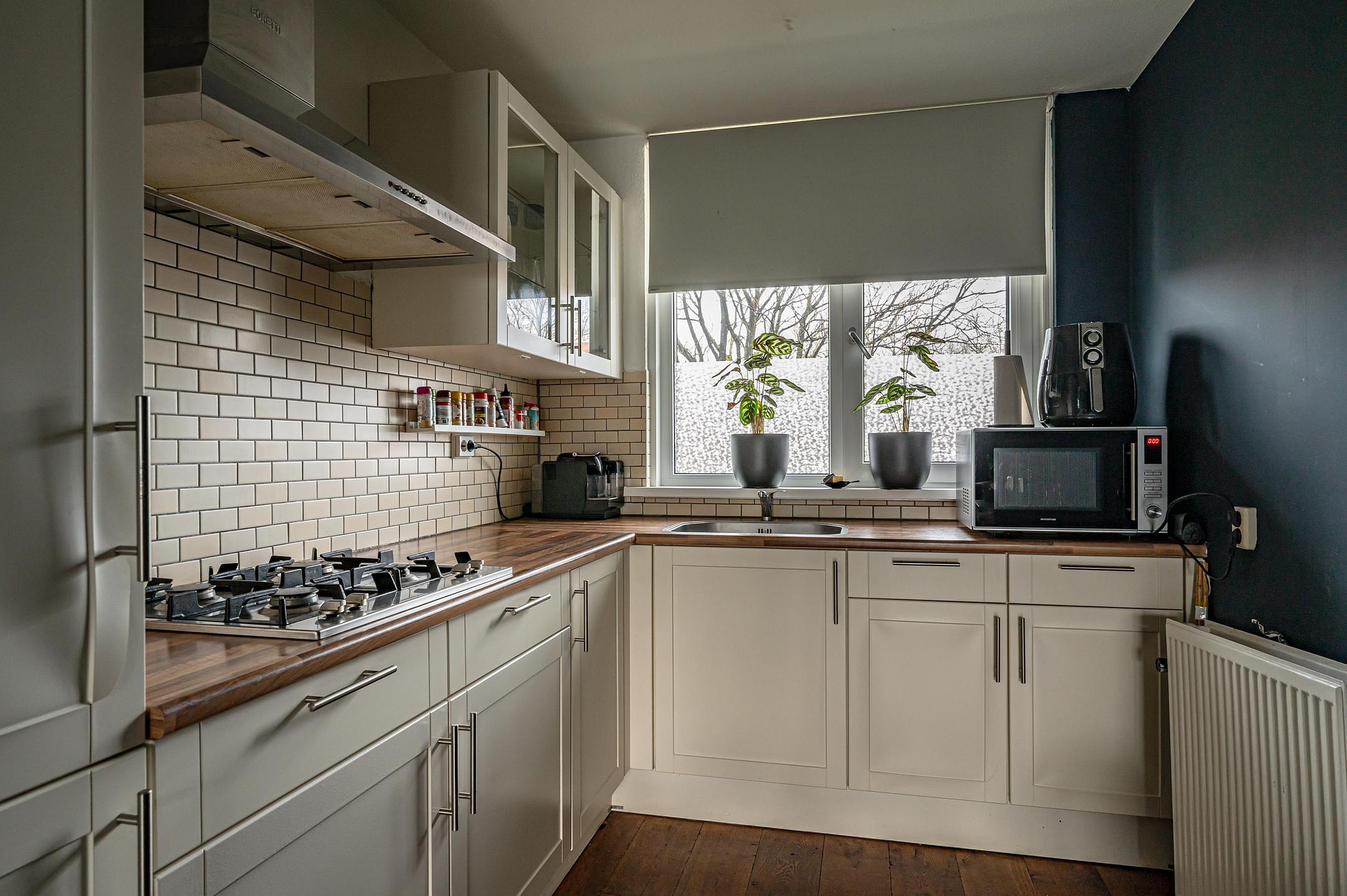 De hoekkeuken is modern uitgerust met diverse inbouwapparatuur waaronder een koel/vriescombinatie, 4 pits gaskookplaat en rvs afzuigkap.