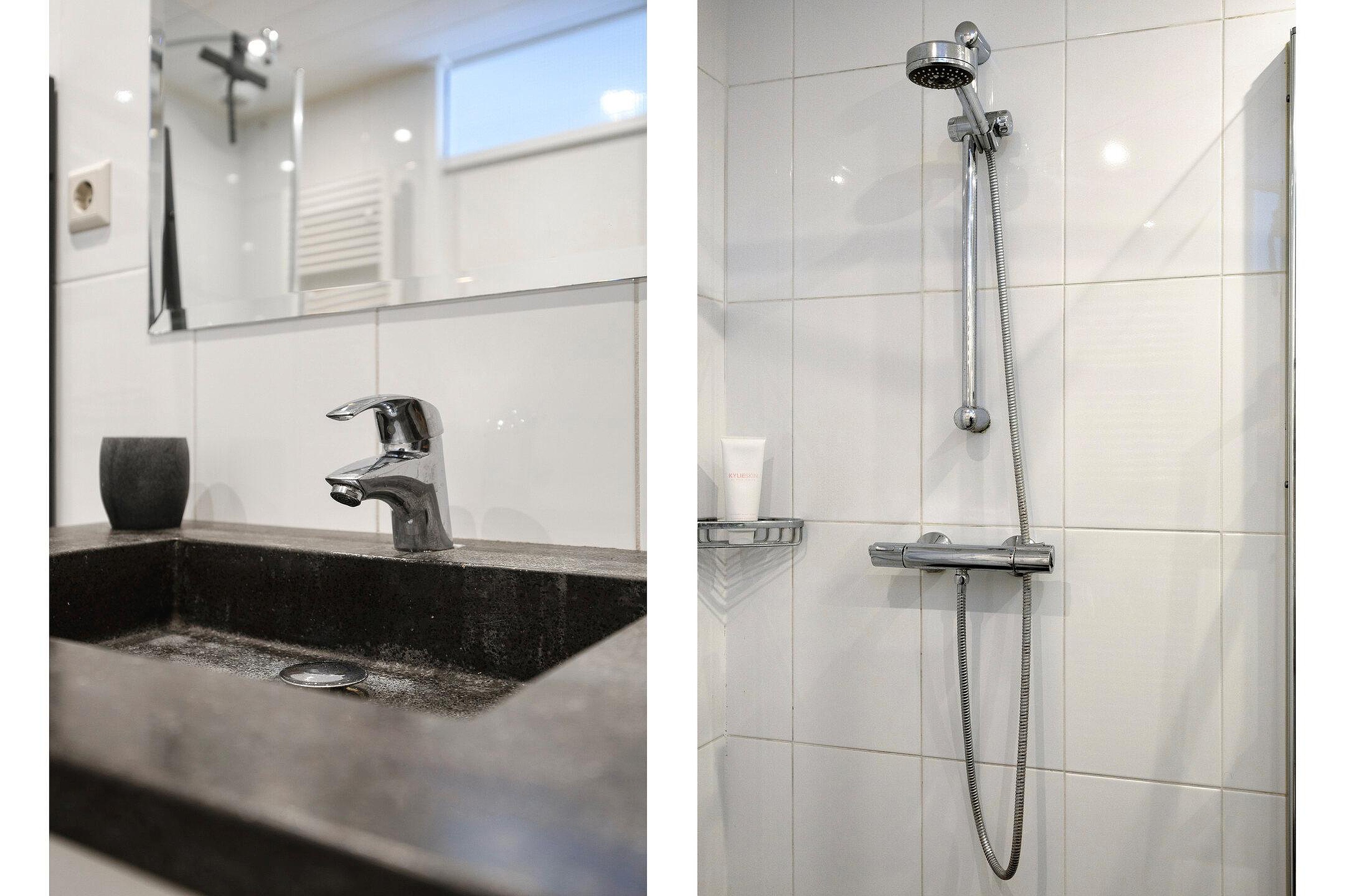 - Moderne volledig licht betegelde badkamer met o.a. een royale inloopdouche.