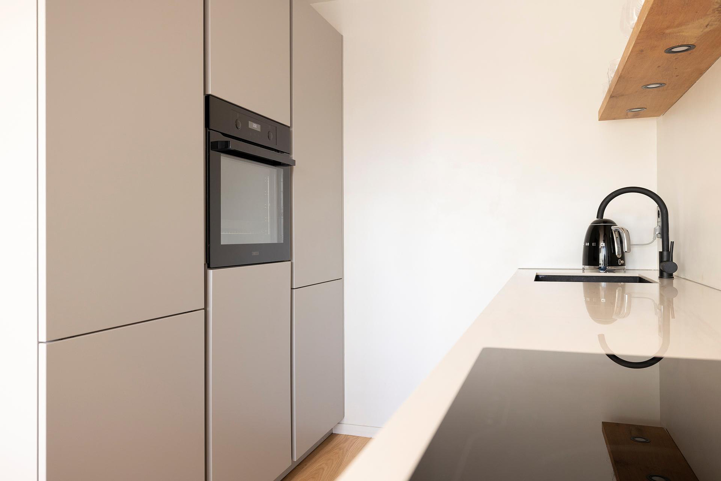 After taking the stairs or lift, you walk along the gallery to a corridor where the front door is located. Once inside the apartment, you enter the hallway which gives access to the bathroom and the two bedrooms. At the end of the hallway, you arrive in the bright and spacious living room with a beautiful modern open-plan kitchen with plenty of storage space and various built-in appliances (large fridge/freezer, induction hob and dishwasher). From the living room you have access to the sunny south-facing balcony where you can enjoy unobstructed views over the old historic city. The entire apartment features a beautiful oak parquet floor.