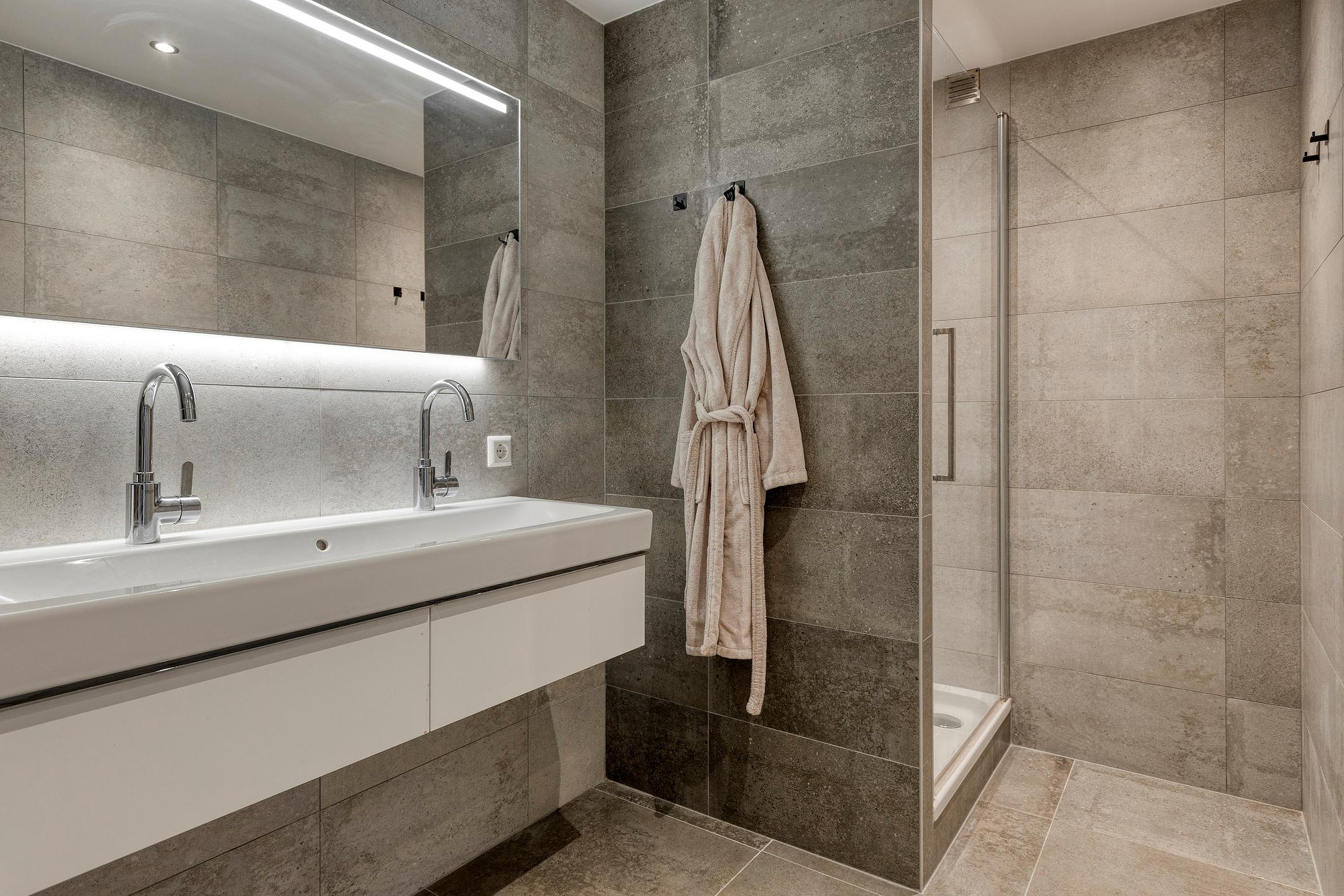luxe badkamer met douchehoek en dubbel wastafelmeubel.