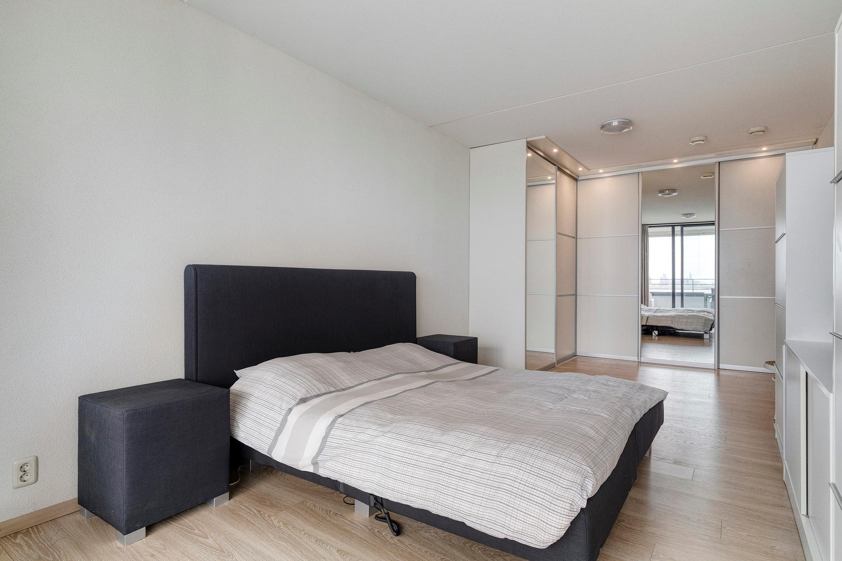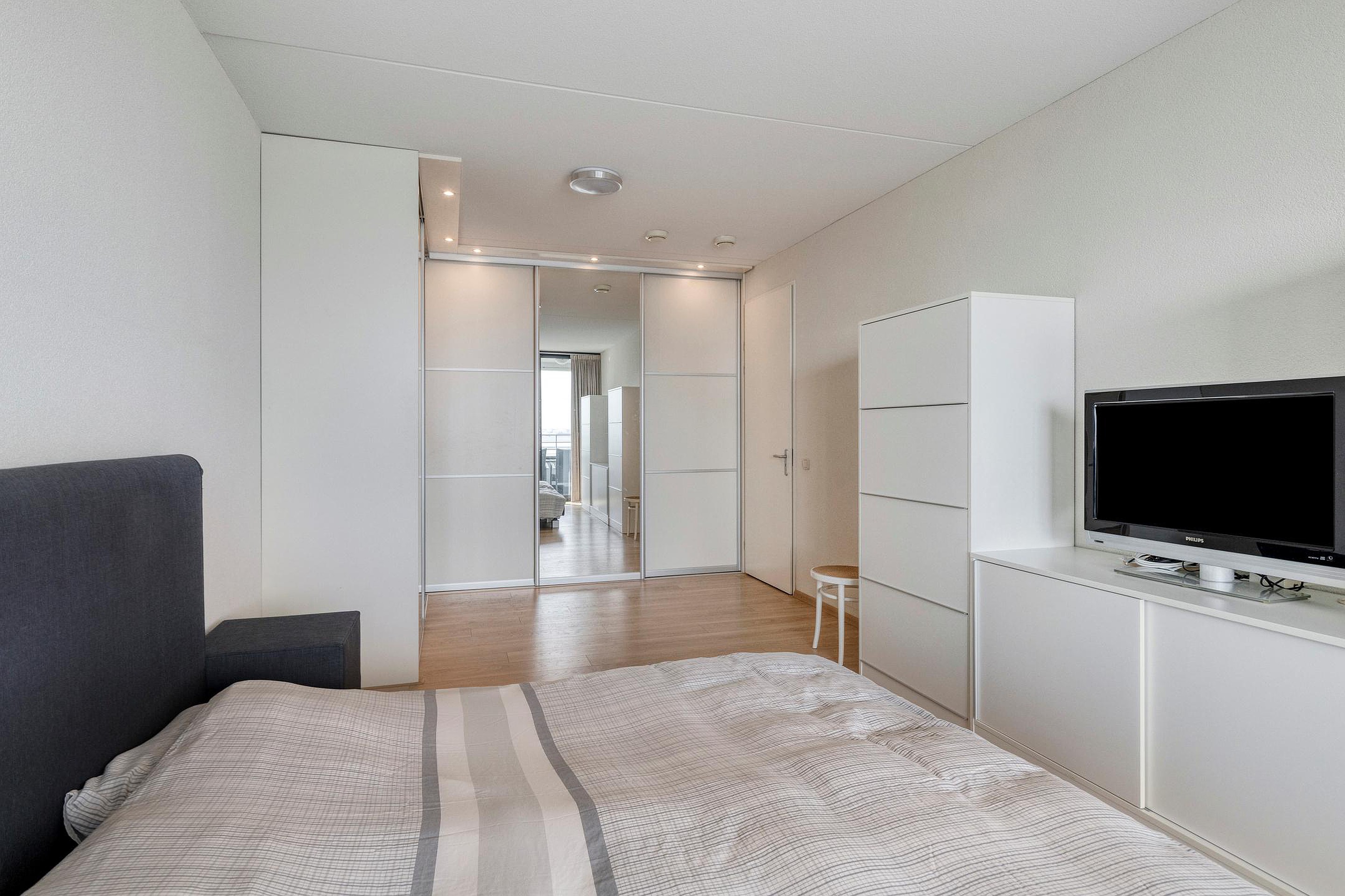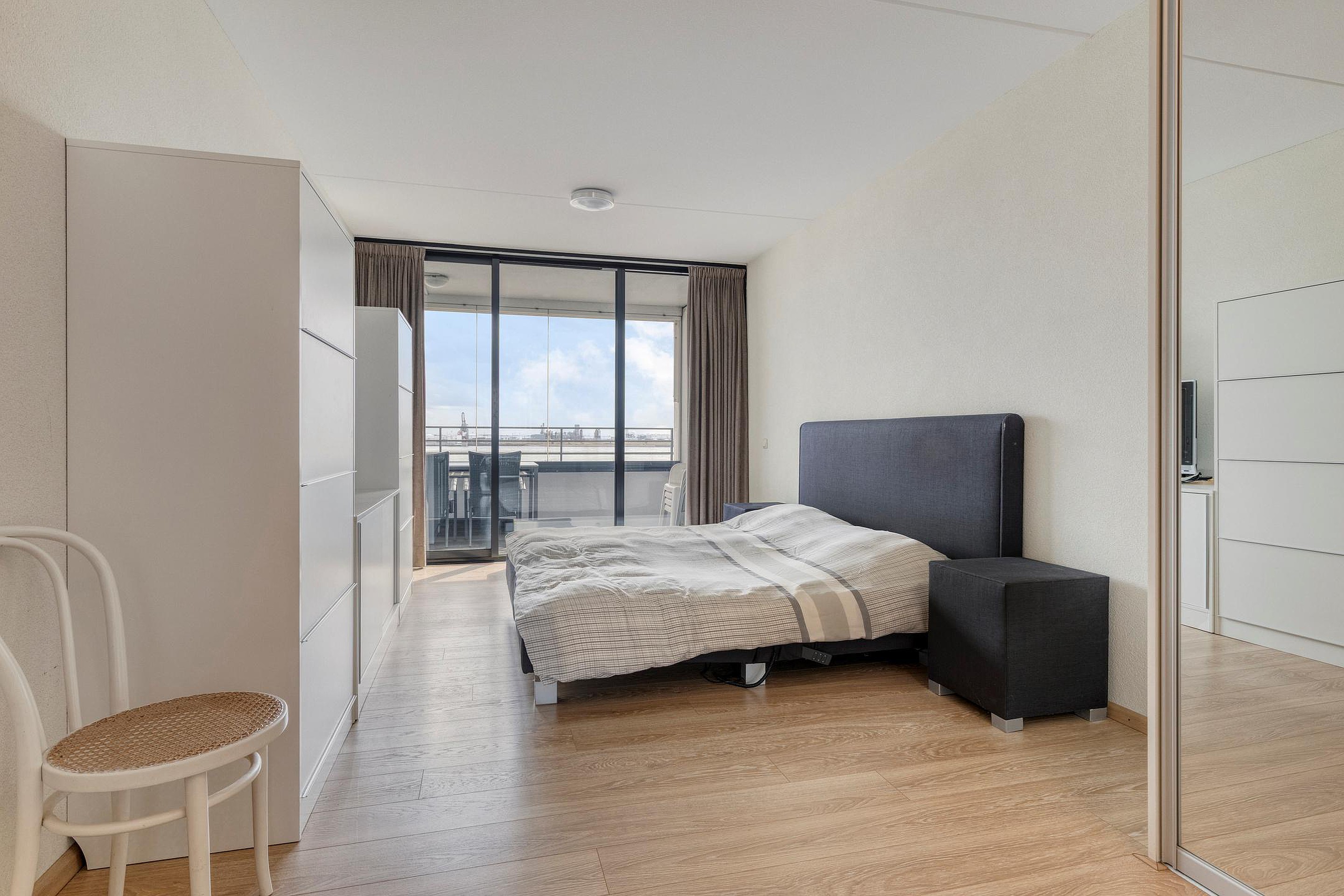 De 1e slaapkamer aan de Waterwegzijde heeft een vaste kastenwand en een schuifpui naar de loggia. De eetkamer kan mogelijk ook als 3e slaapkamer ingericht worden.