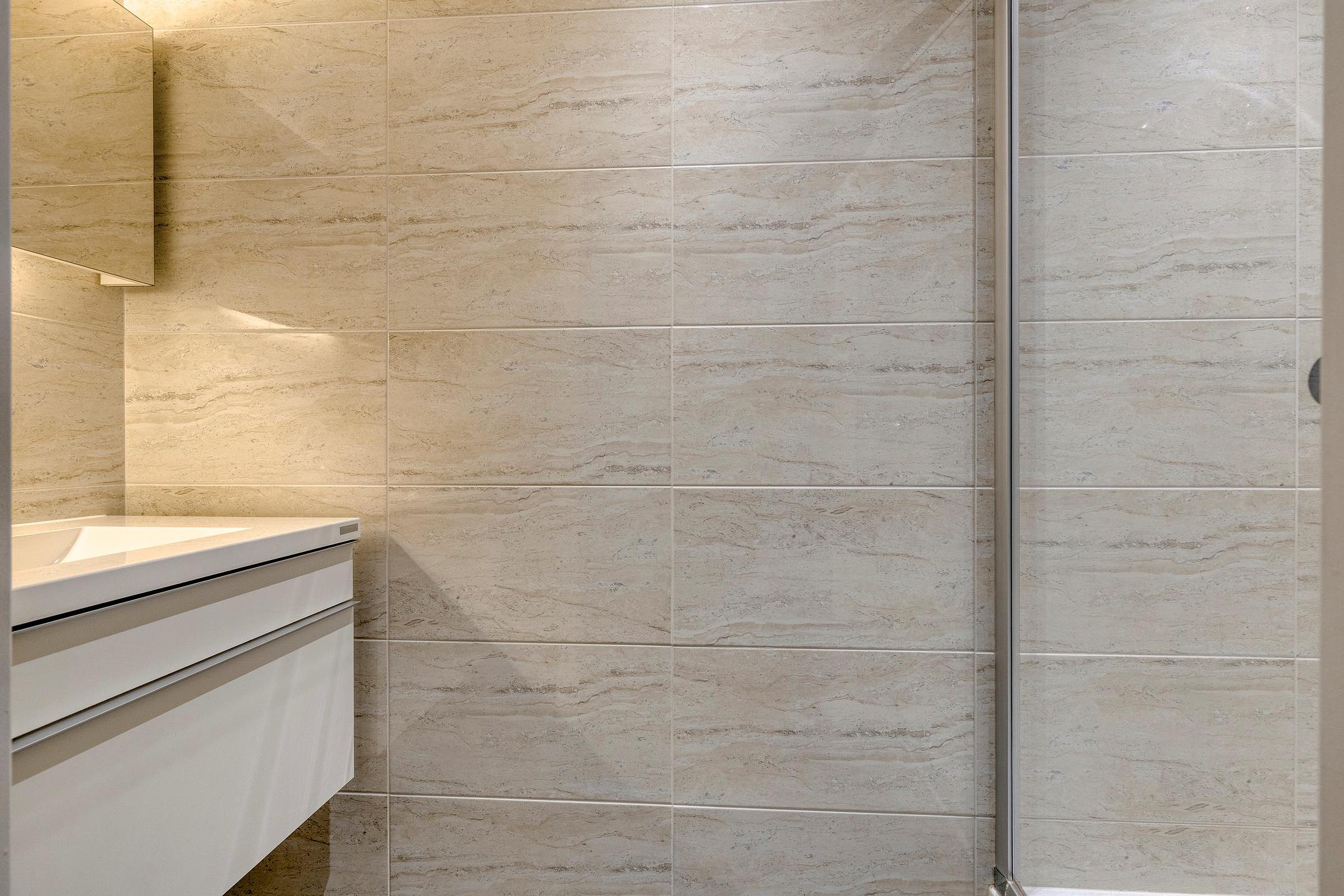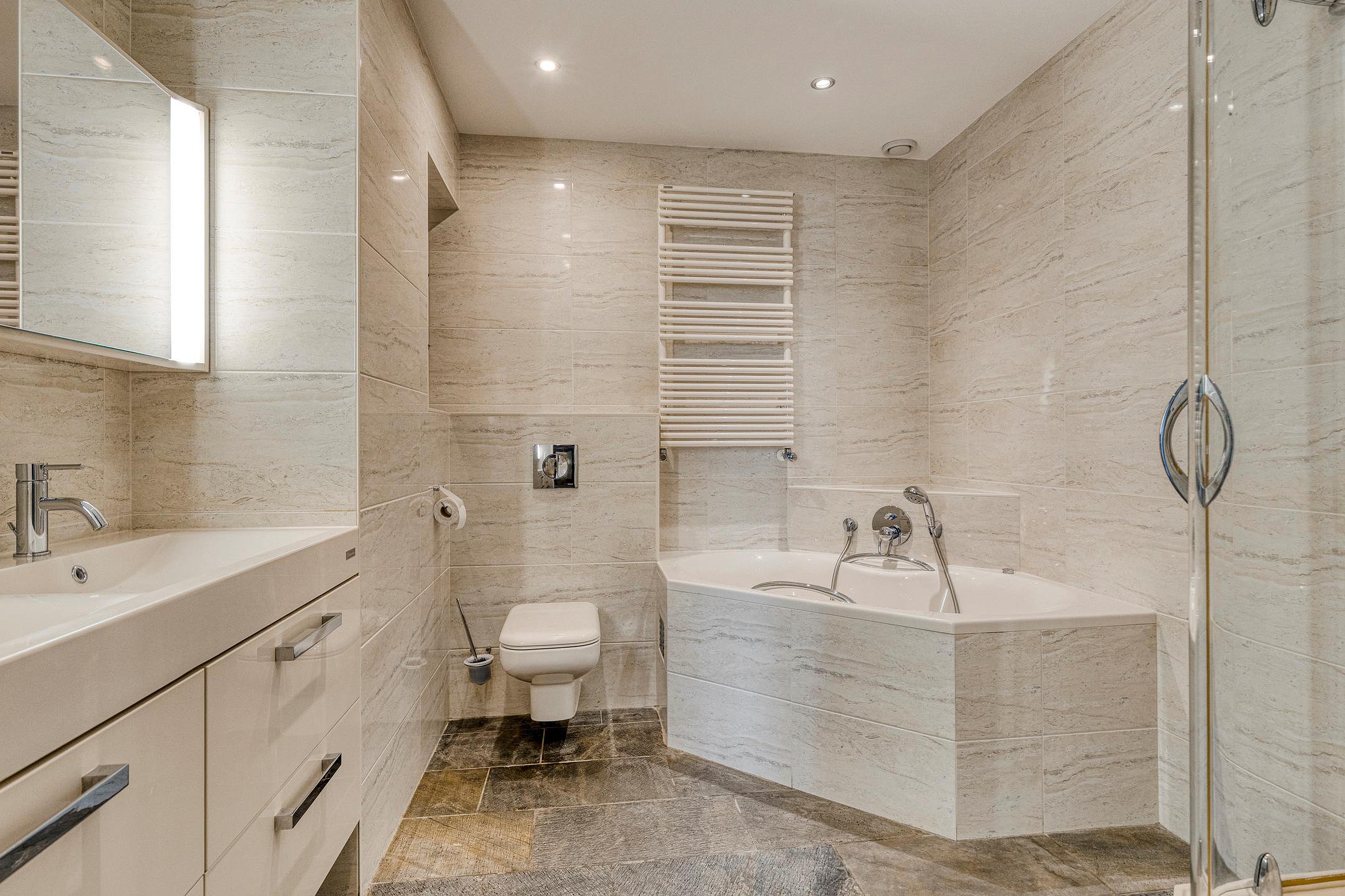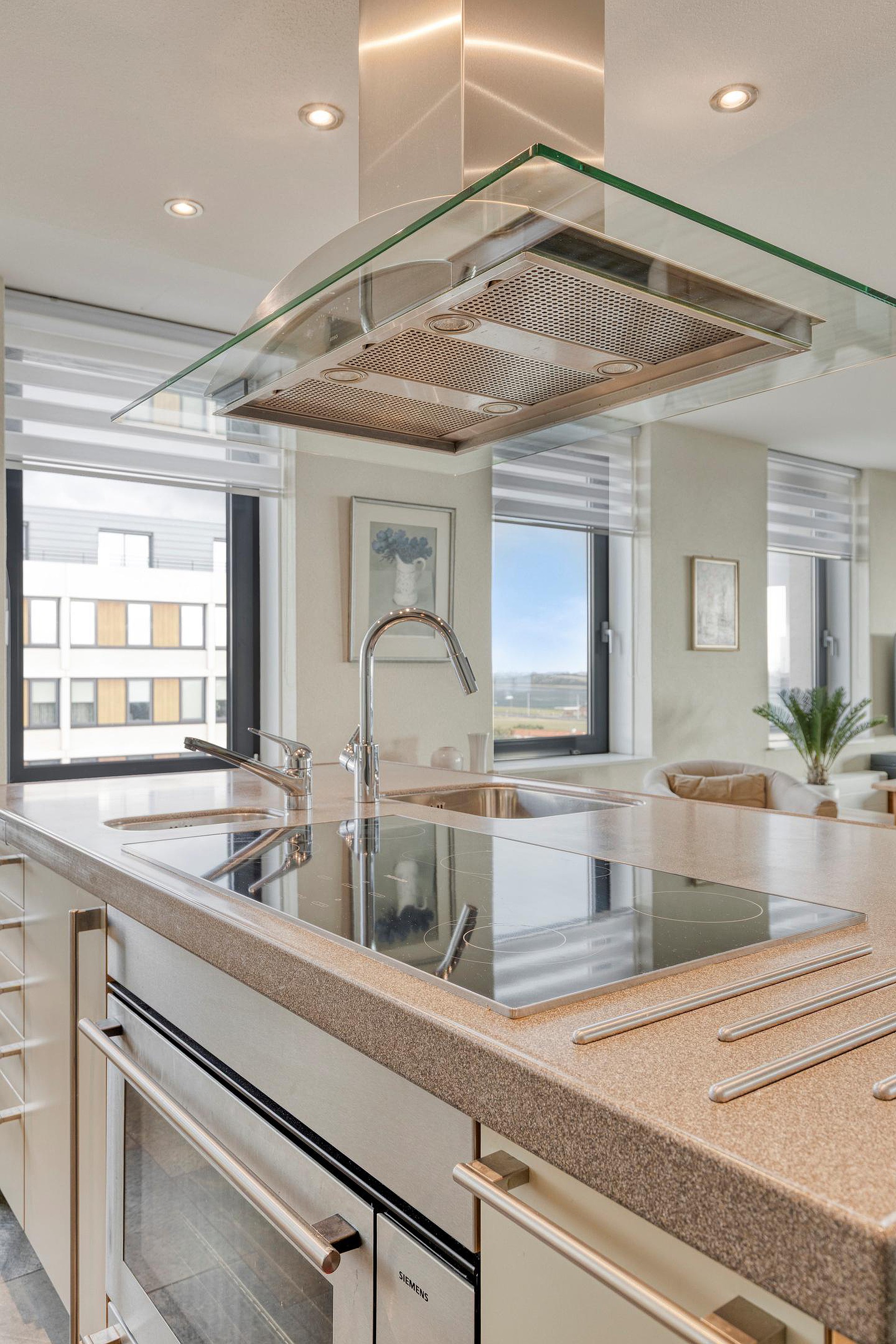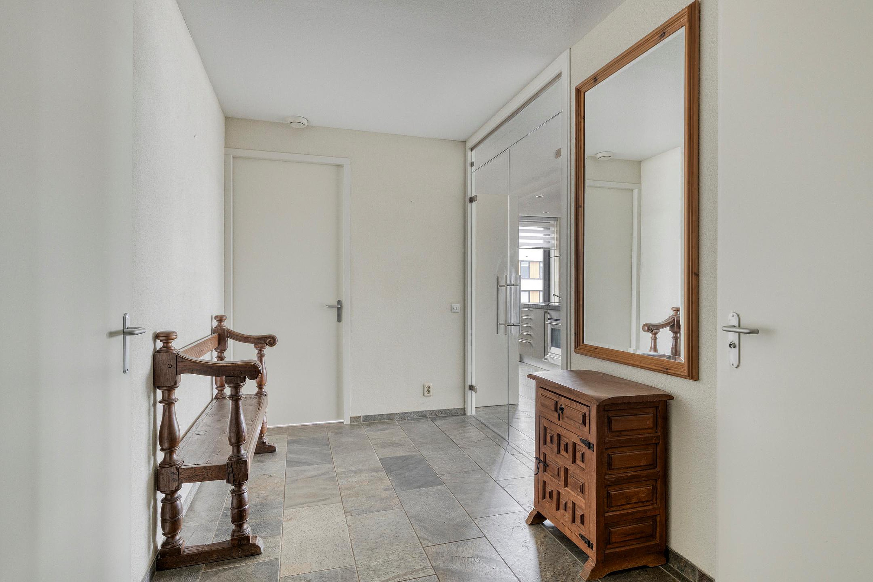 5e verdieping: ruime hal met dubbel openslaande deuren met volledig glas, bergkamer met opstelplaats voor de wasmachine en droger en WarmteTerugWin installatie voor de ventilatie, zwevend toilet met fonteintje, royale woonkamer met een natuurstenen vloer met vloerwarming, dubbele schuifpui naar de royale loggia met glasschermen, moderne open keuken met een kookeiland en diverse inbouwapparatuur, 1e badkamer is voorzien van een douchehoek, whirlpool ligbad, dubbel wastafelmeubel en 2e toilet, 2e badkamer is voorzien van een wastafelmeubel en douche.