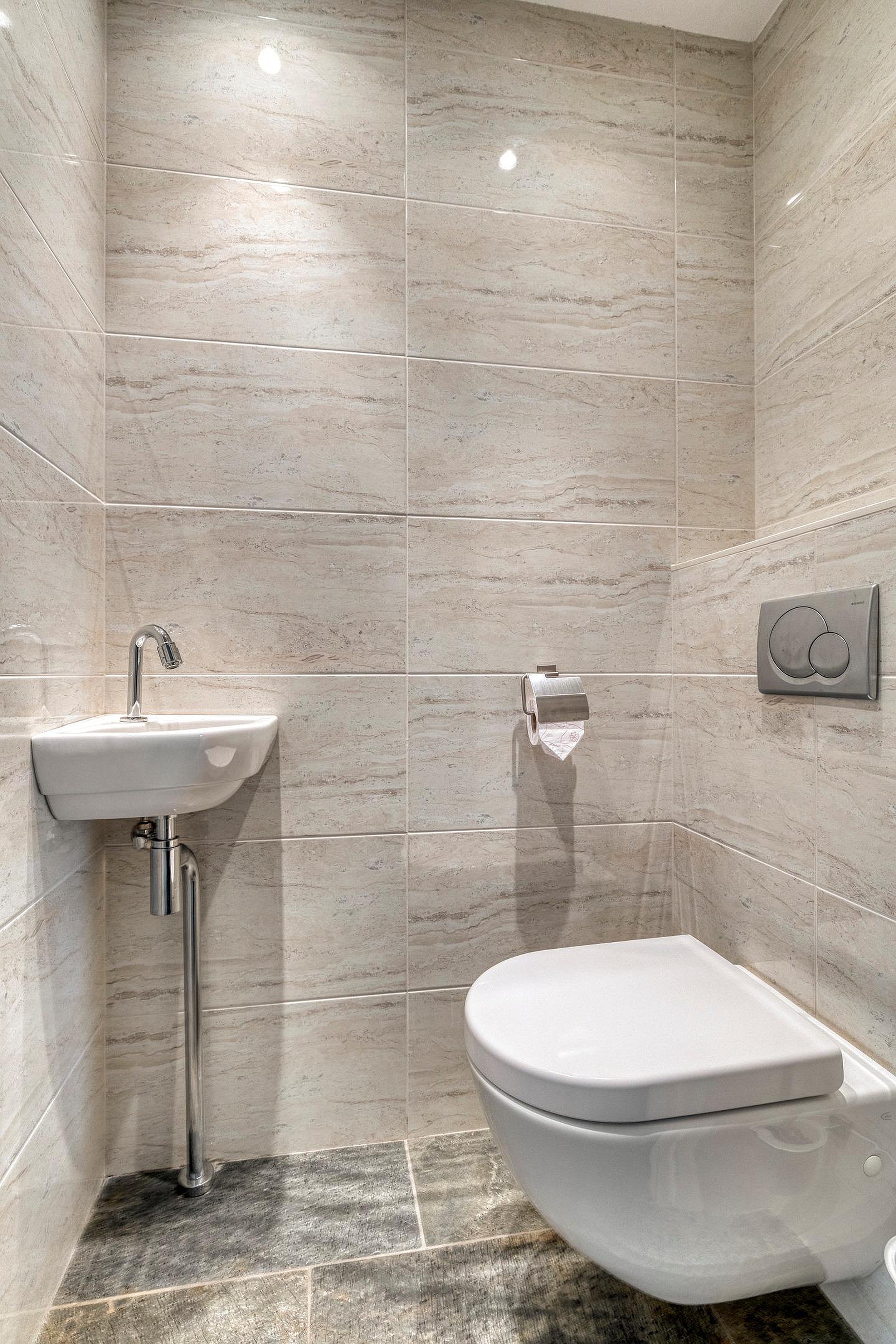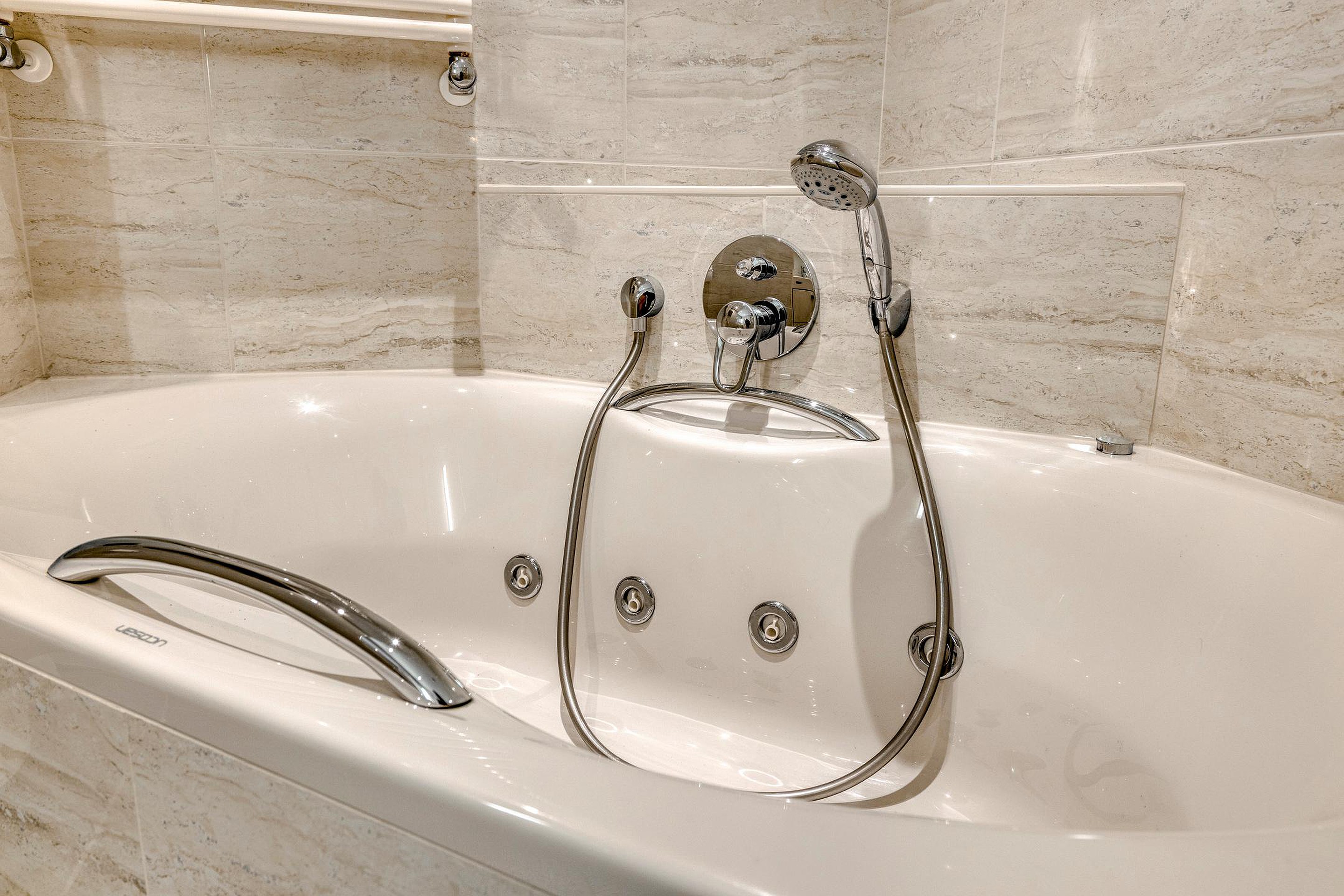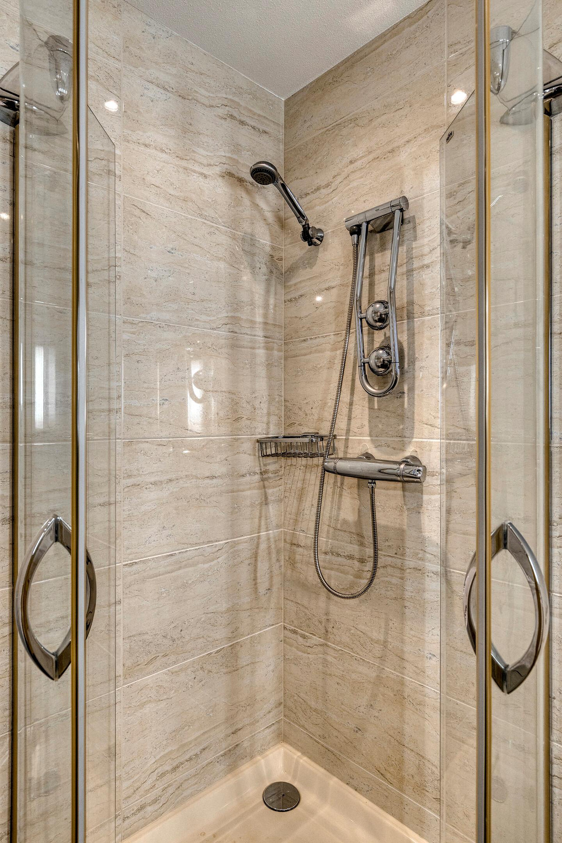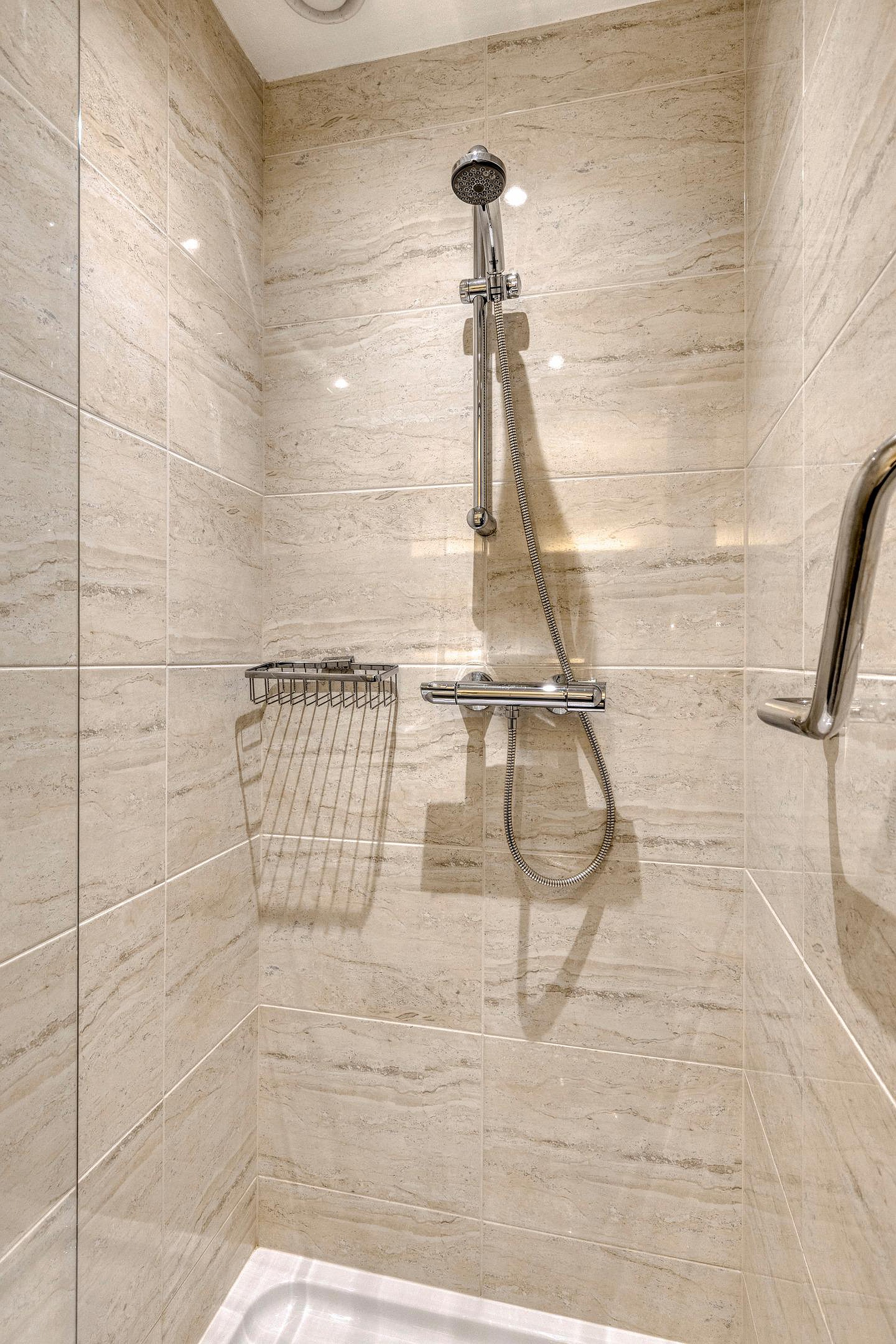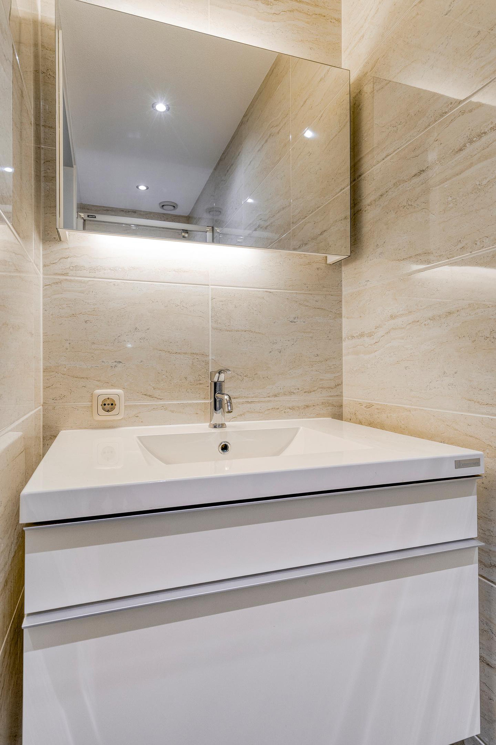 5e verdieping: ruime hal met dubbel openslaande deuren met volledig glas, bergkamer met opstelplaats voor de wasmachine en droger en WarmteTerugWin installatie voor de ventilatie, zwevend toilet met fonteintje, royale woonkamer met een natuurstenen vloer met vloerwarming, dubbele schuifpui naar de royale loggia met glasschermen, moderne open keuken met een kookeiland en diverse inbouwapparatuur, 1e badkamer is voorzien van een douchehoek, whirlpool ligbad, dubbel wastafelmeubel en 2e toilet, 2e badkamer is voorzien van een wastafelmeubel en douche.