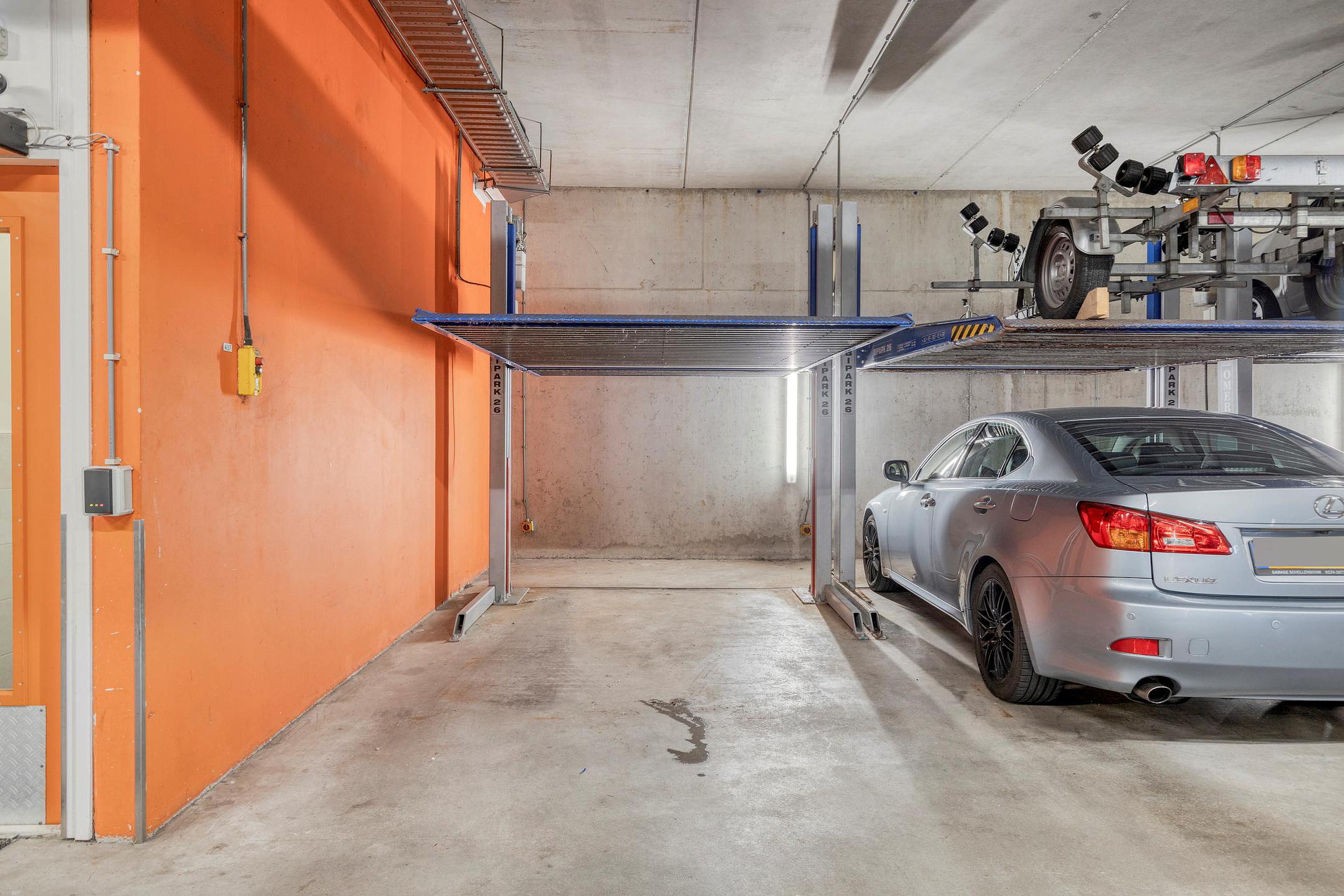 Kelder: 2 eigen parkeerplaatsen door middel van een parkeerlift en een grote afgesloten privé berging met vliering.