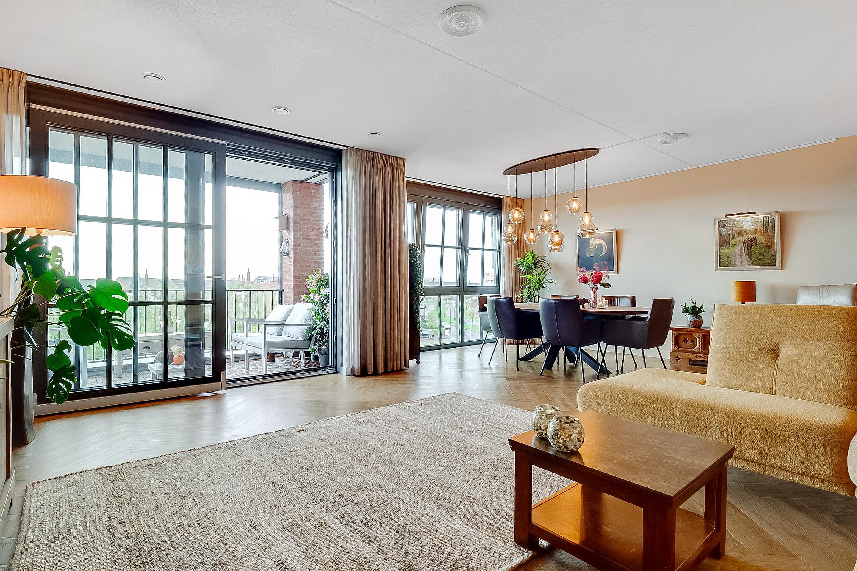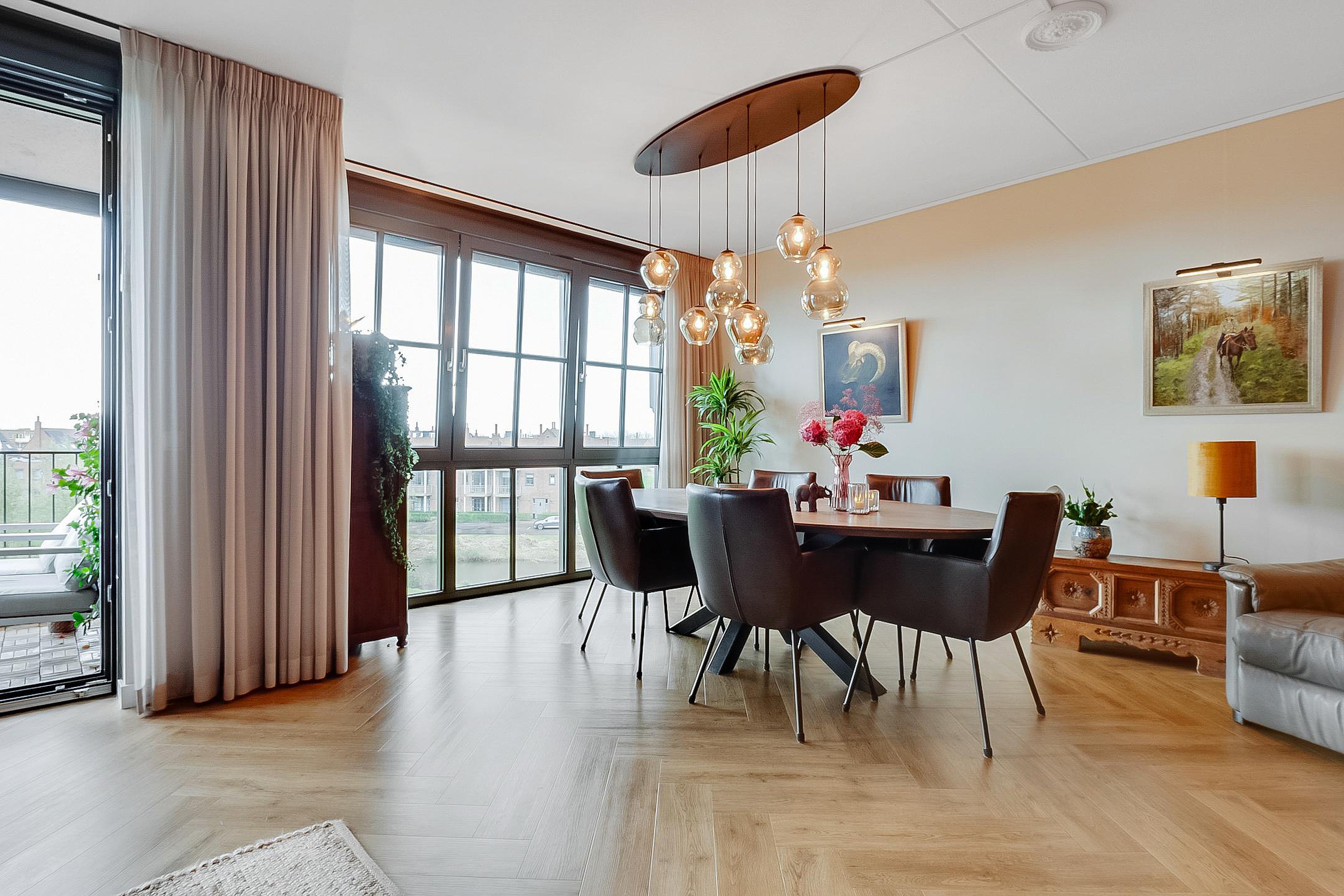 Via de keuken komt u in de ruime lichte woonkamer. Links de ruime zithoek en schuifpui naar het zonnige balkon. Wat gelijk opvalt is de grote raampartij en het prachtige uitzicht.