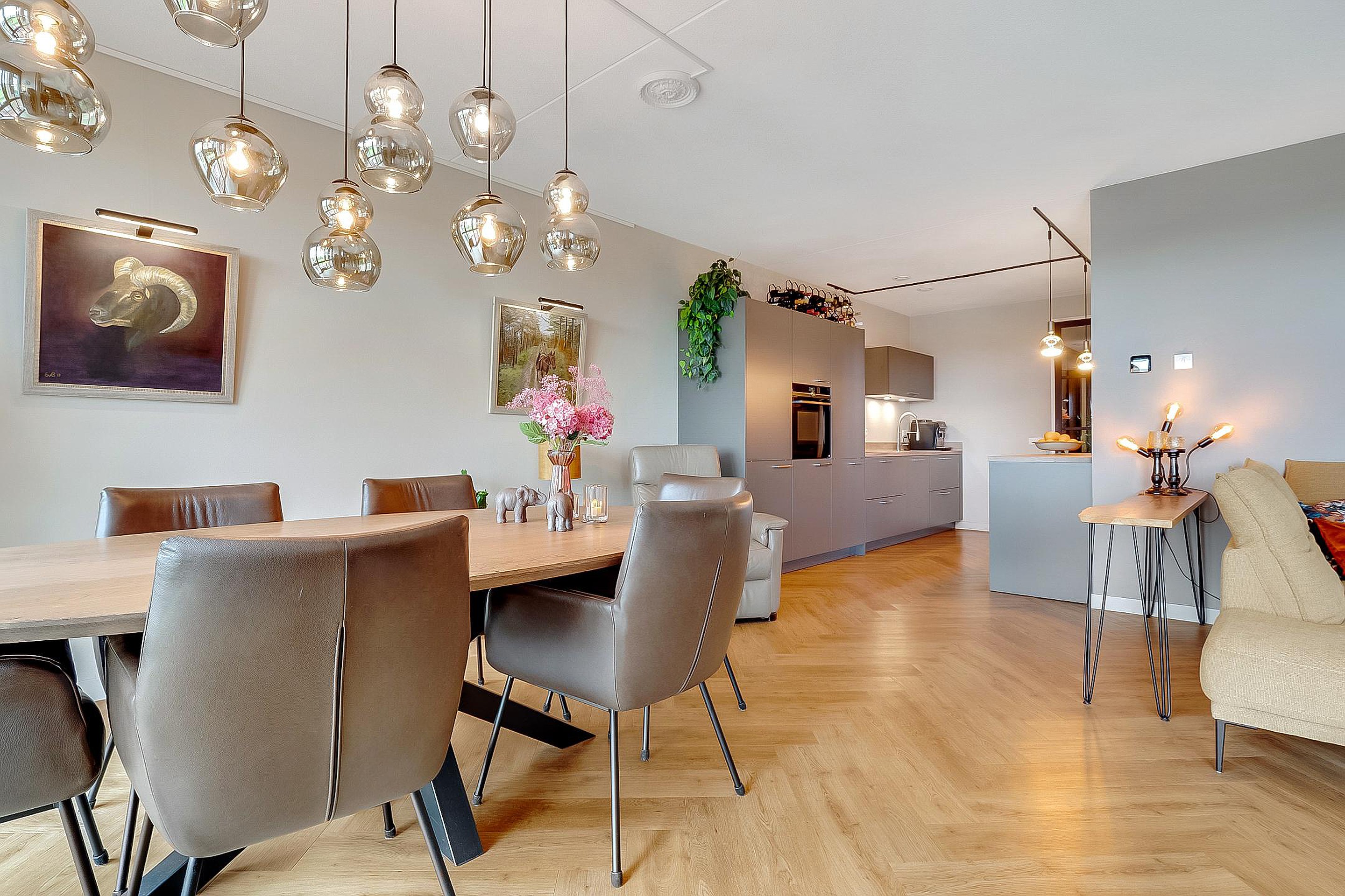 Rechts de moderne luxe keuken en de eettafel. Er is meer dan voldoende ruimte voor een grote 6 persoons eettafel.