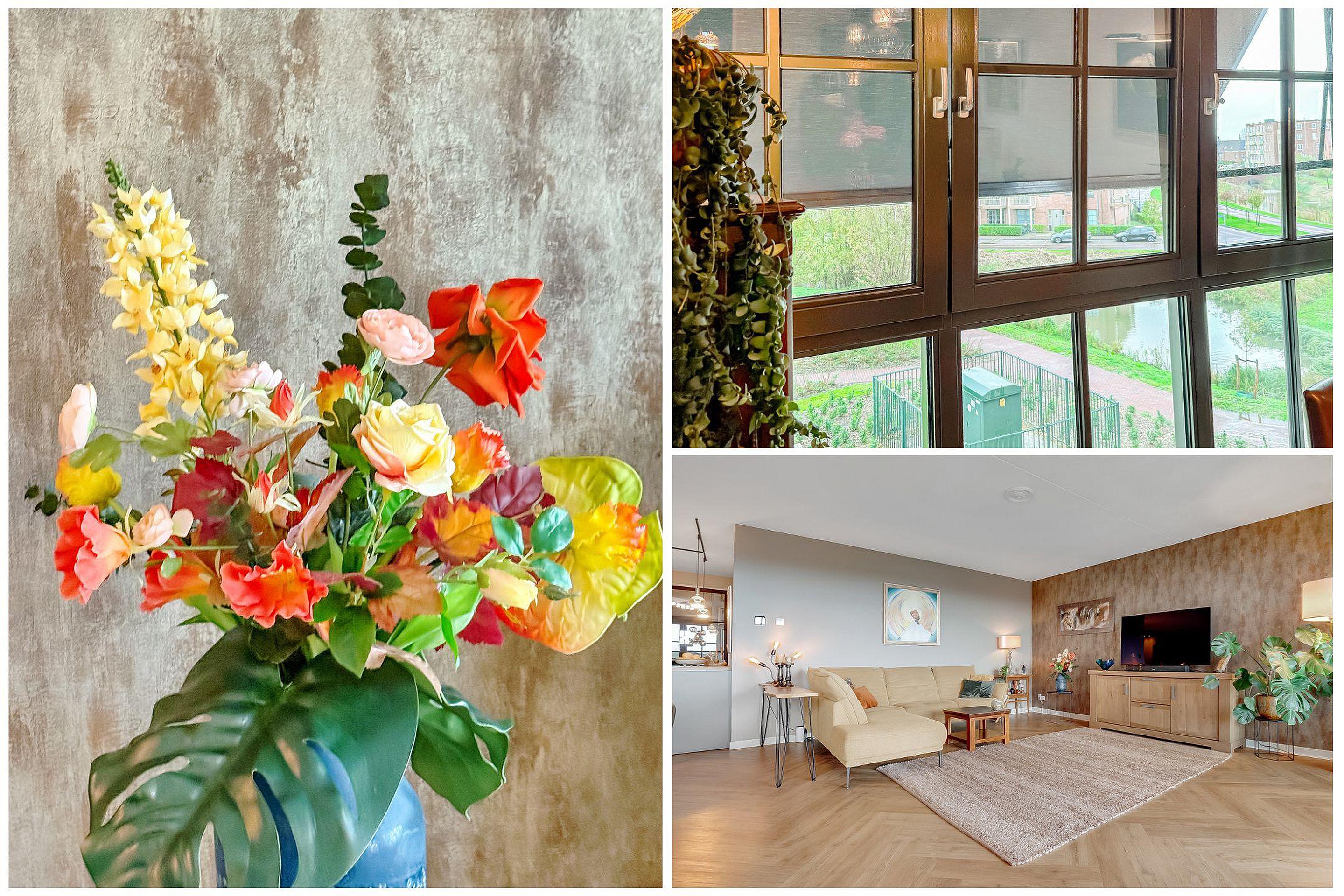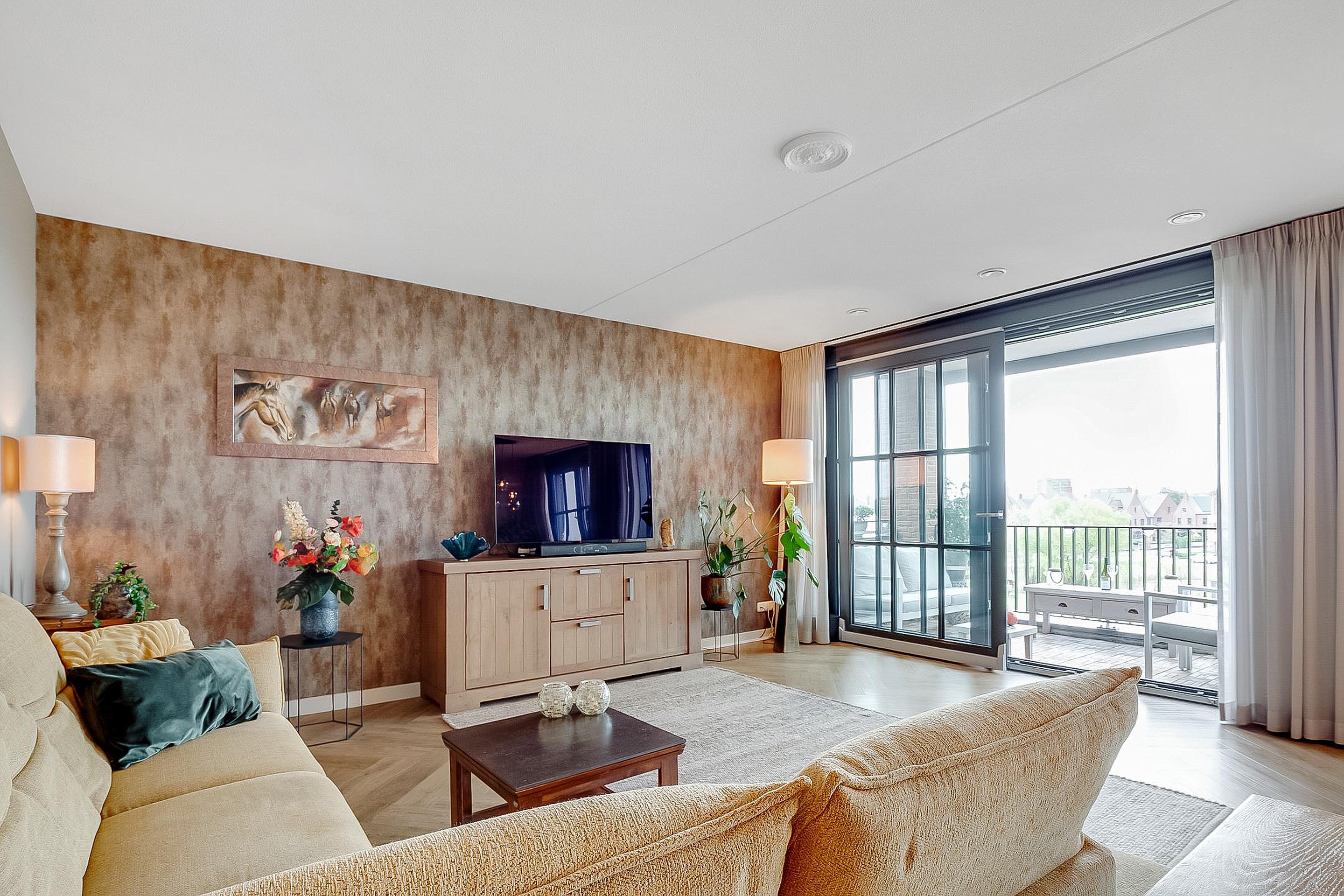 Voor de ramen in de woonkamer hangt een elektrisch bedienbaar (uitval)zonnescherm en het balkon is voorzien van een hordeur en elektrisch bedienbare screen.