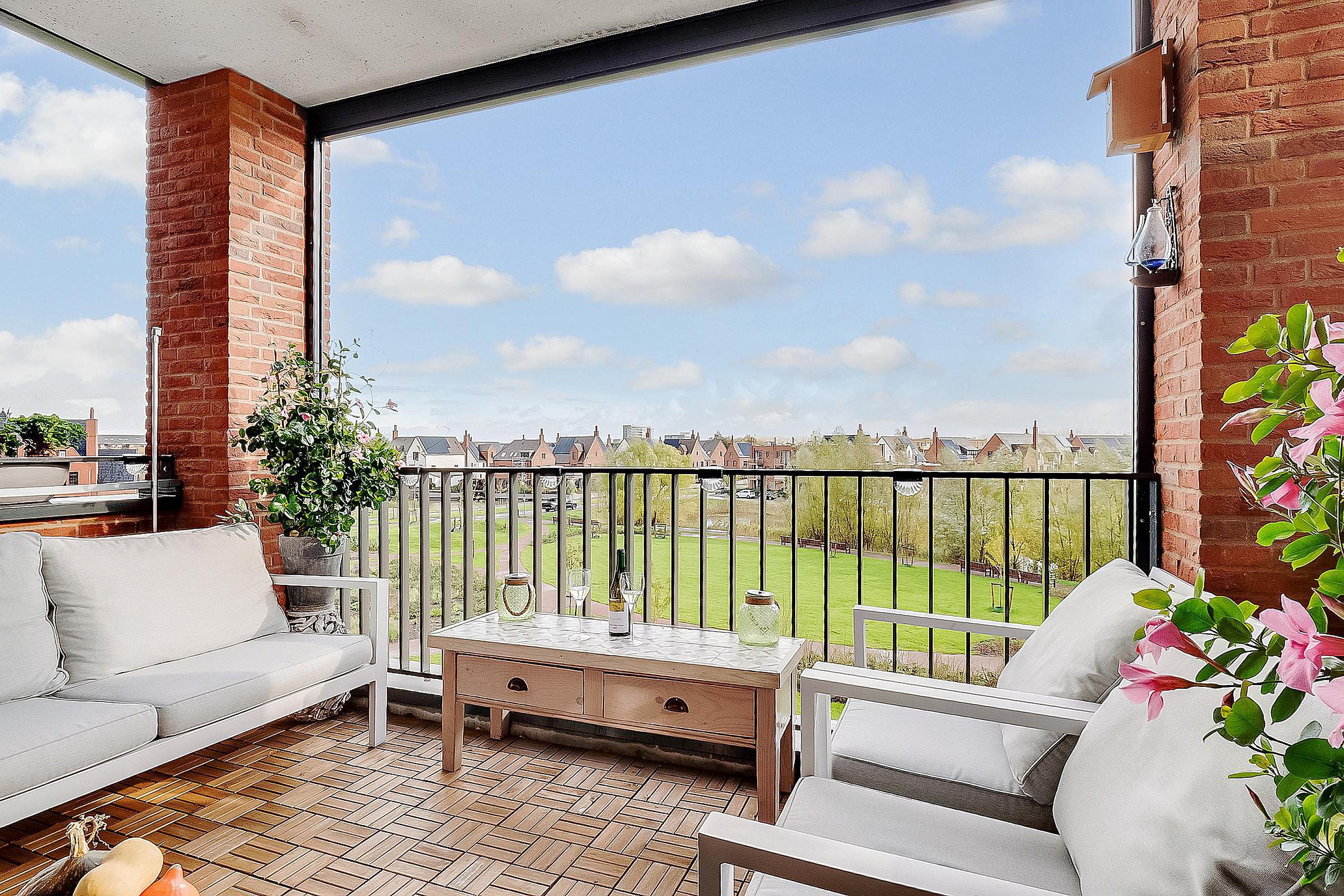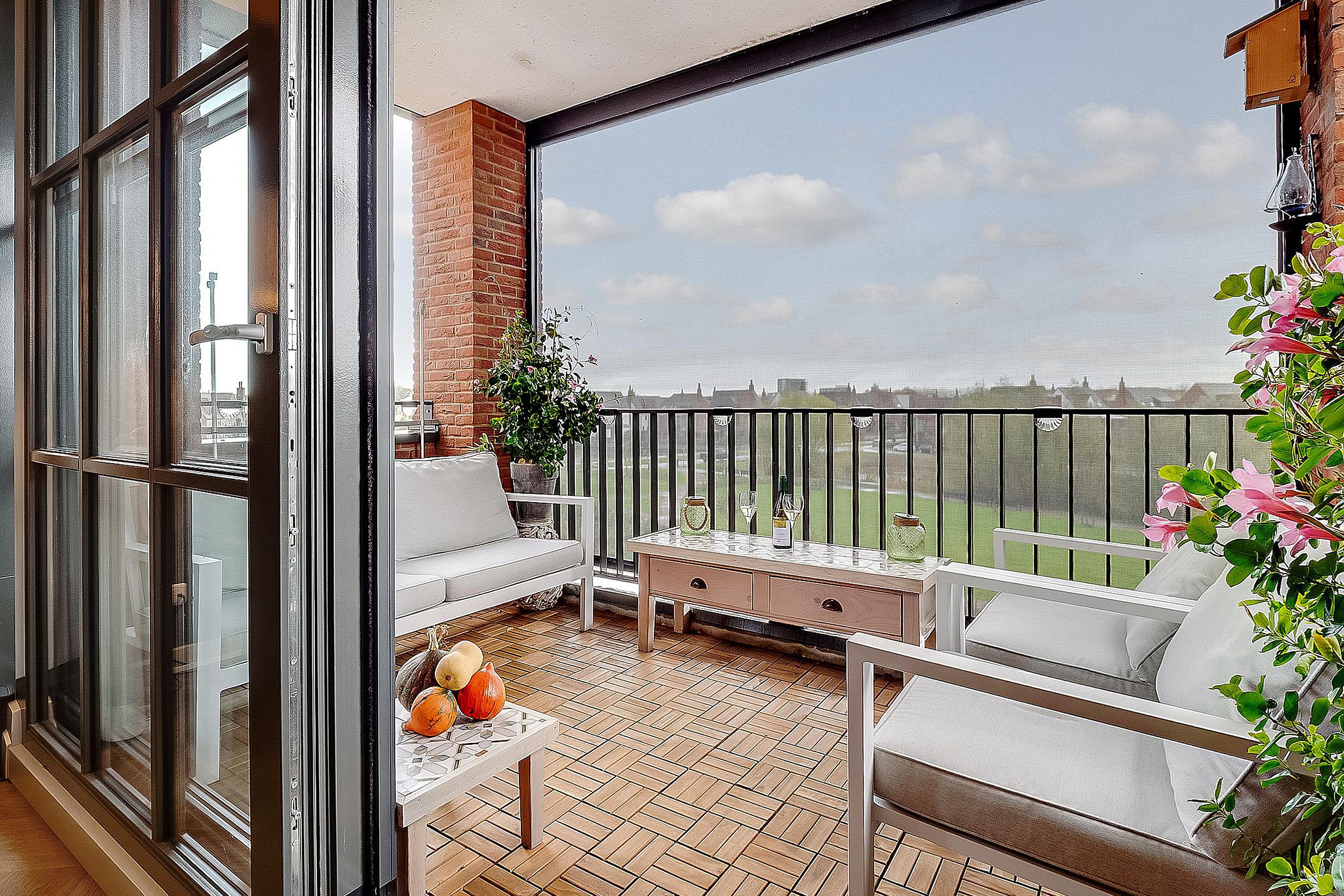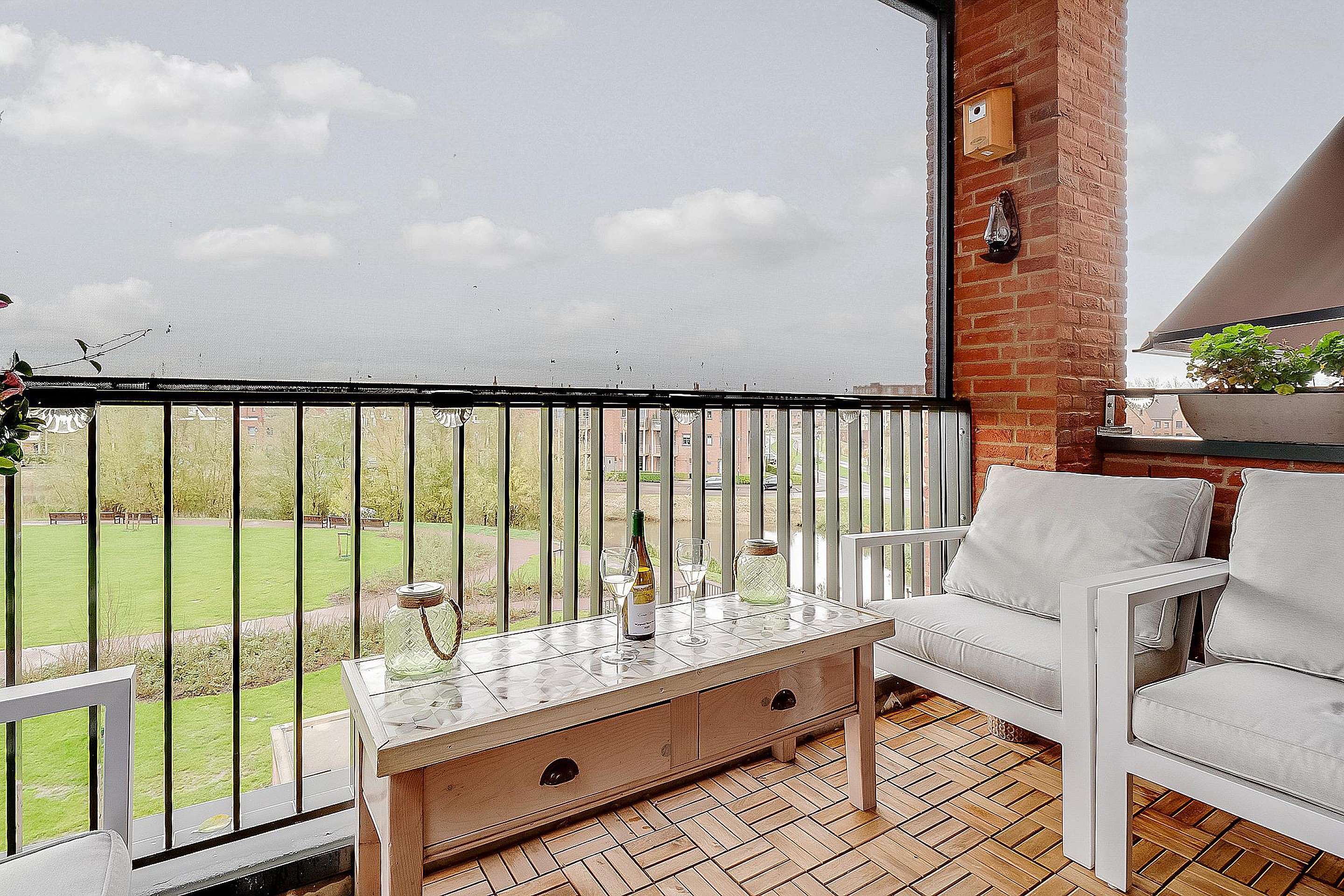 Het zonnige balkon en het uitzicht op de ‘Engelse siertuin’ benadrukt de ruim opgezette woonomgeving.
