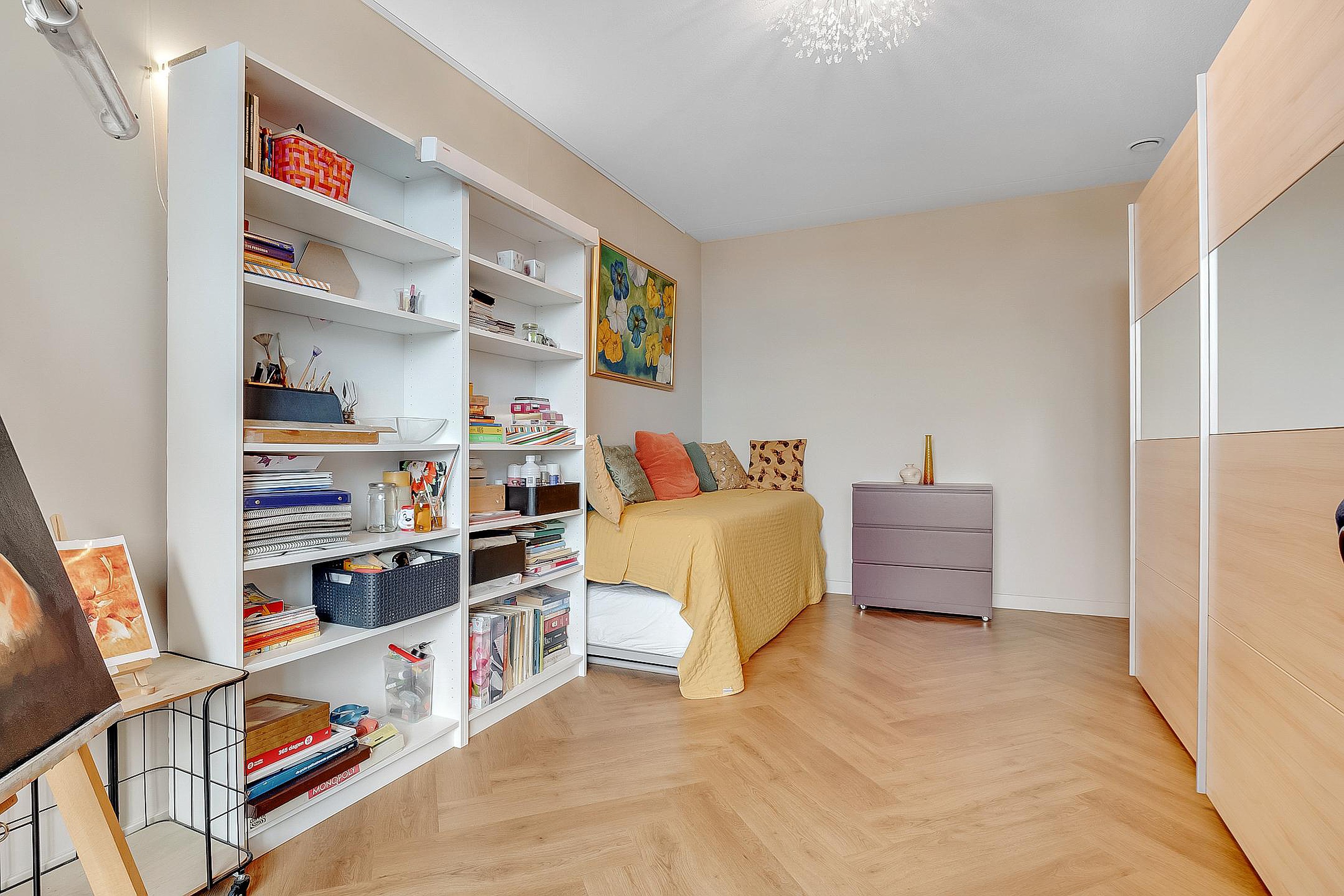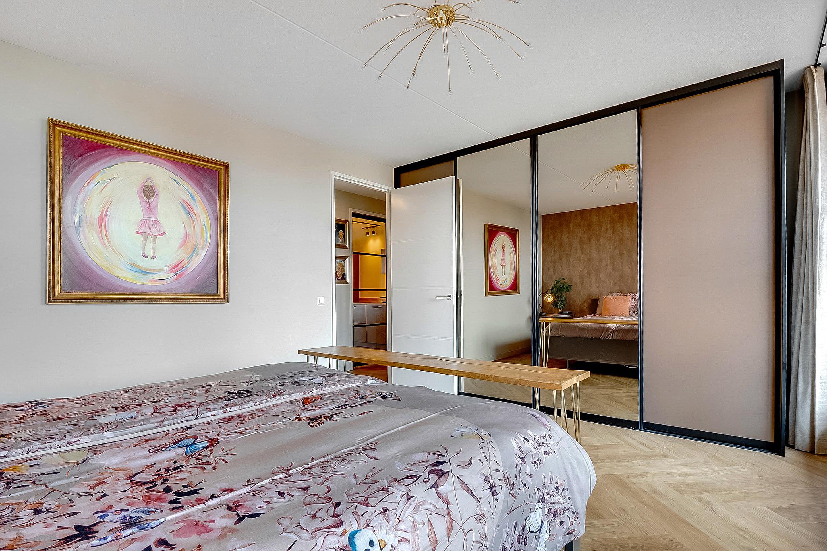 Verder zijn er twee ruime slaapkamers waarvan de grootste slaapkamer is voorzien van een vaste kledingkast met schuifdeuren.