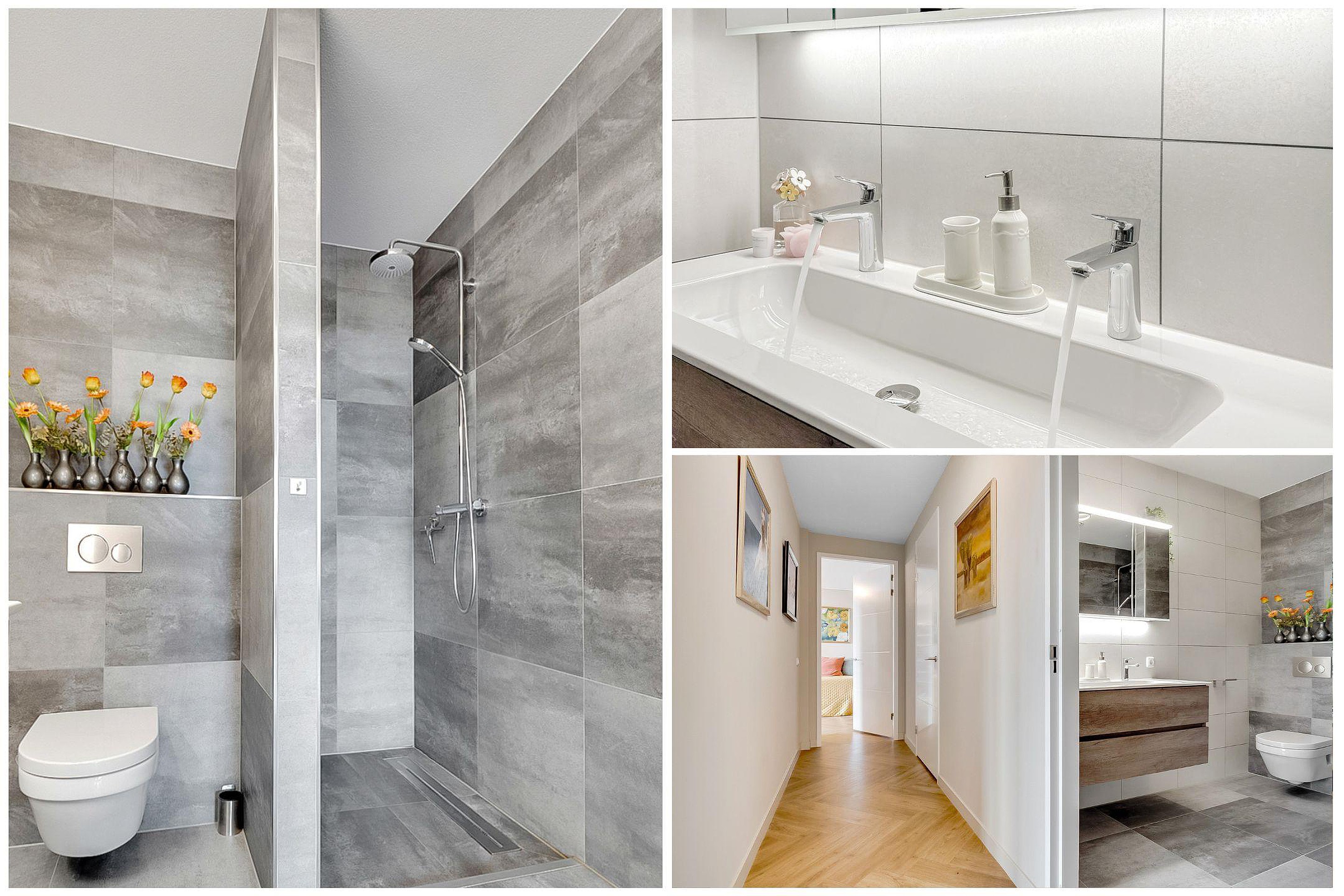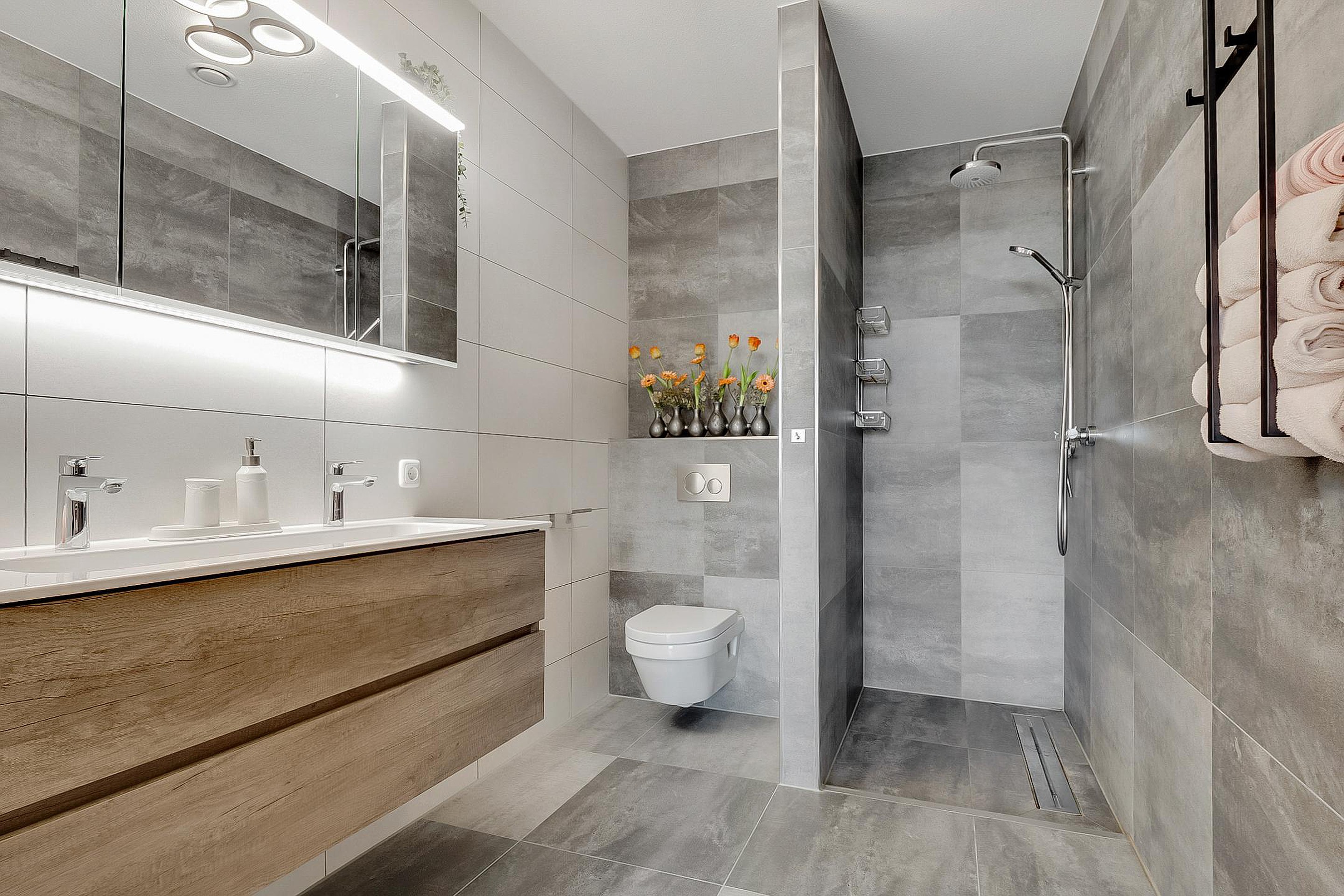 De moderne badkamer (kleurstelling grijs-wit) is compleet ingericht en voorzien van een inloopdouche, toilet en wastafelmeubel met twee kranen en spiegelkast met verlichting.