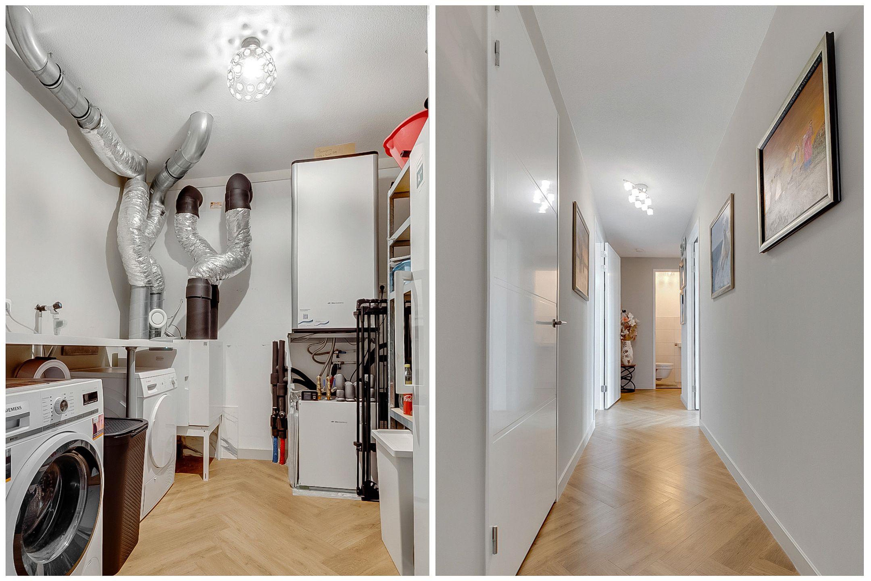 Naast de badkamer de wasruimte met aansluitingen voor een wasmachine en droger. Verder in deze ruimte de warmtepompinstallatie en het Wtw-ventilatiesysteem. Tevens staat hier een XL-vriezer met 6 lades.