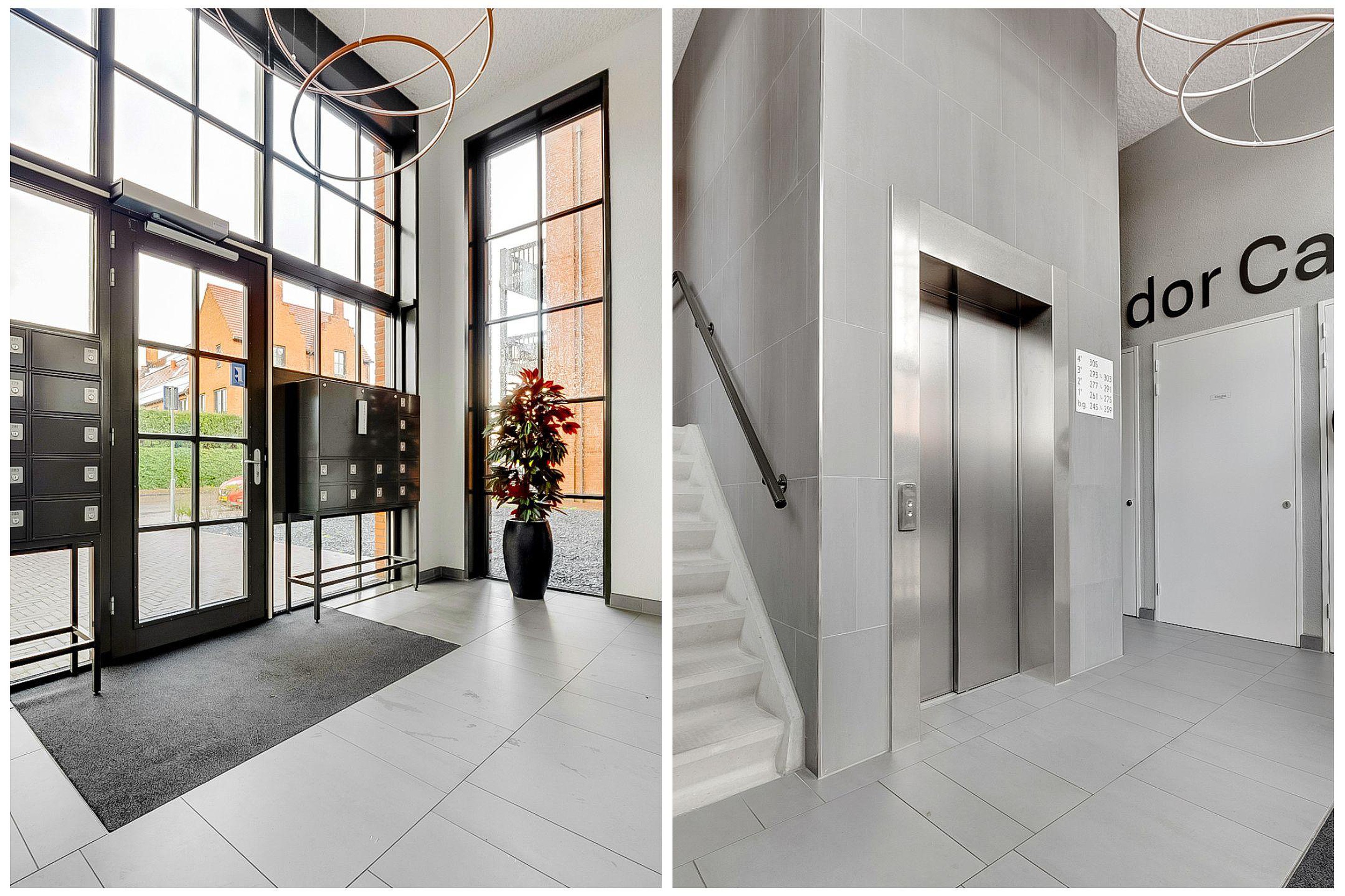 Entree, hal, brievenbussen, trap en lift naar verdiepingen.