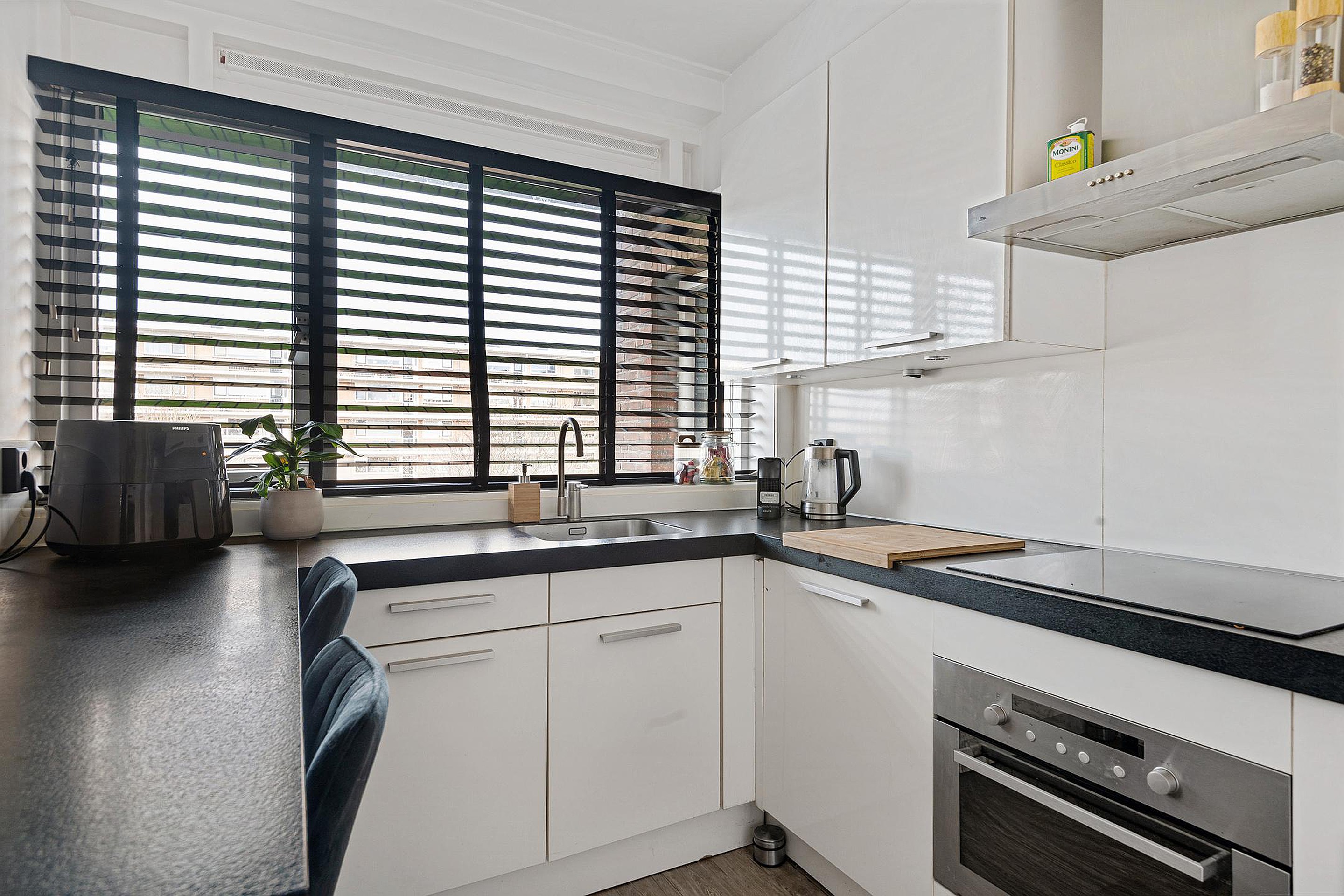 De moderne keuken is uitgerust met witte fronten, een donker werkblad en diverse inbouwapparatuur, waaronder een inductiekookplaat, afzuigkap, oven en koel-/vriescombinatie.