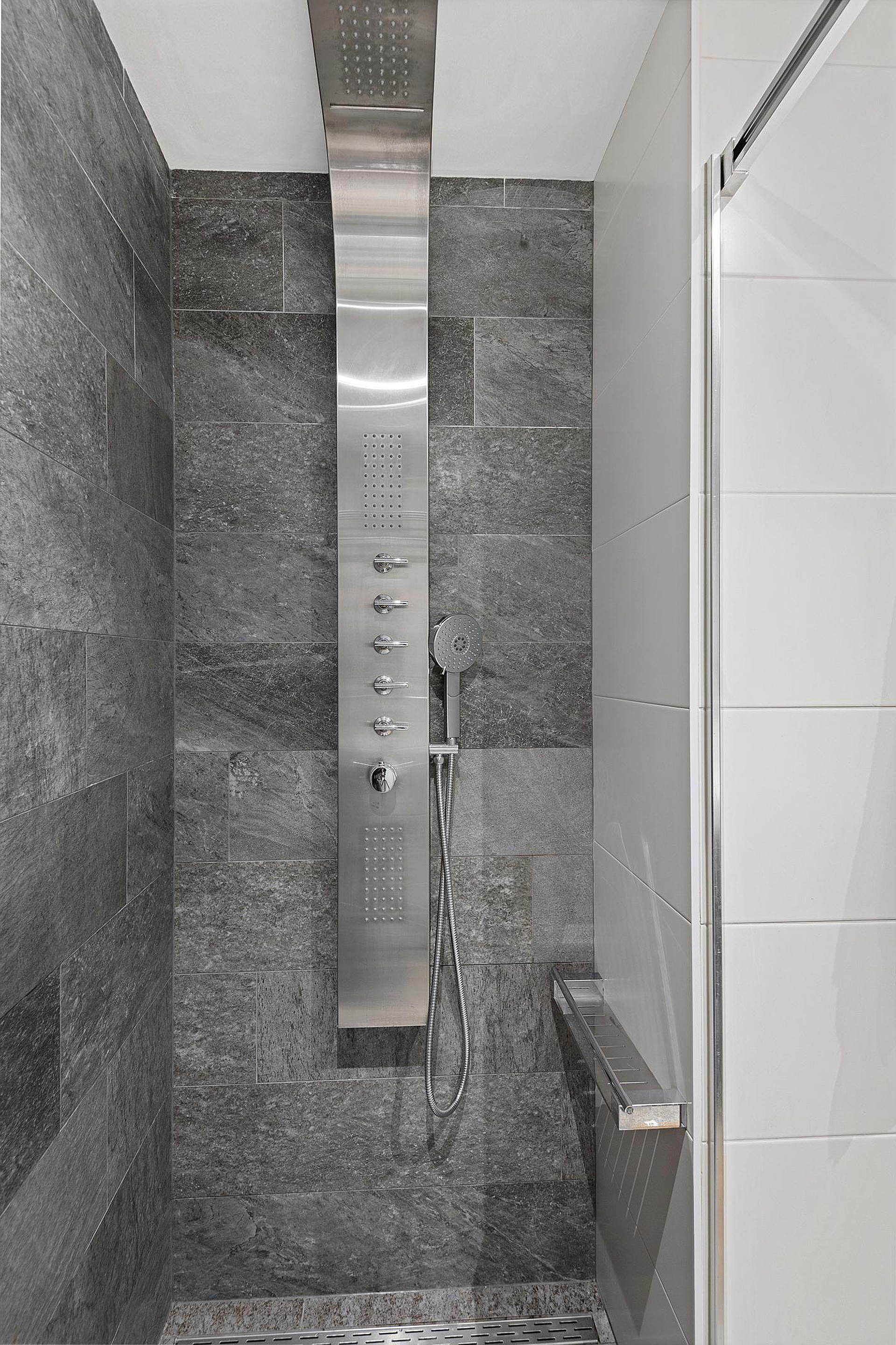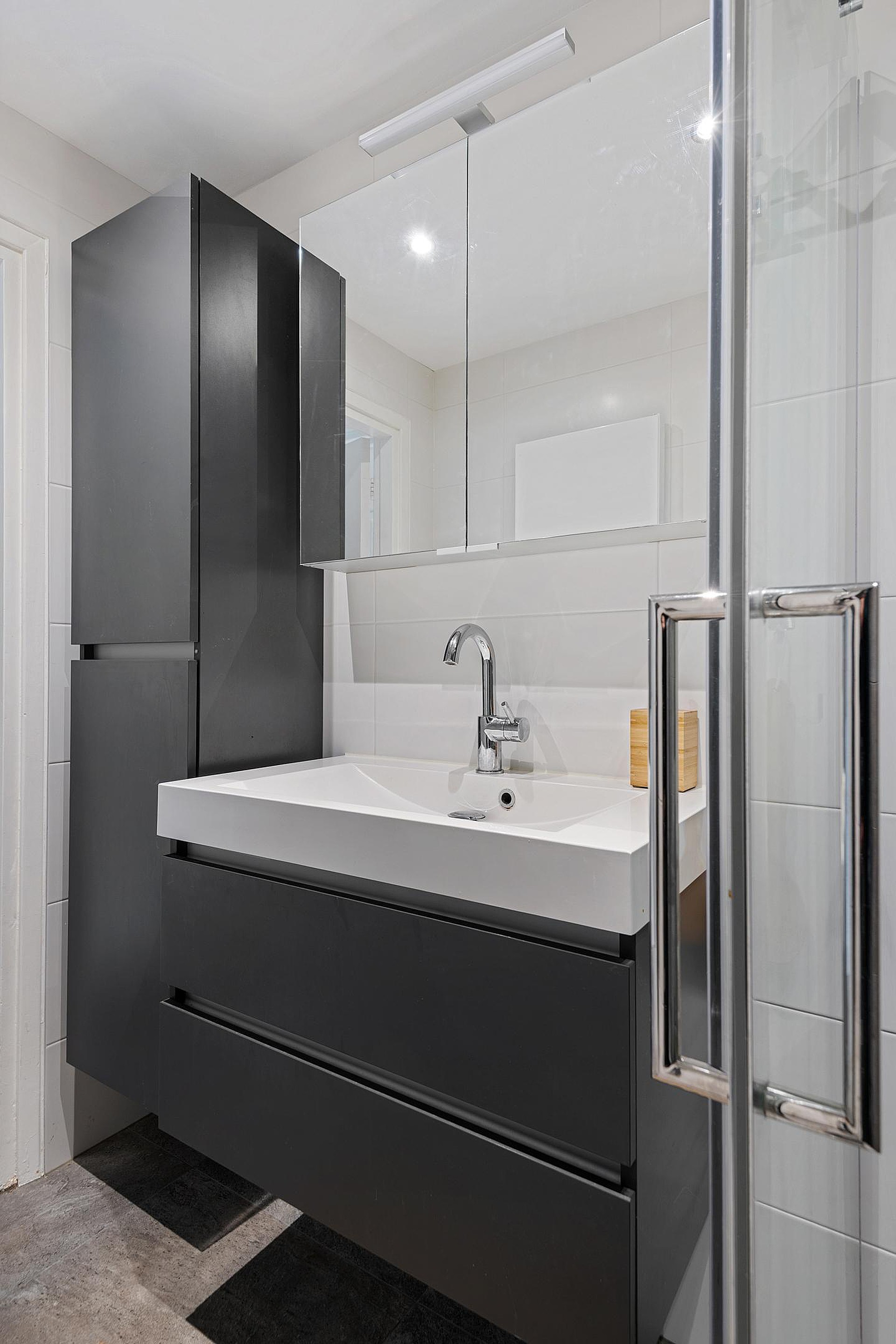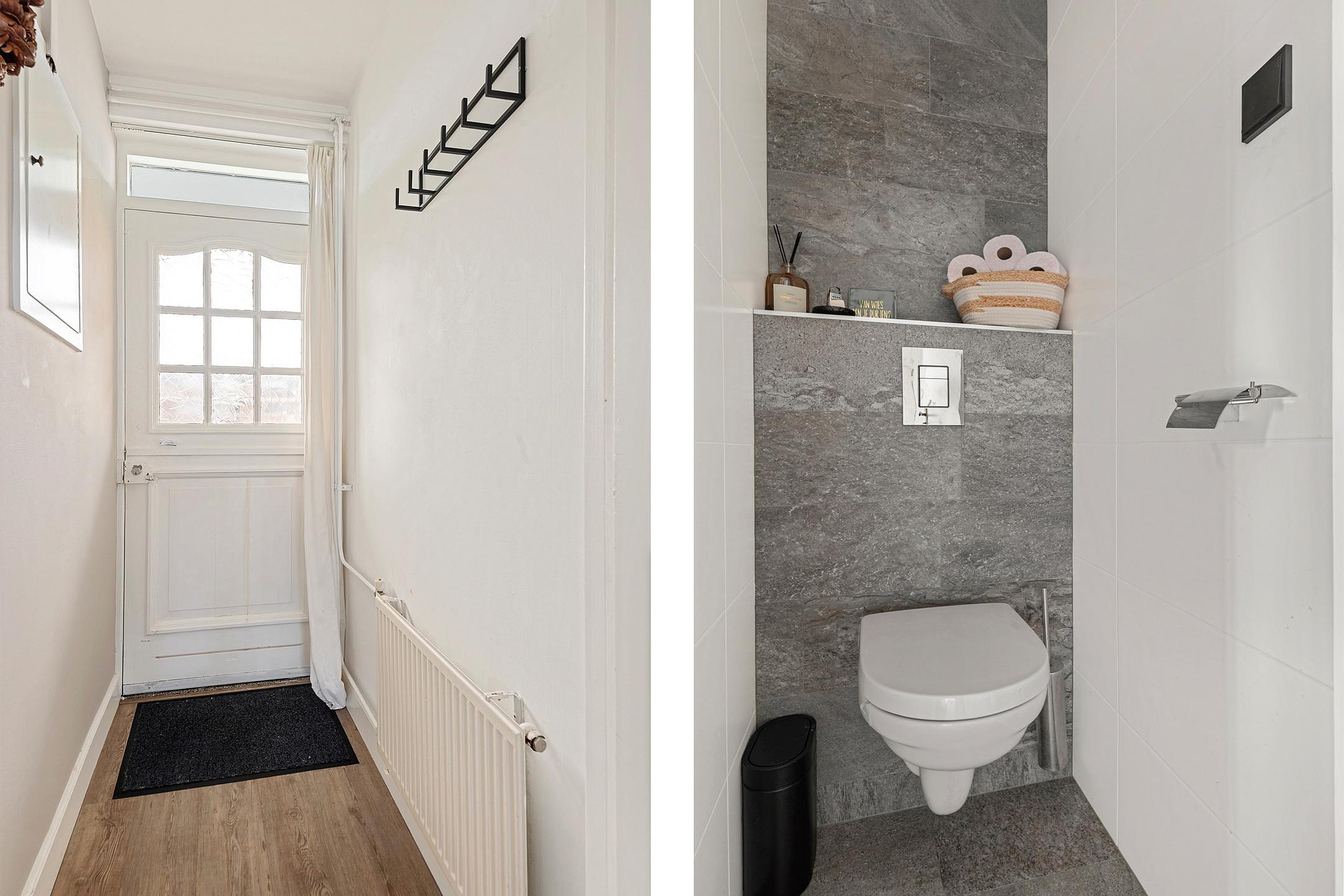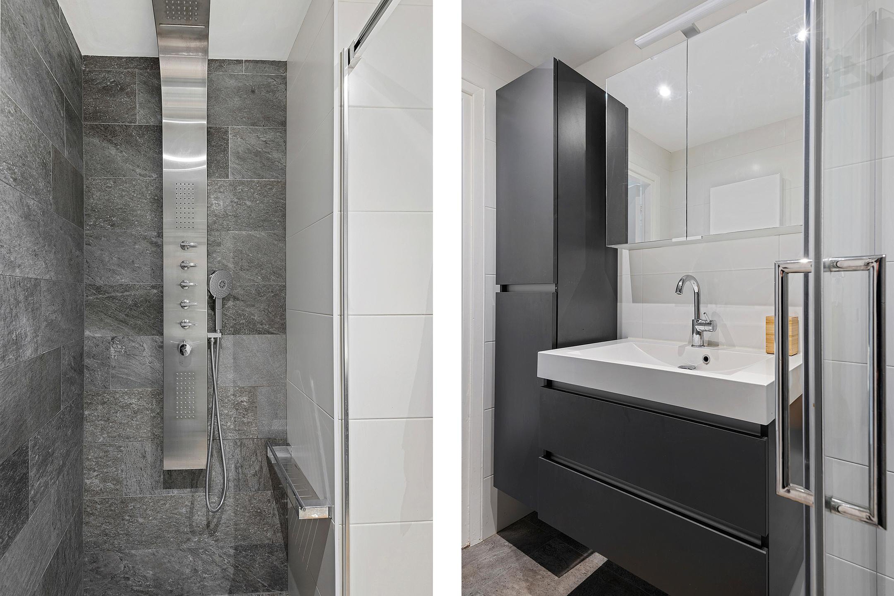 De badkamer is zeer netjes betegeld en voorzien van een heerlijke inloopdouche, zeer fraai wastafelmeubel en een design radiator. Het toilet is modern betegeld en separaat.