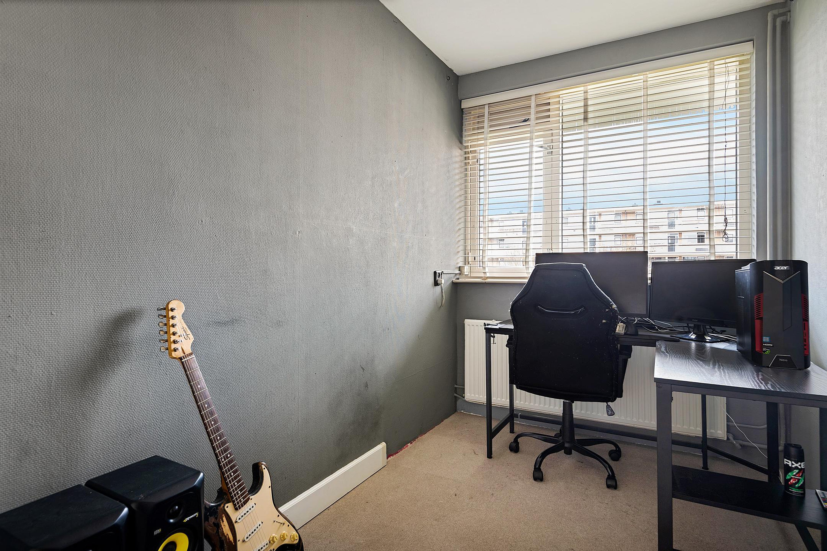 De lichte woonkamer is praktisch in te richten en biedt dankzij de hoekligging extra ramen voor veel natuurlijk daglicht. Een prettige ruimte om te ontspannen of gasten te ontvangen.