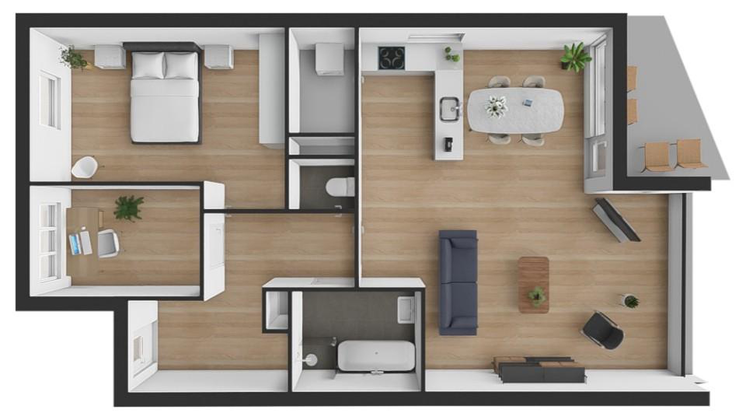 Wat te denken van een royale woonkamer met half-open keuken, een complete badkamer en twee comfortabele slaapkamers.
