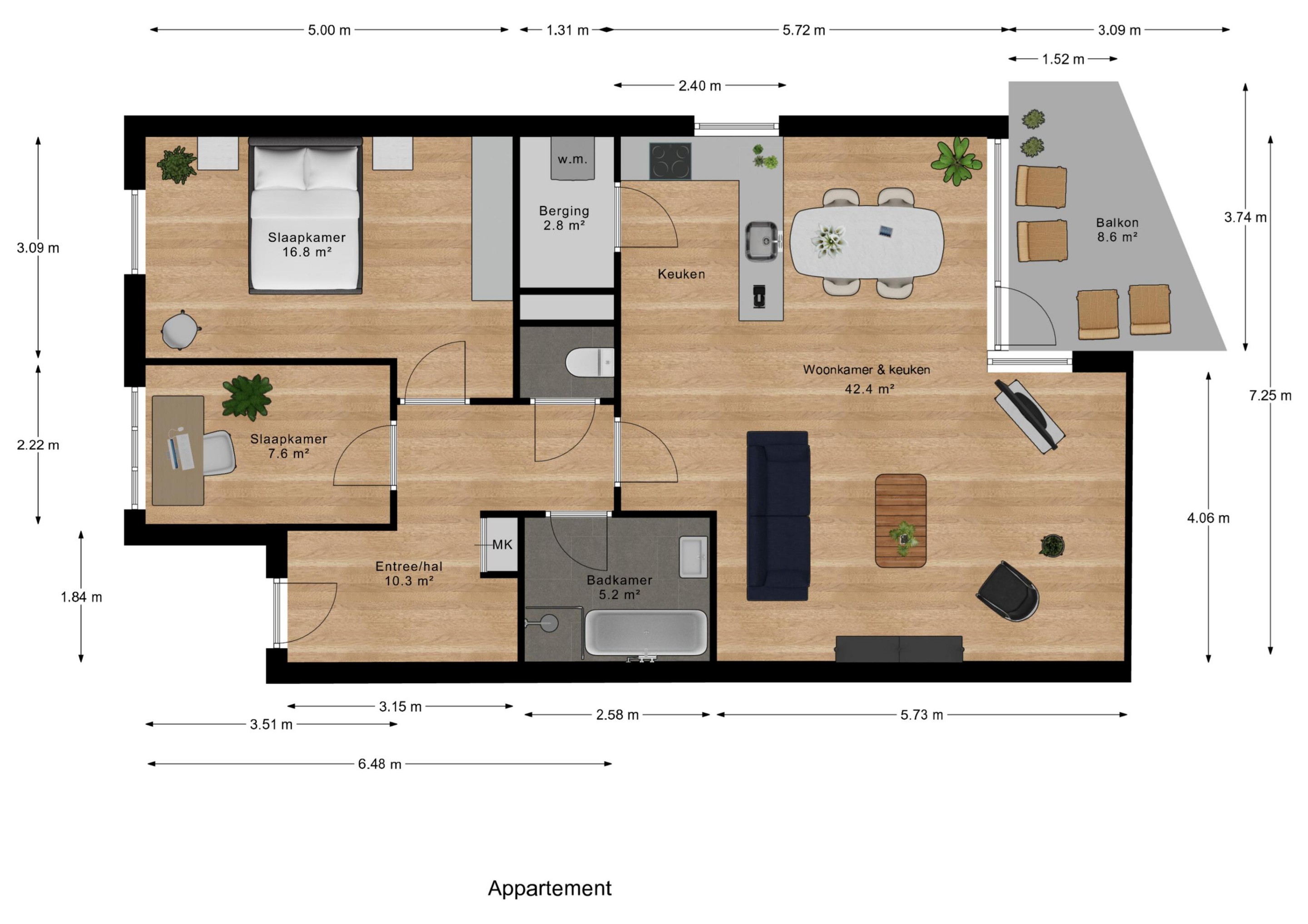 Aan de andere zijde van het appartement bevinden zich de twee slaapkamers. Beide hebben een prima bruikbaar formaat, maar de grootste is wel heel lekker ruim te noemen. Afmetingen zijn 17 en 8 m2.