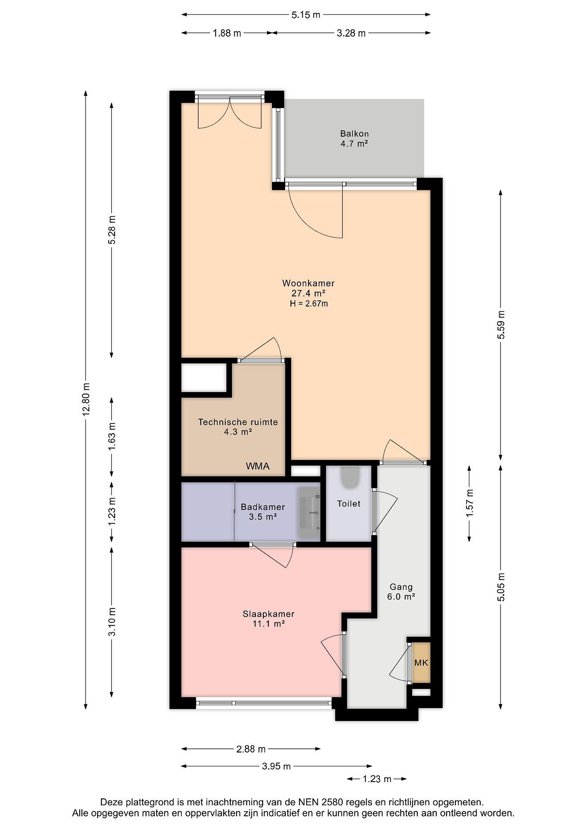 Deze woning is gemeten volgens de Meetinstructie. De Meetinstructie is gebaseerd op de NEN2580. De Meetinstructie is bedoeld om een meer eenduidige manier van meten toe te passen voor het geven van de gebruiks-oppervlakte. De Meetinstructie sluit verschillen in meetuitkomsten niet volledig uit, door bijvoorbeeld interpretatieverschillen, afrondingen of beperkingen bij het uitvoeren van de meting. Hoewel wij de woning met veel zorg en naar eer en geweten hebben opgemeten, kan het zijn dat er verschillen zijn in de afmetingen. De opgegeven maten zijn indicatief, er kunnen kleine verschillen zijn. Afhankelijk van de moeilijkheidsgraad van het te meten specifieke object kunnen deze verschillen groter of kleiner zijn. Indien de exacte maatvoering voor u van belang is, raden wij u aan de maten zelf te (laten) meten.