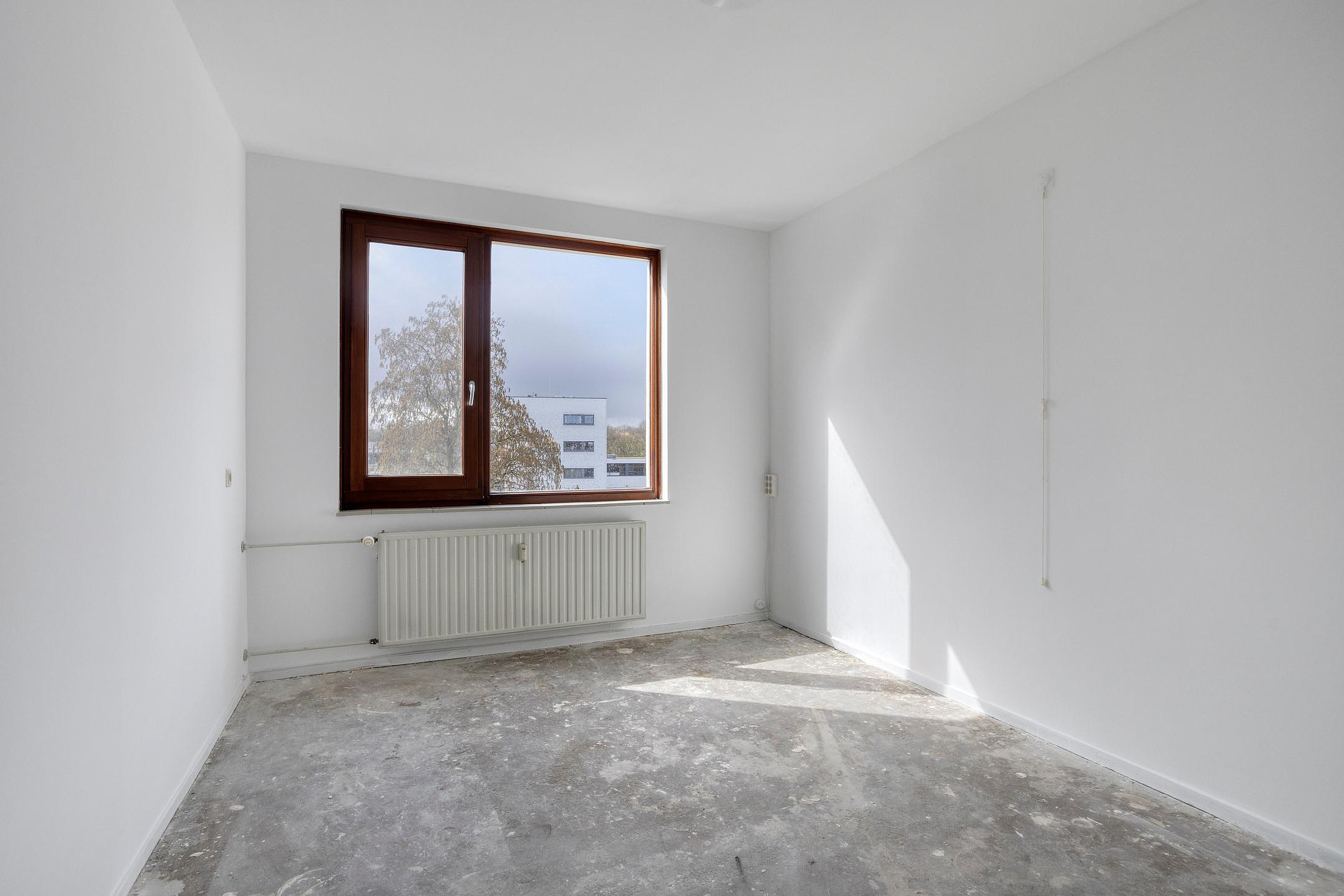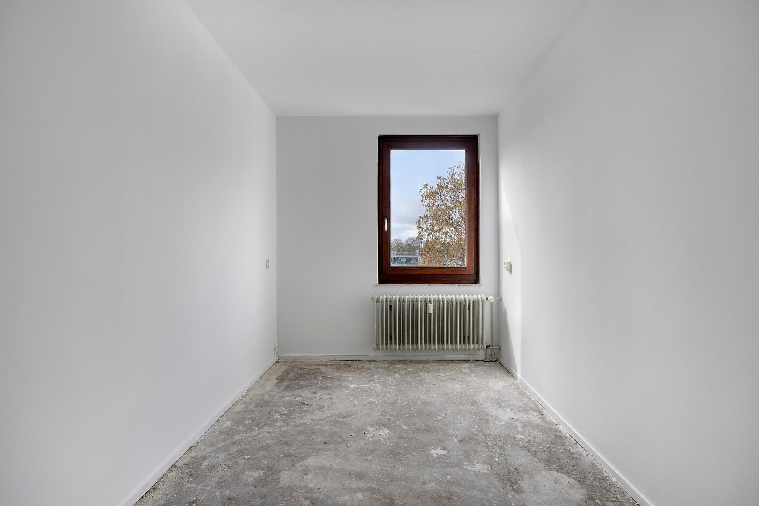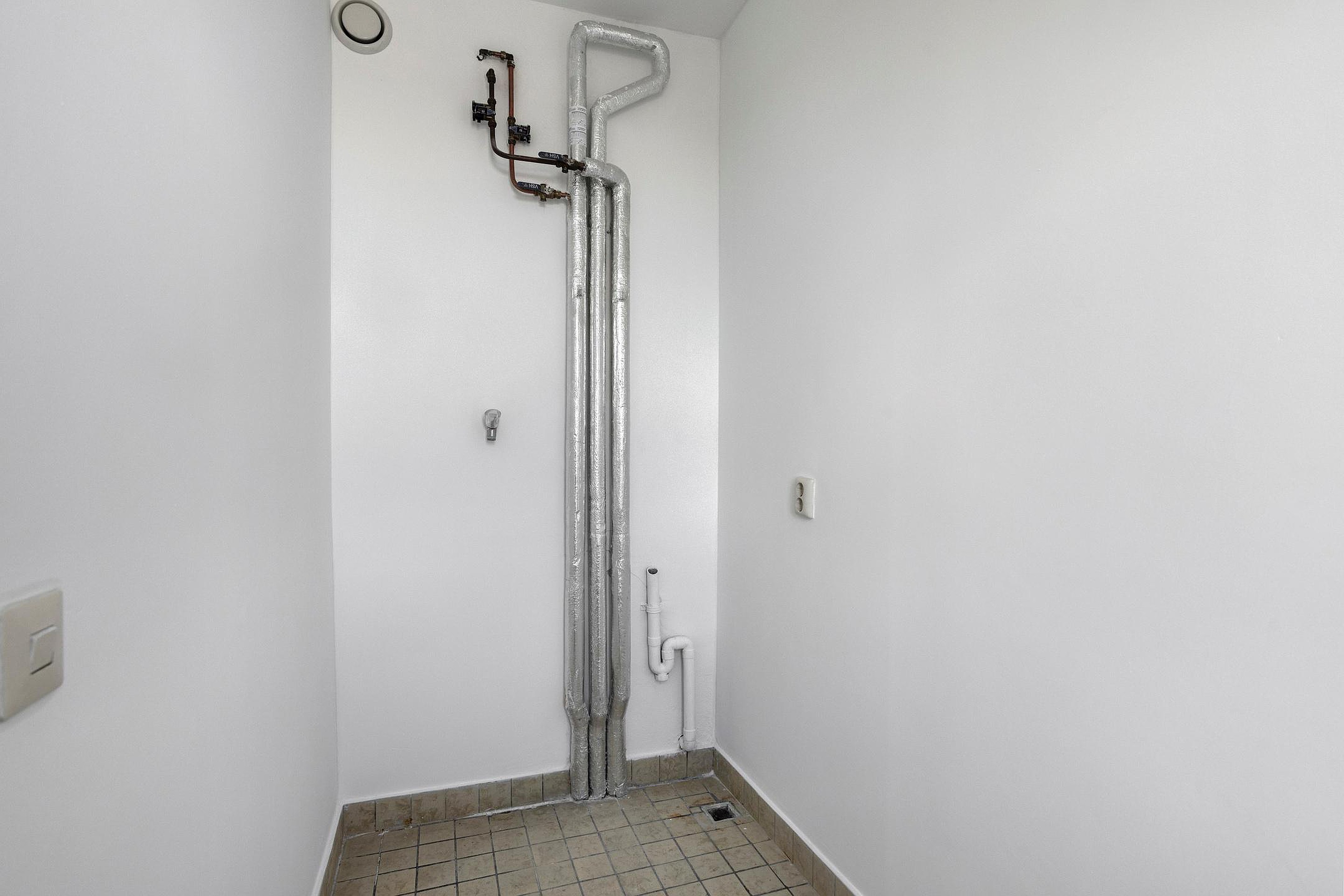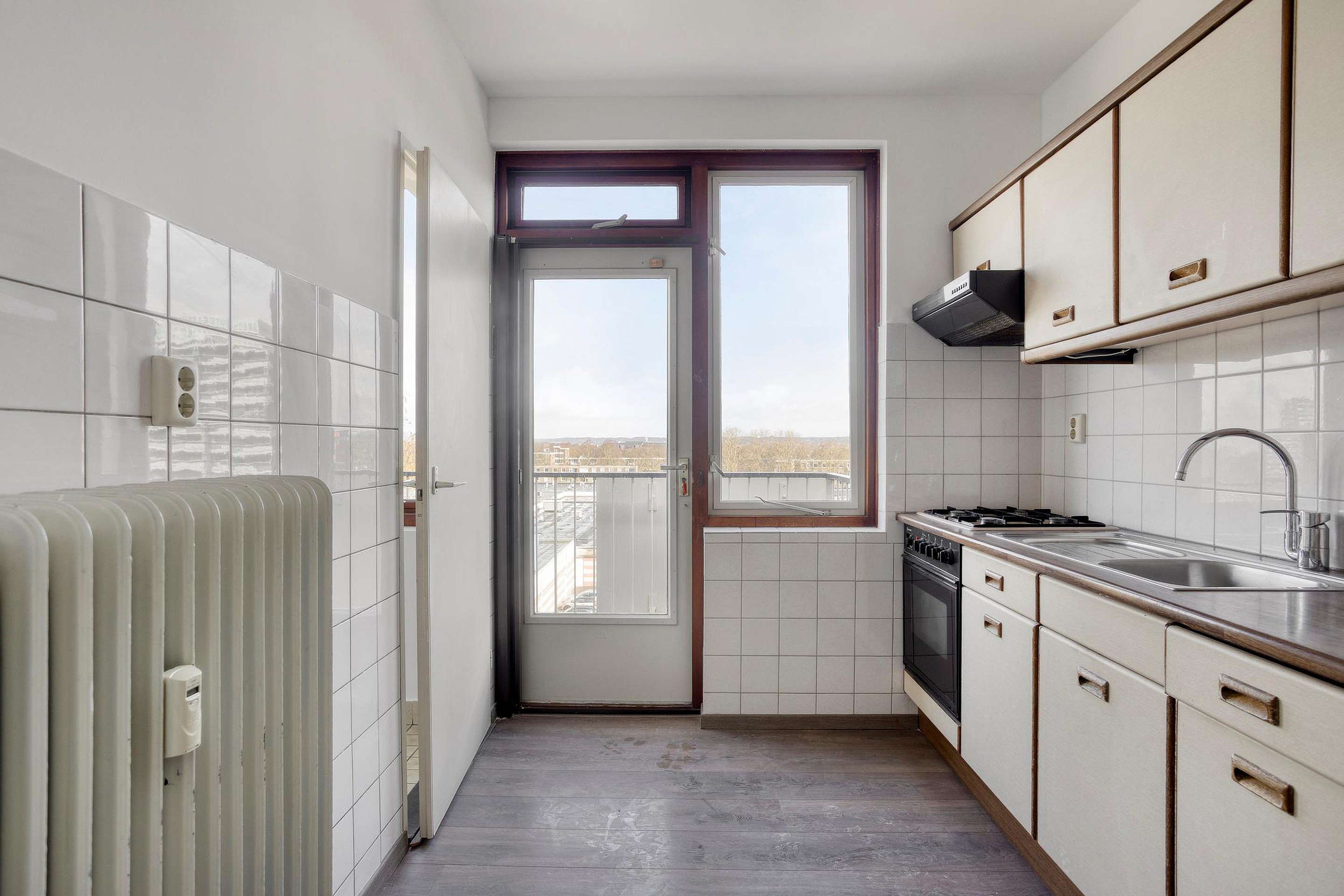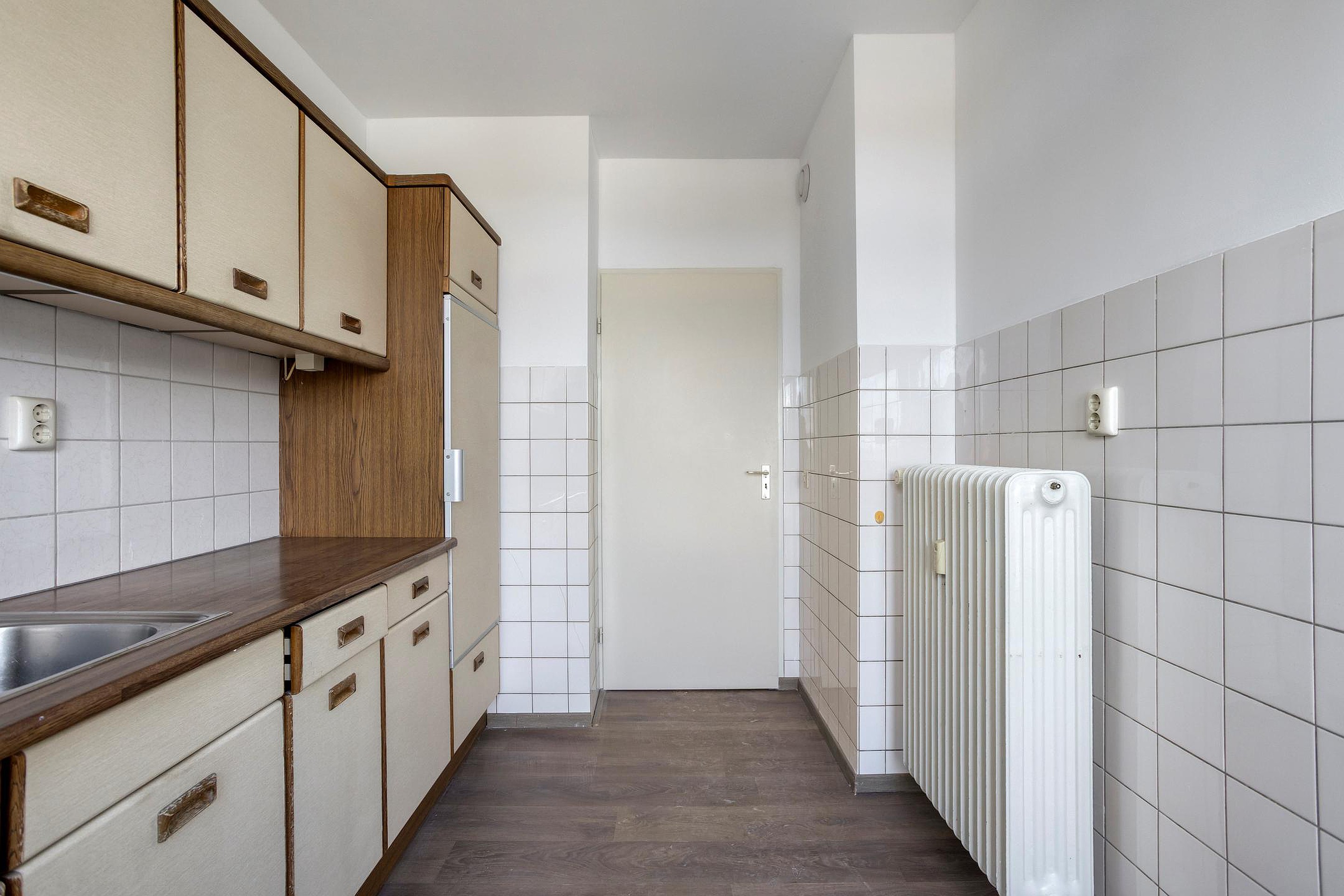 - Keuken met inbouwapparatuur (oven, gasfornuis, afzuigkap en koelkast), met toegang tot een separate wasruimte en het balkon aan de achterzijde met uitzicht op winkelcentrum Brusselse Poort