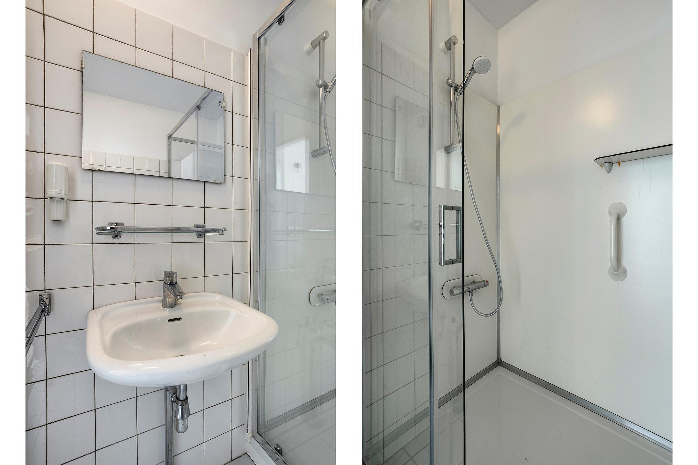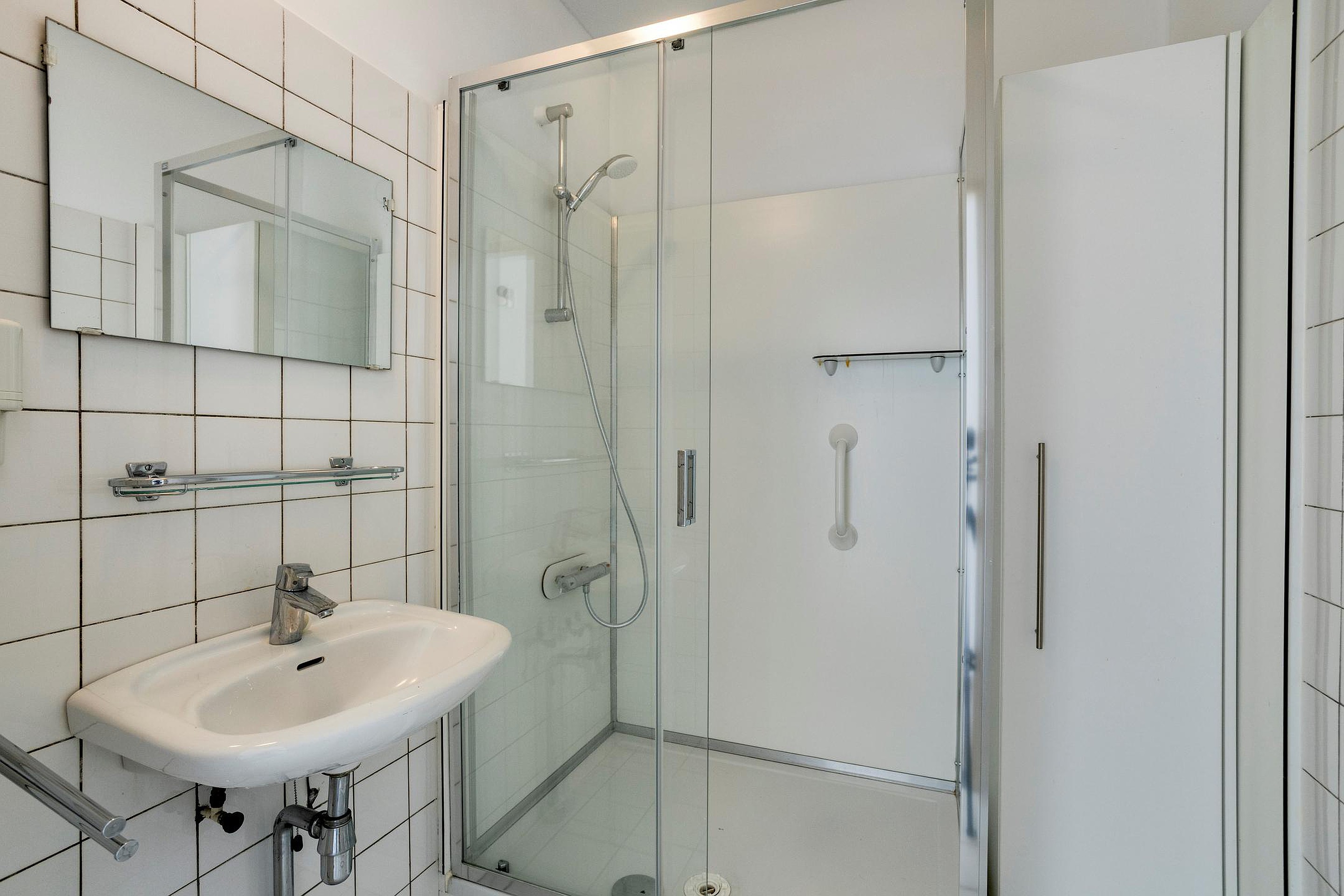 - Betegelde badkamer voorzien van wastafel en douchecabine