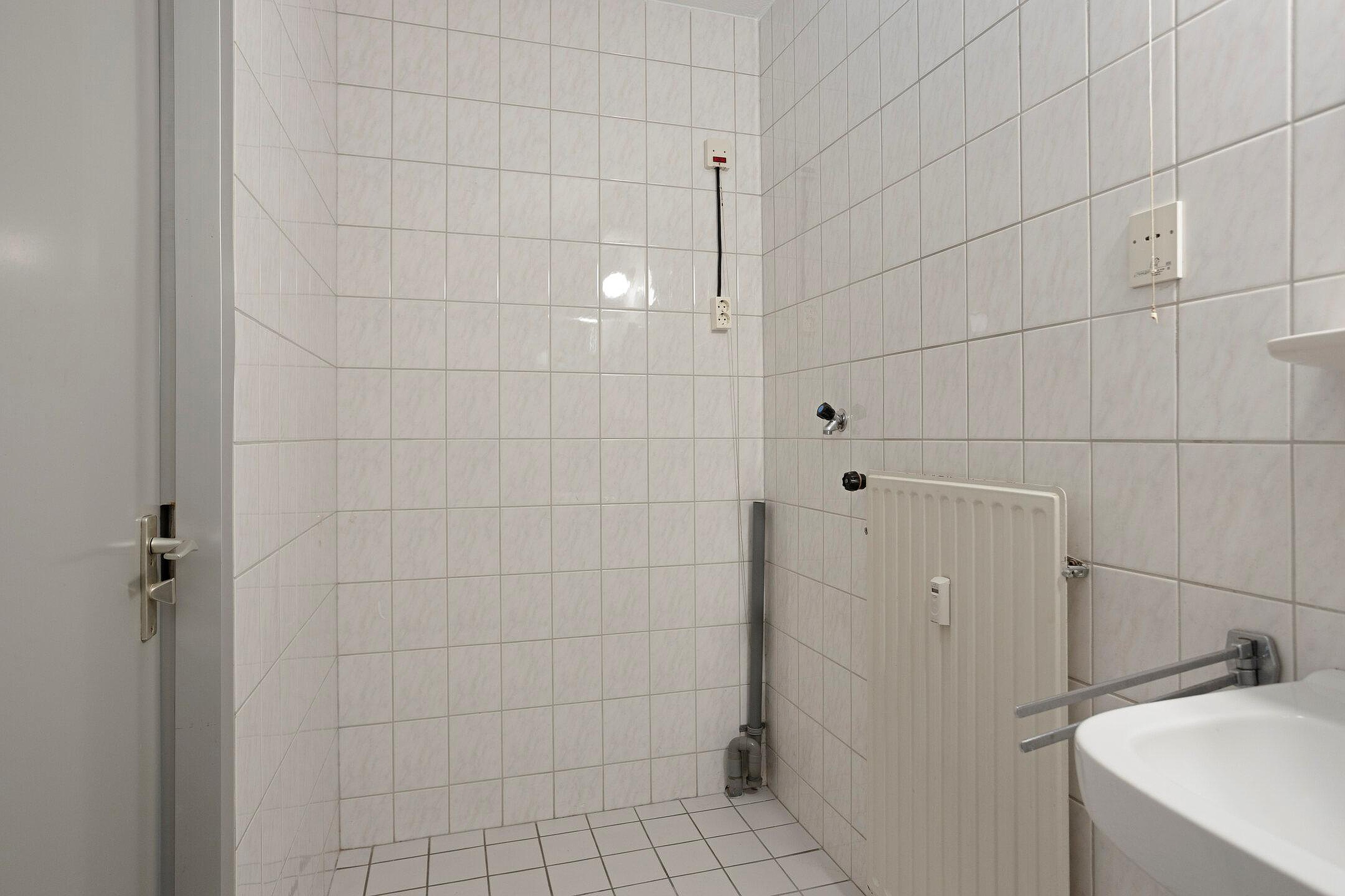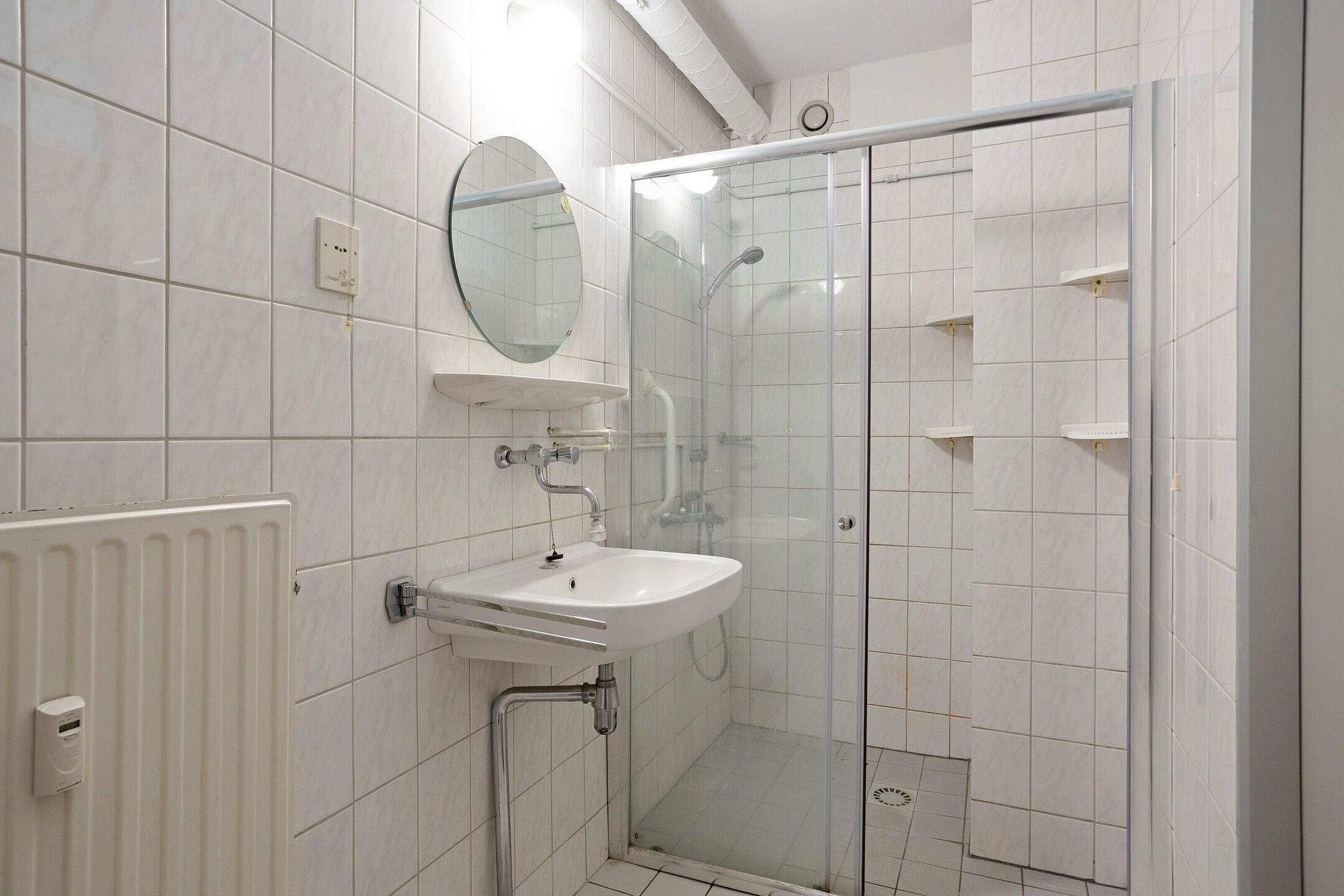 De badkamer beschikt over een douche, wastafelmeubel, spiegelkast en aansluiting voor wasmachine en droger. Het toilet met fonteintje is separaat gesitueerd, direct naast de badkamer.