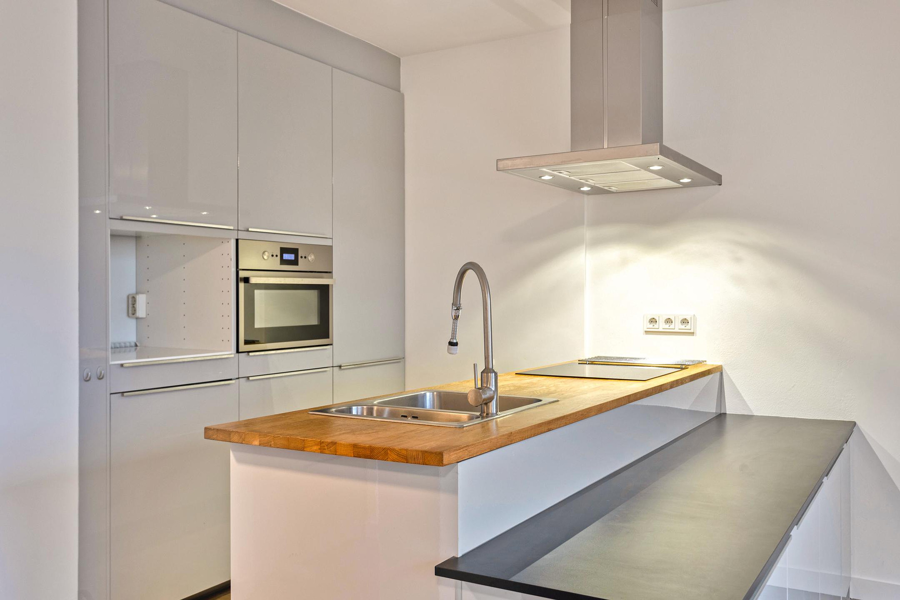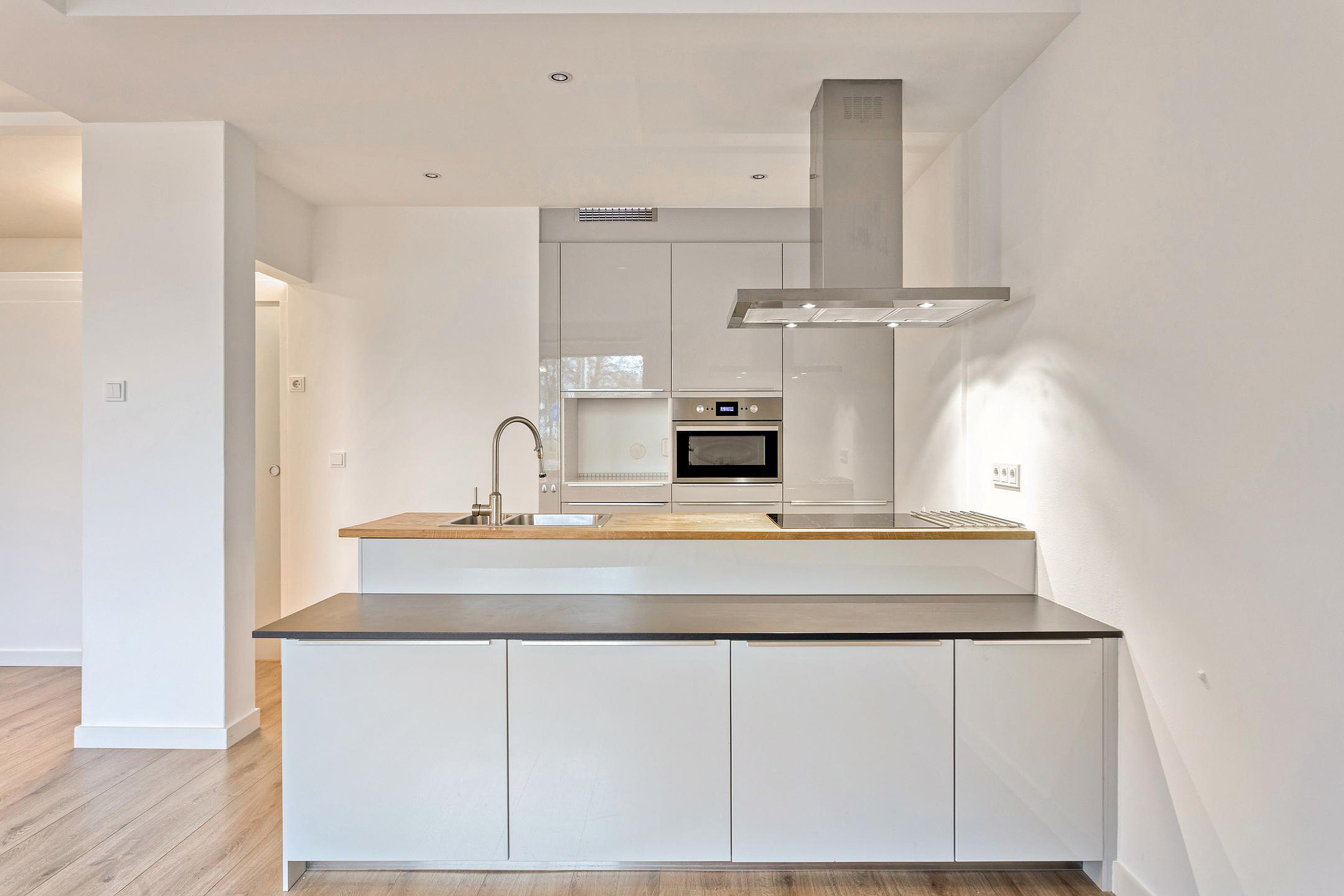 De open keuken is strak, modern en praktisch ingedeeld en biedt veel werk- en opbergruimte. De keuken is voorzien van een koelkast, vriezer, vaatwasser, combi-oven, 4-pits inductiekookplaat, afzuigkap en een dubbele spoelbak. Dit alles weggewerkt in een ruime kastenwand met apparatuur én een eiland met kookgedeelte en spoelbak. De nette afwerking en het hardhouten werkblad zorgen voor een hoogwaardige uitstraling.