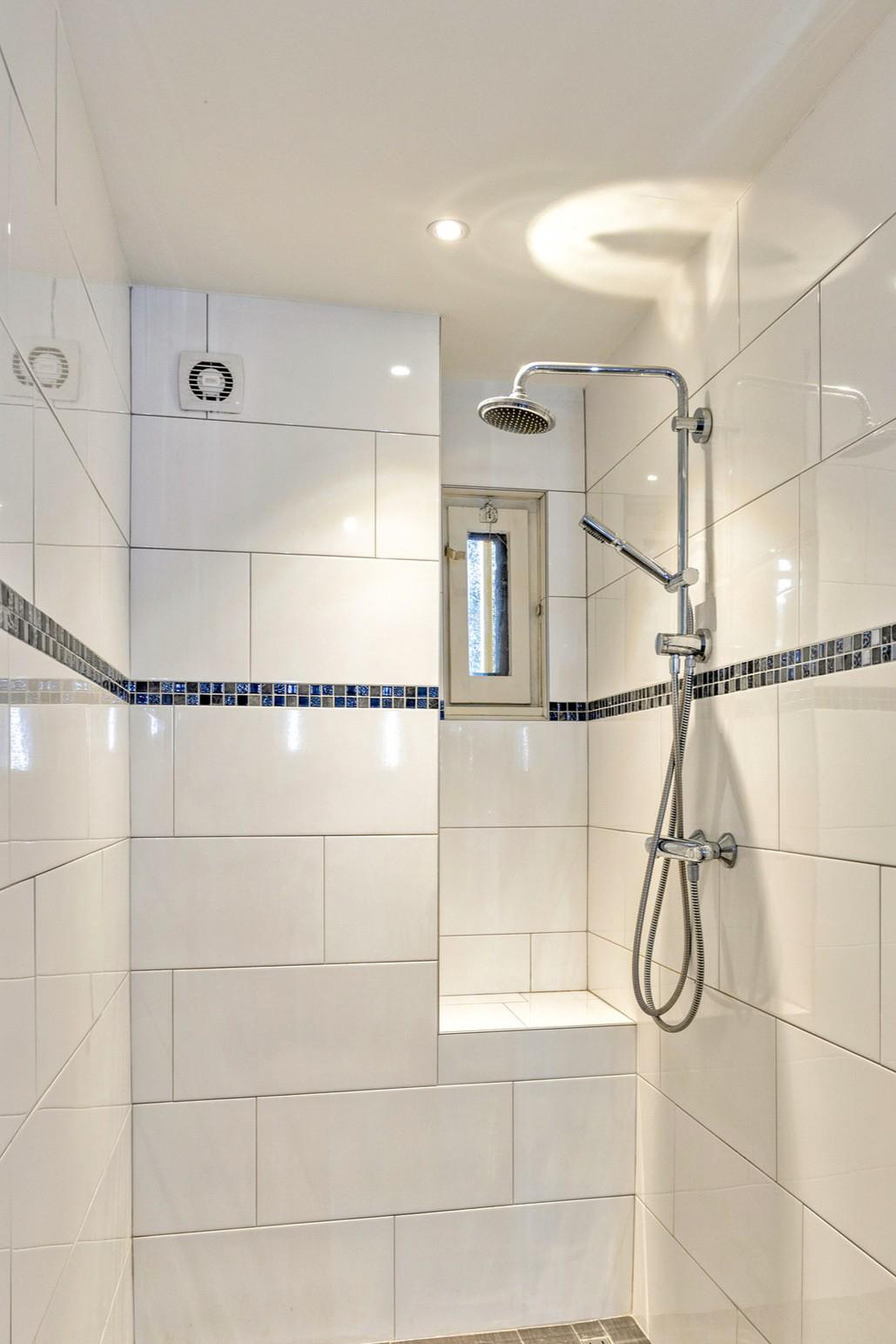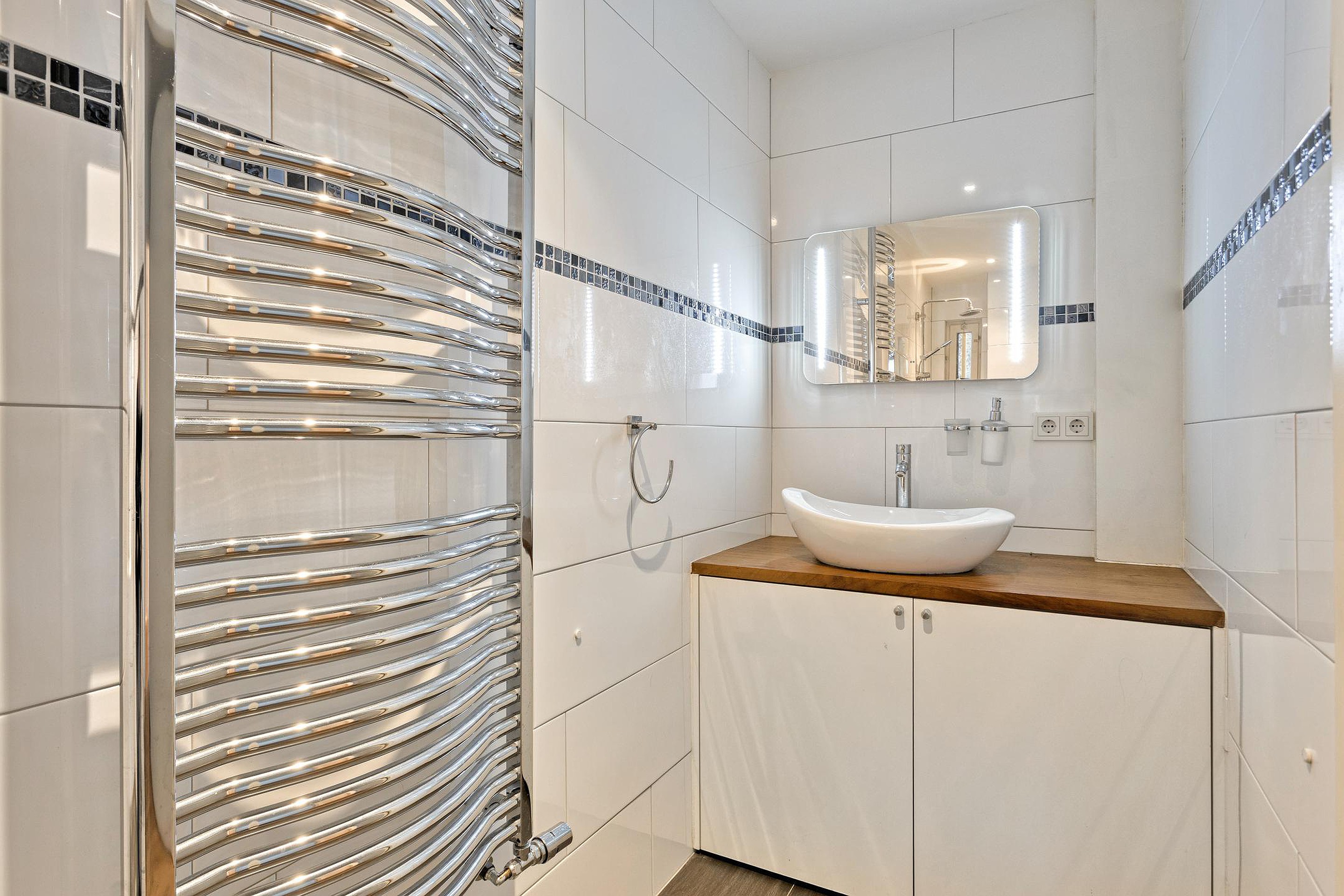 De badkamer beschikt over een moderne uitstraling en is voorzien van een wastafel en een ruime inloopdouche.