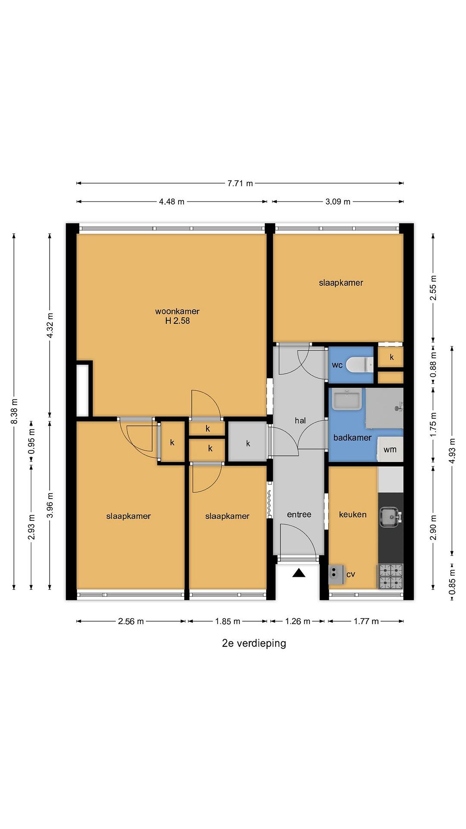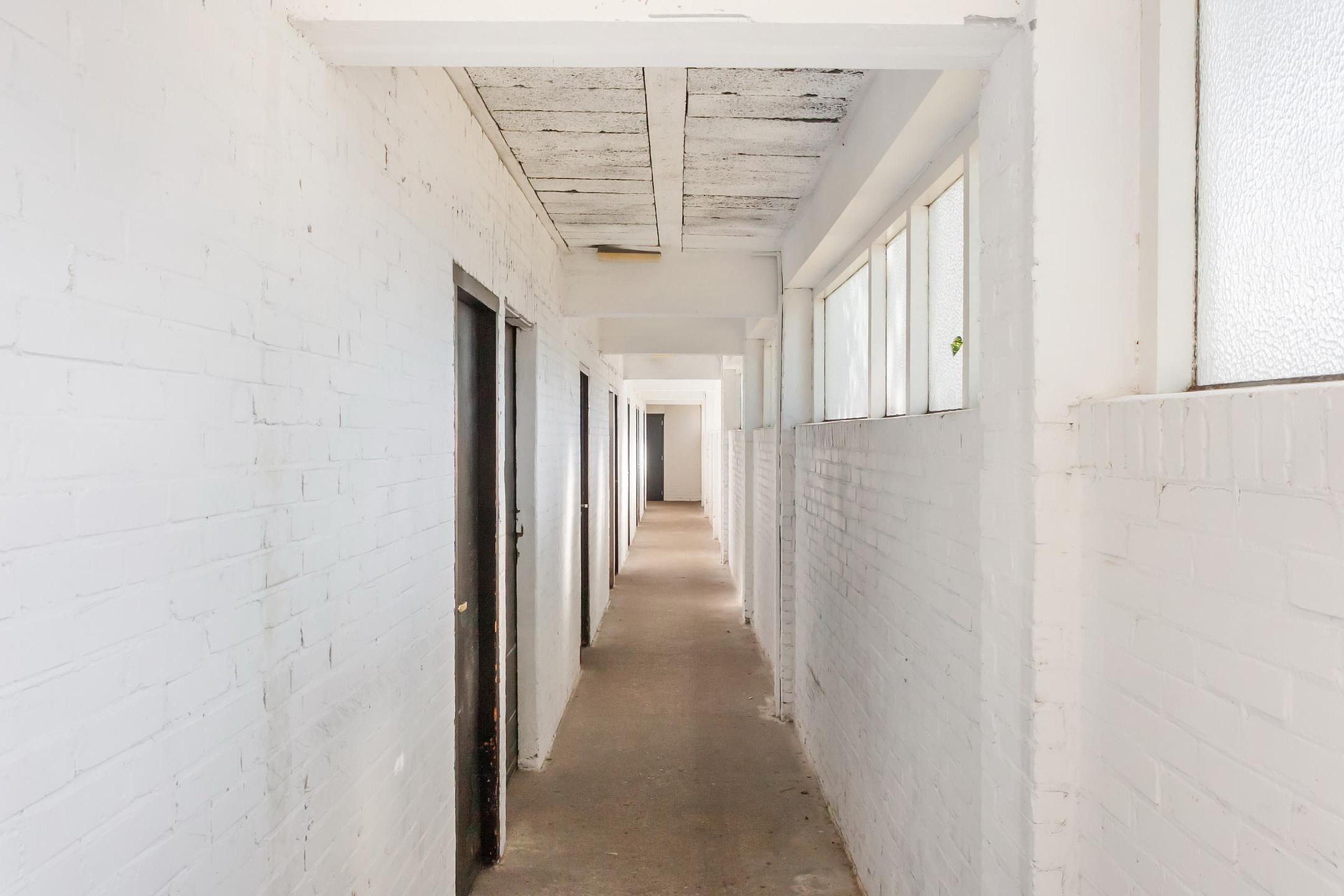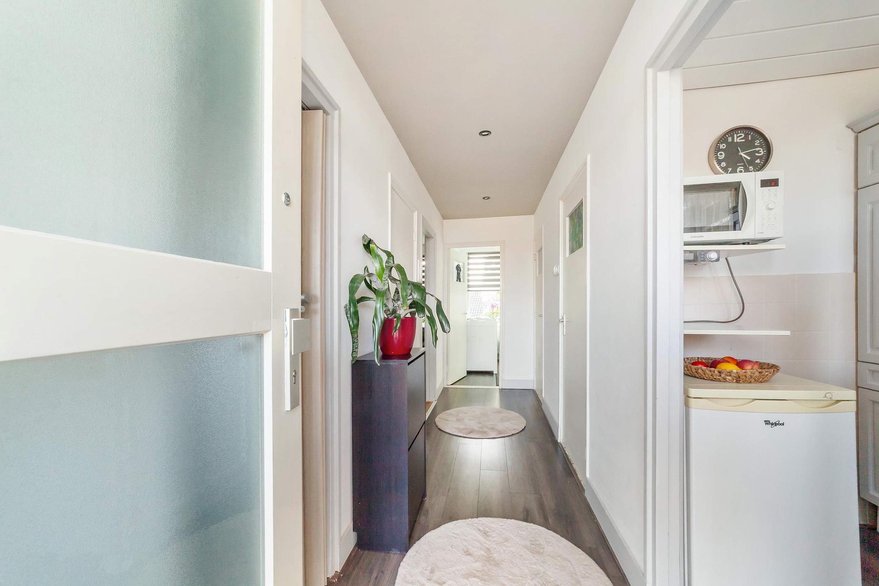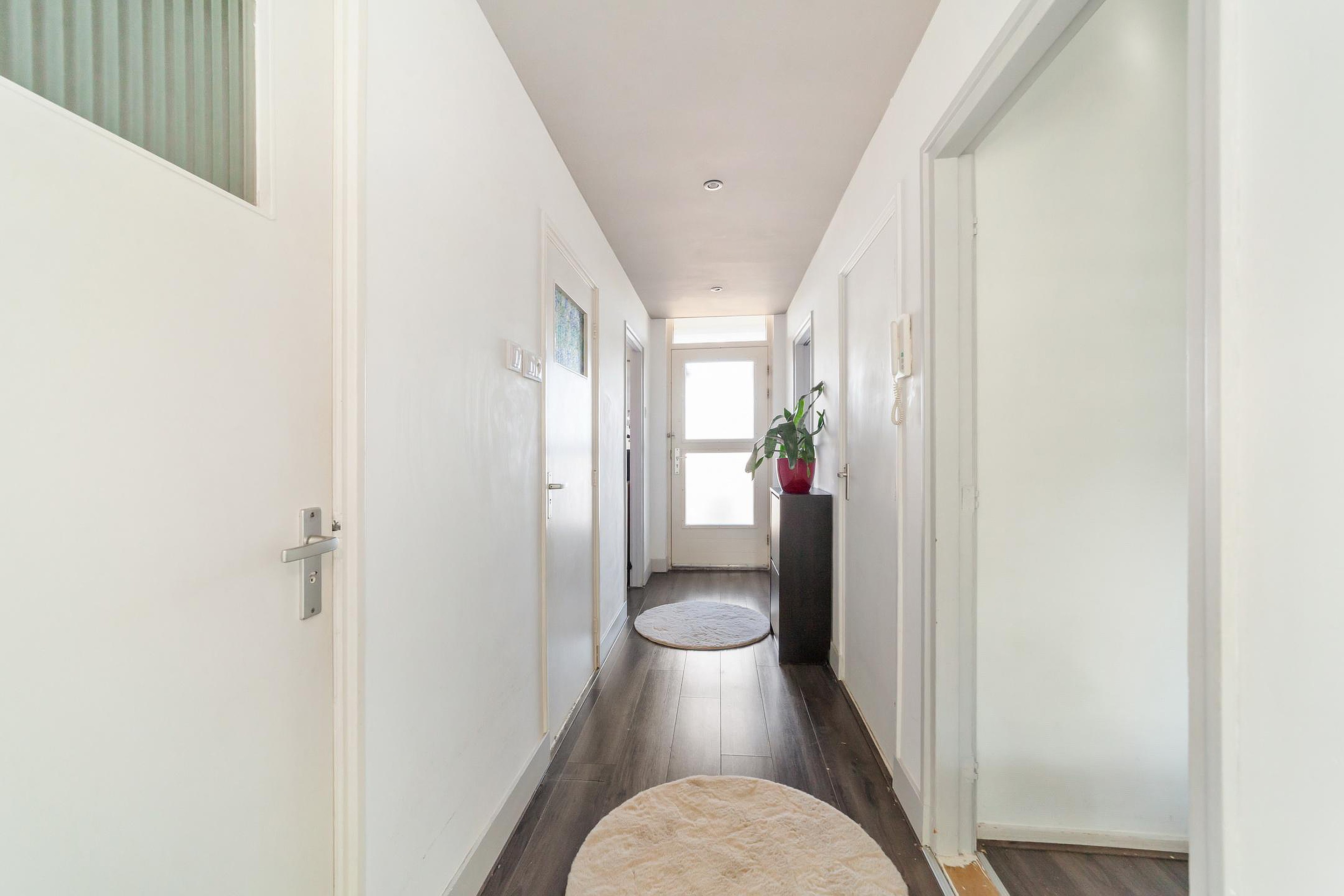 Entree in lange hal met toegang tot keuken, badkamer, toilet, en 2 slaapkamers. De derde slaapkamer is bereikbaar vanuit de woonkamer.