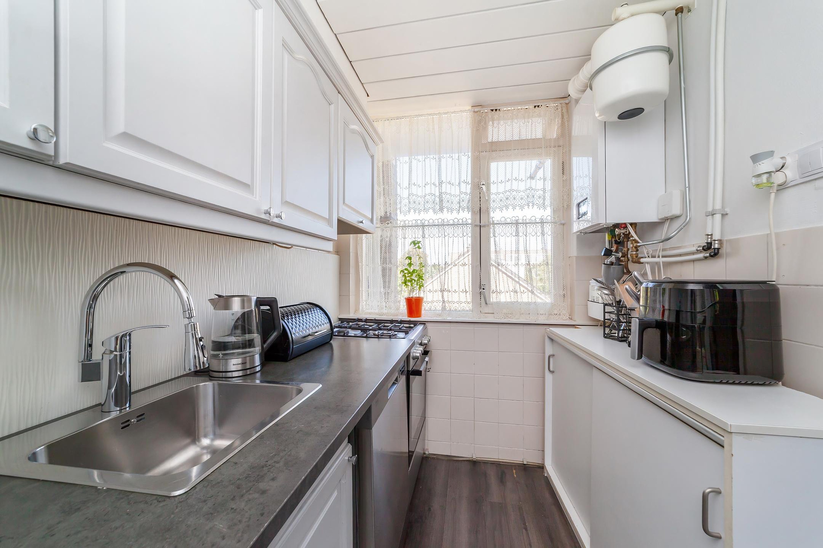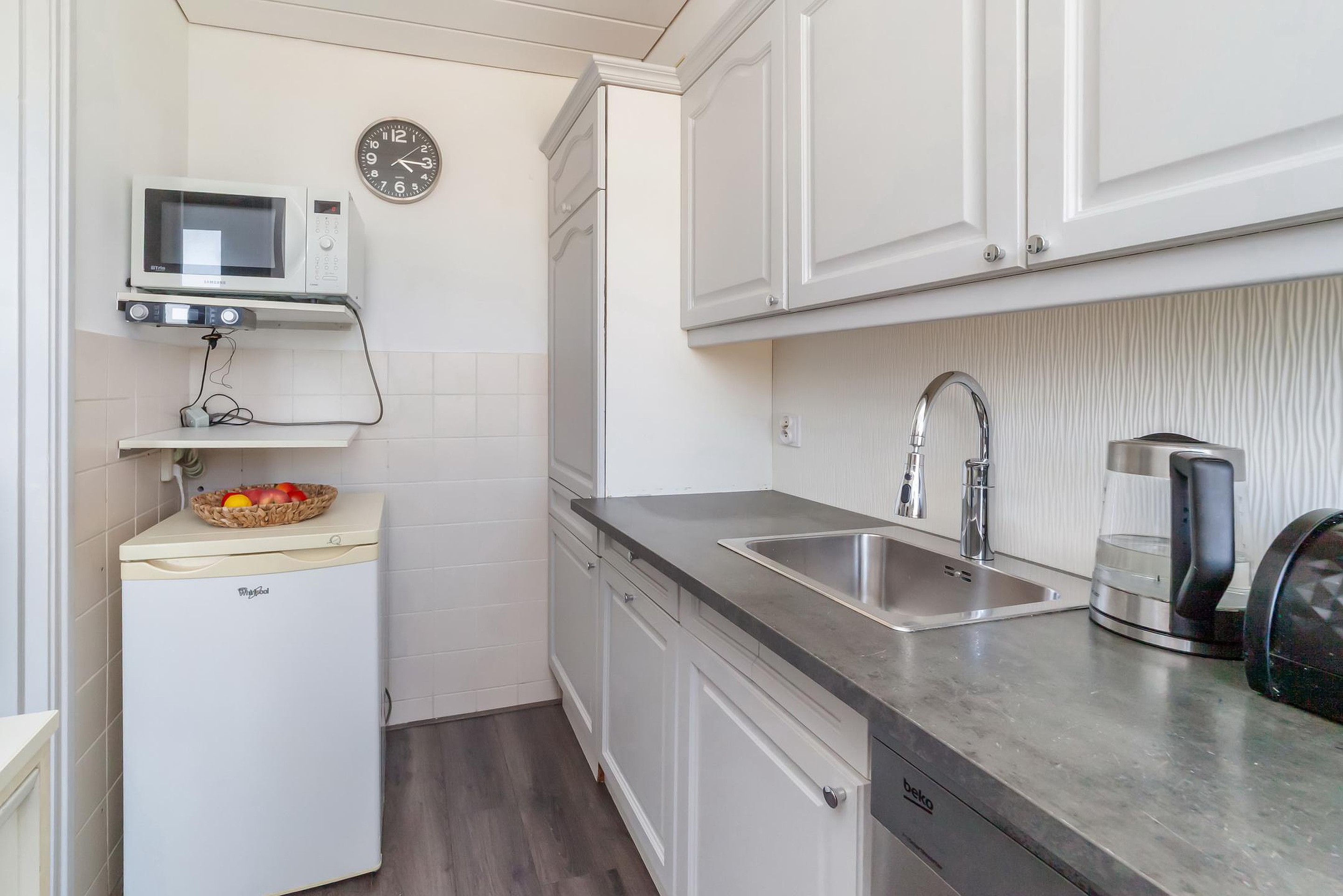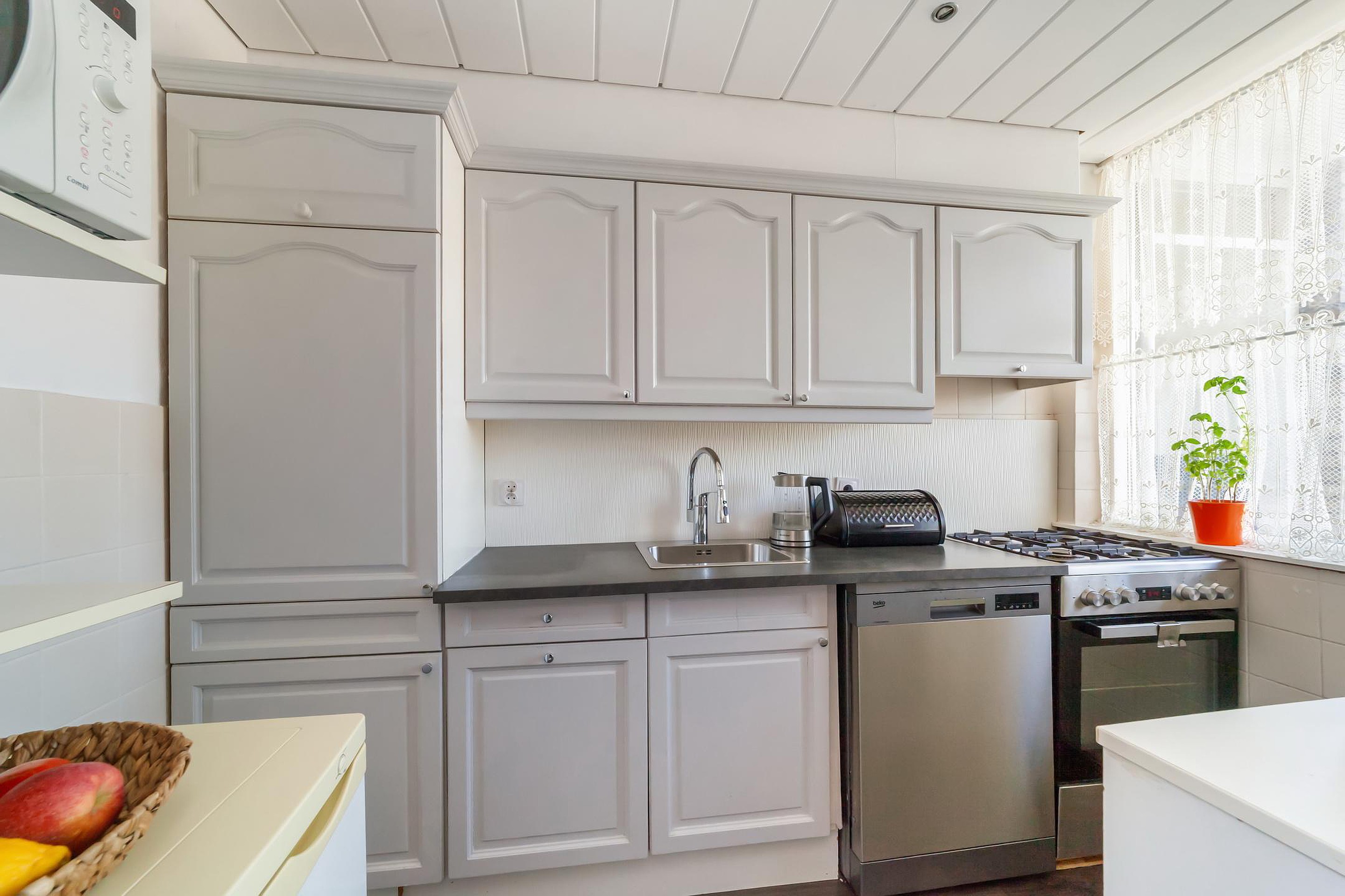 In de eenvoudige keuken vind je een losse vaatwasser, koelkast en gasfornuis met 4-pits kookplaat. De (huur) Cv-ketel is hier geplaatst.