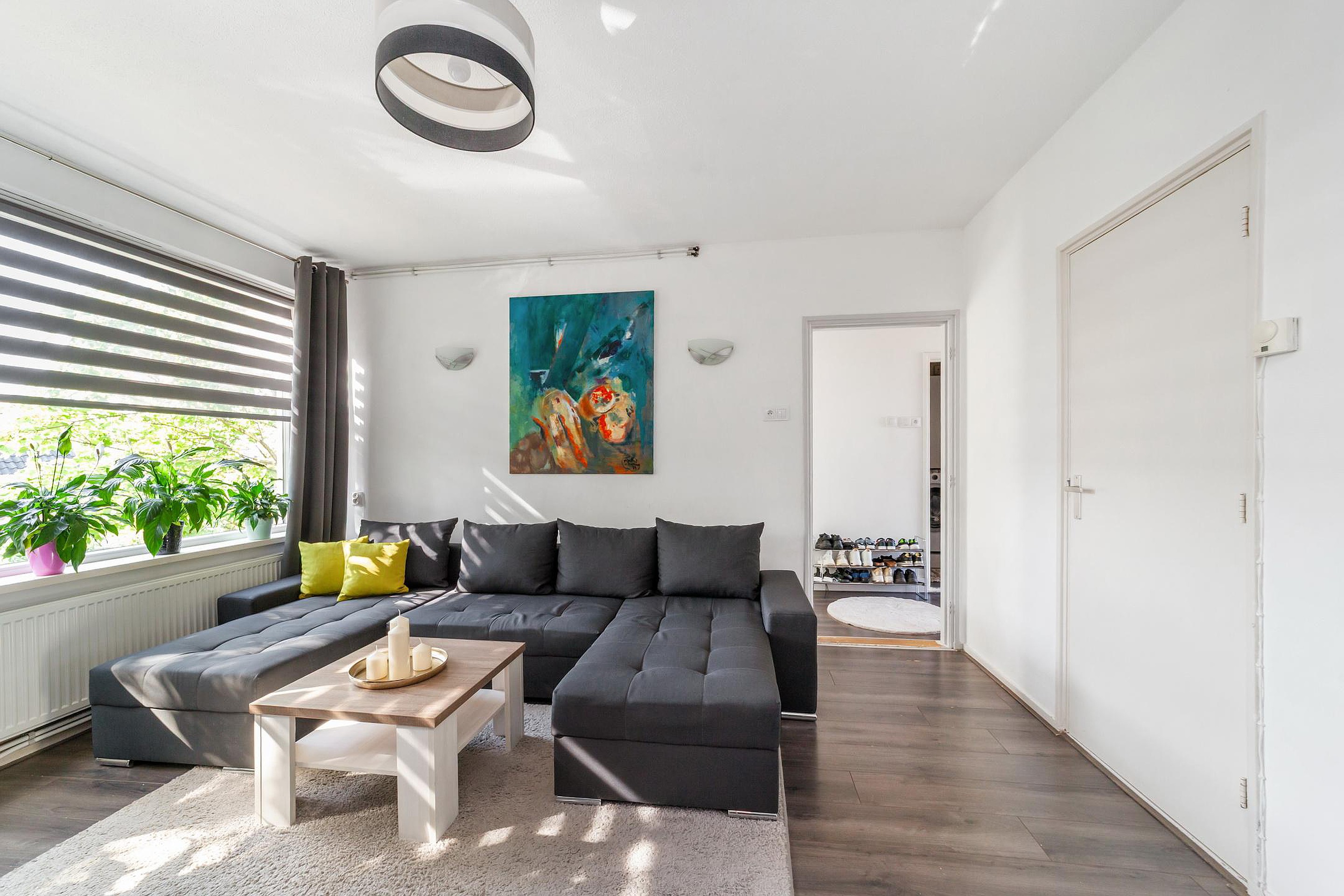 Lichte woonkamer met zicht op de groene omgeving.