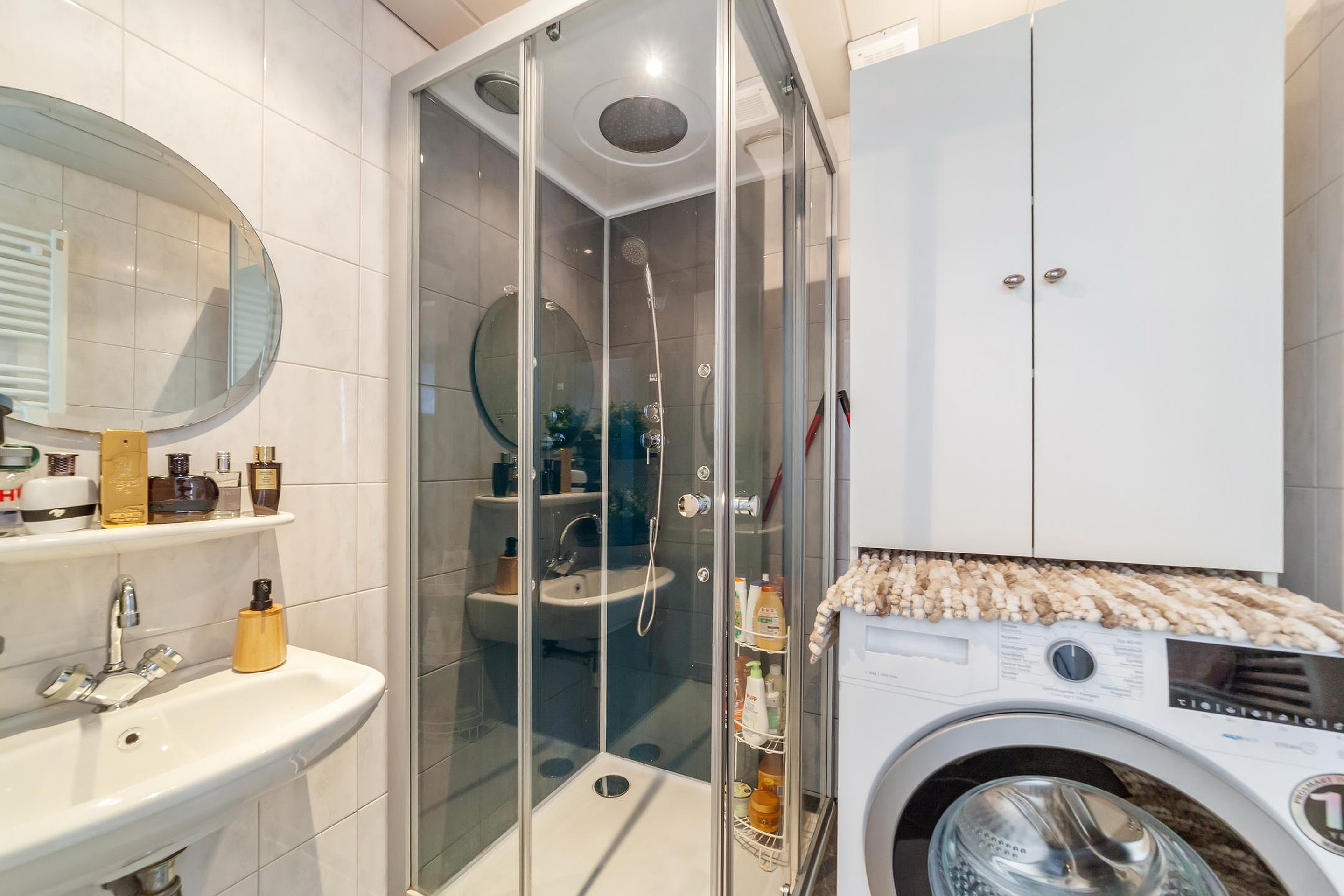 Badkamer met douchecabine, wastafel en opstelplaats wasmachine.