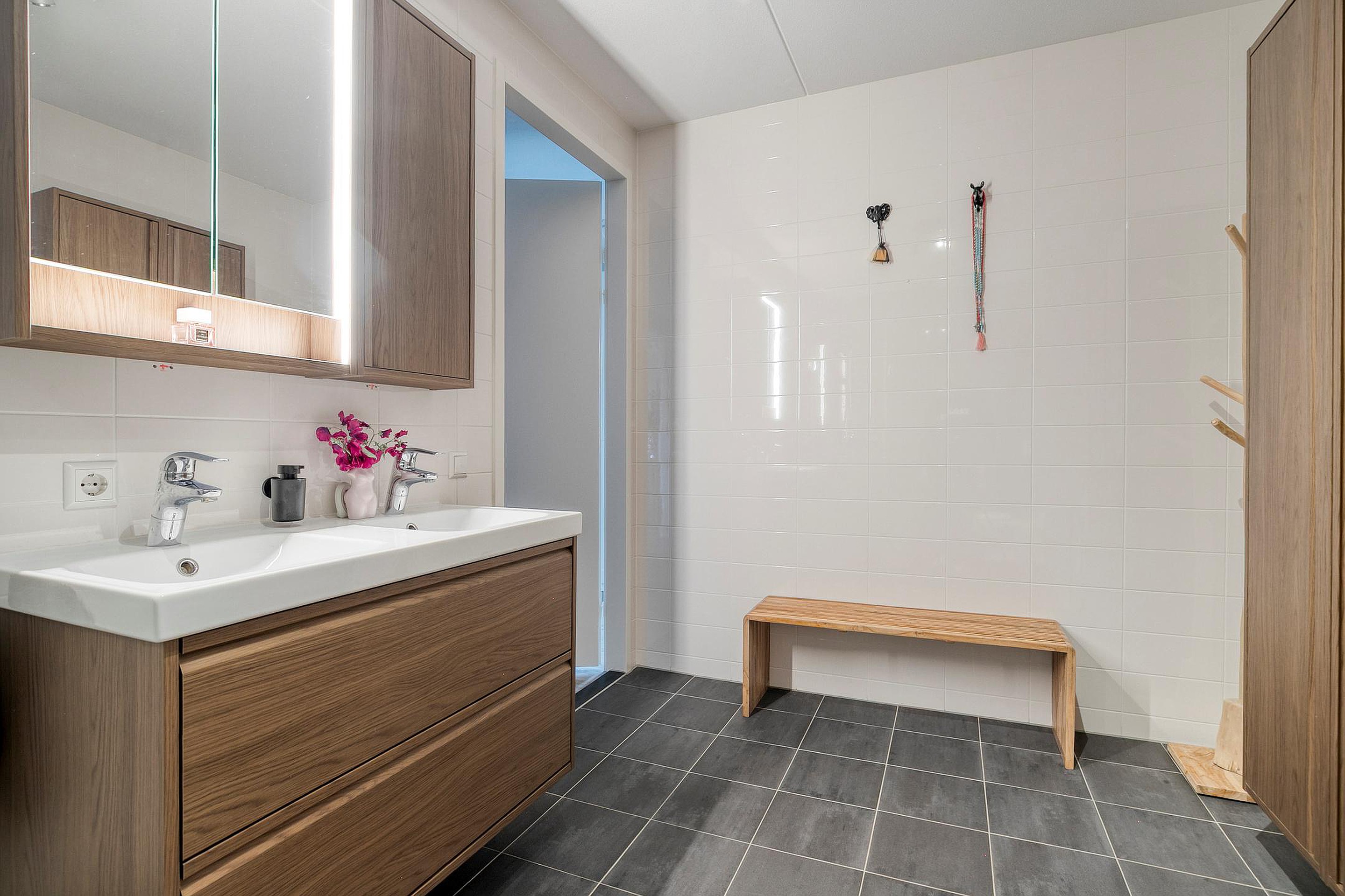 5e verdieping: royale centrale hal met gemeenschappelijke ruimte, entree woning, zeer ruime hal, ruim toilet met een fonteintje, royale woonkamer met een luxe open keuken, moderne badkamer met een inloopdouche, dubbel wastafelmeubel en 2de toilet, 2 ruime slaapkamers waarvan één toegang tot de royale loggia met een zithoek en prachtig uitzicht. Tevens is er een berging in de hal met een wasruimte, opstelplaats wasmachine/droger en warmtepomp.
