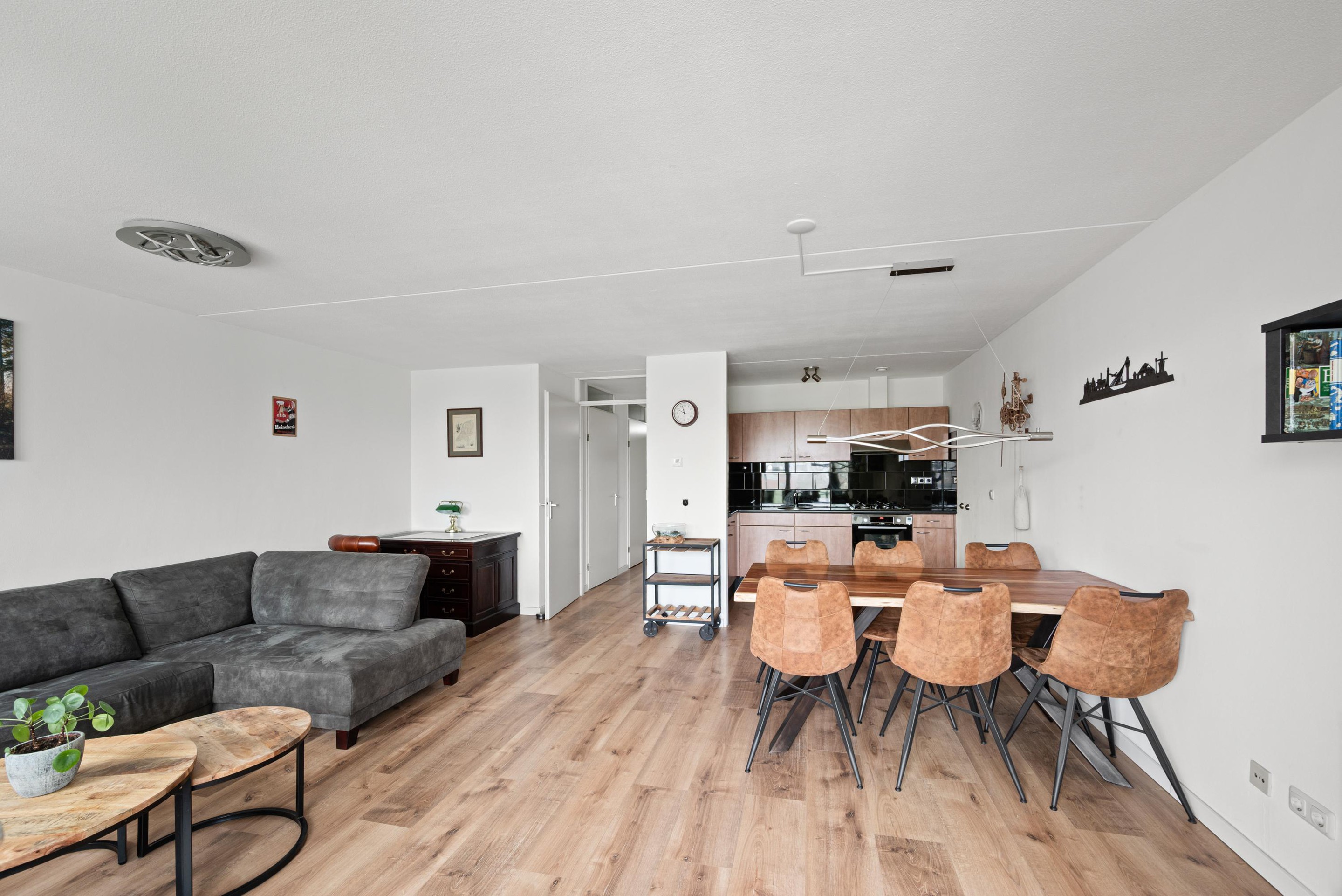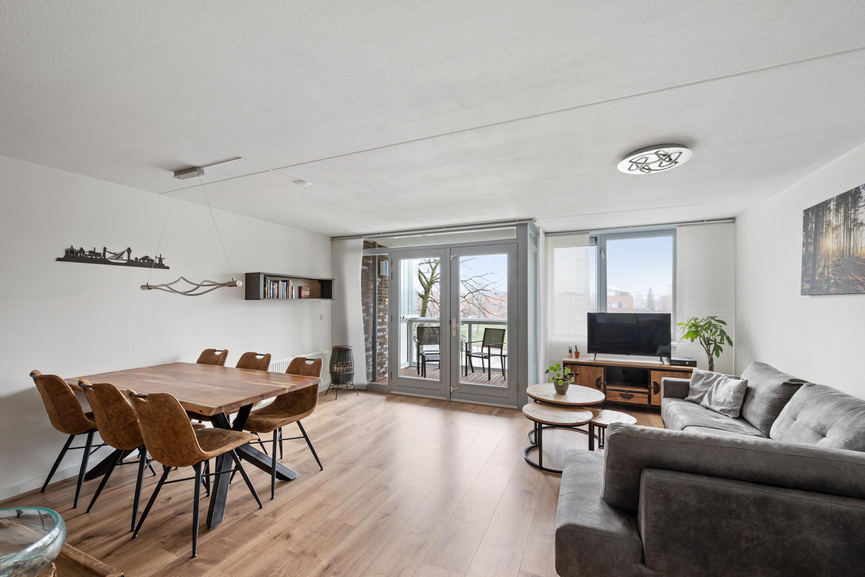 Ruime woonkamer met open keuken en openslaande deuren naar het balkon.