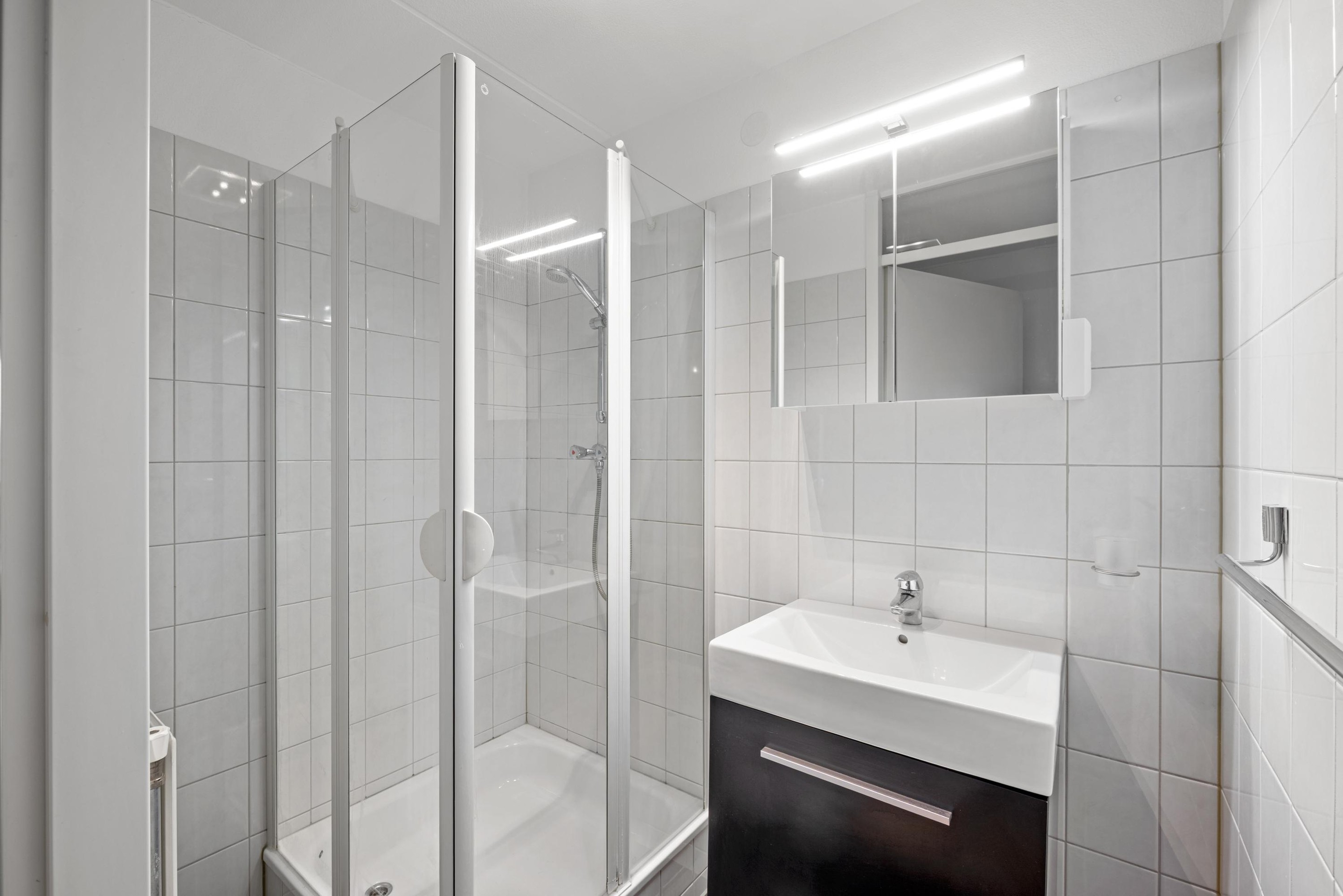 De badkamer is volledig betegeld en voorzien van een douchecabine, radiator en wastafelmeubel met spiegel en verlichting.