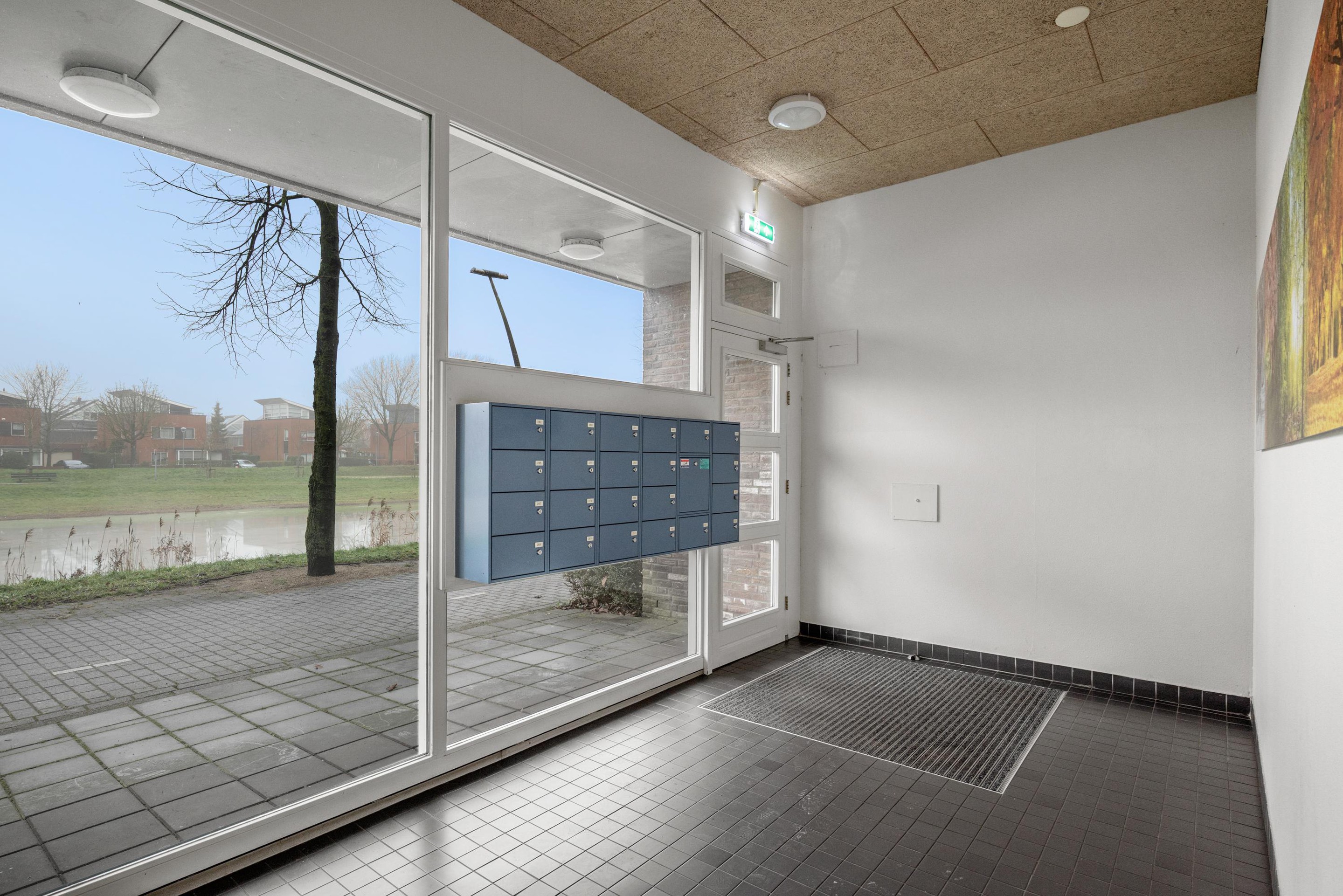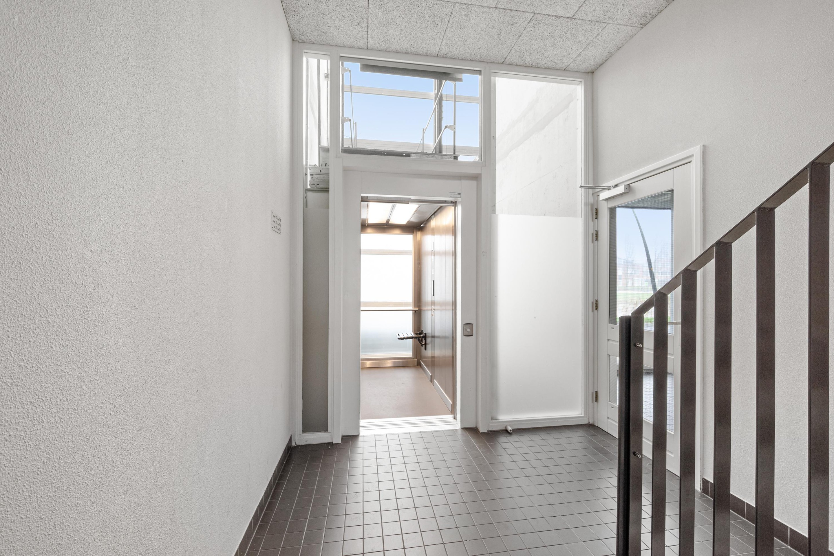 Afgesloten portiek met intercom, brievenbussen, trap en lift naar etages.