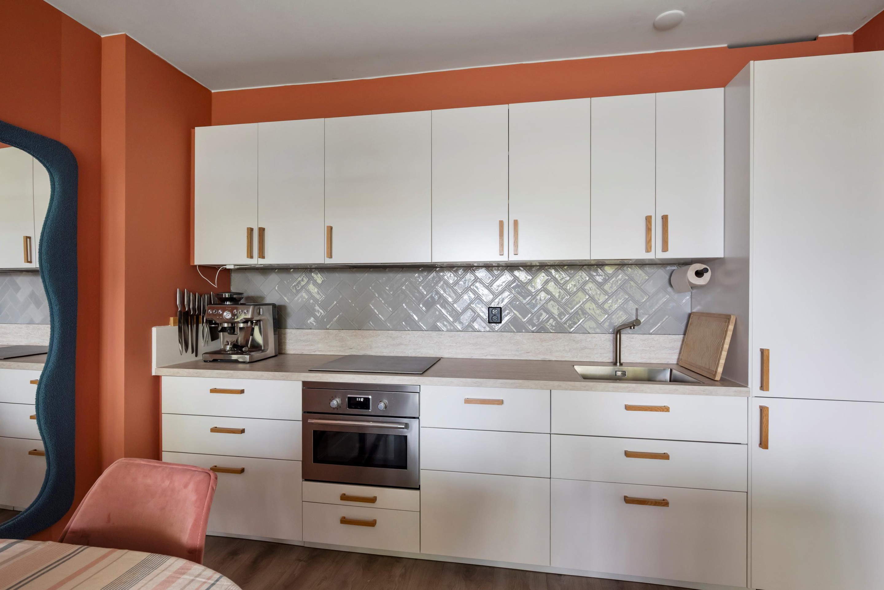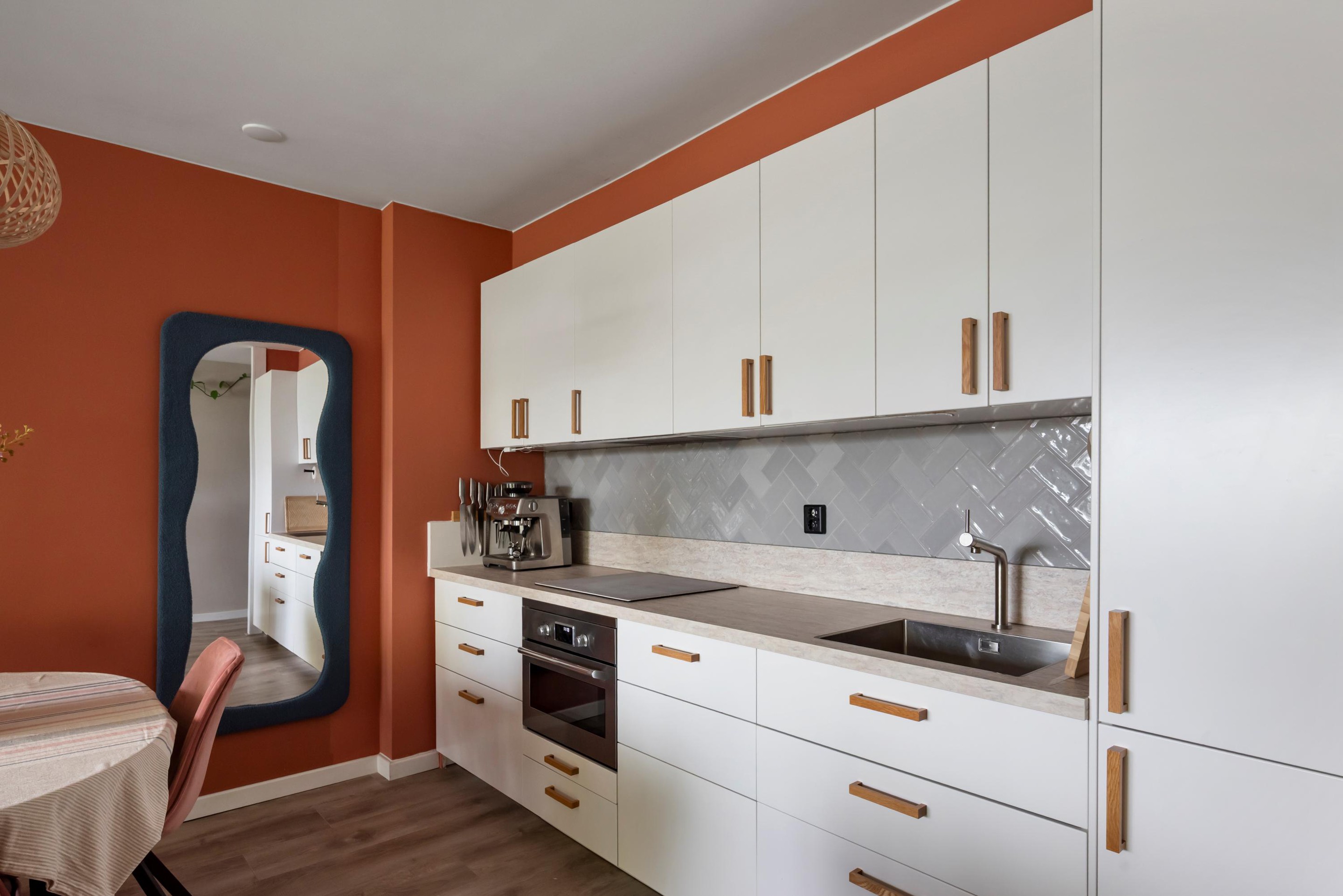Het hart van de woning is de lichte woonkamer. Door de grote raampartijen veel daglicht en kijk je prachtig weg over de fontein in de vijver. Er is op het balkon genoeg plek om ruim te kunnen zitten. De open keuken is geschikt voor elke kookliefhebber, voorzien van moderne inbouwapparatuur (vaatwasser, koelkast, oven en inductiekookplaat).